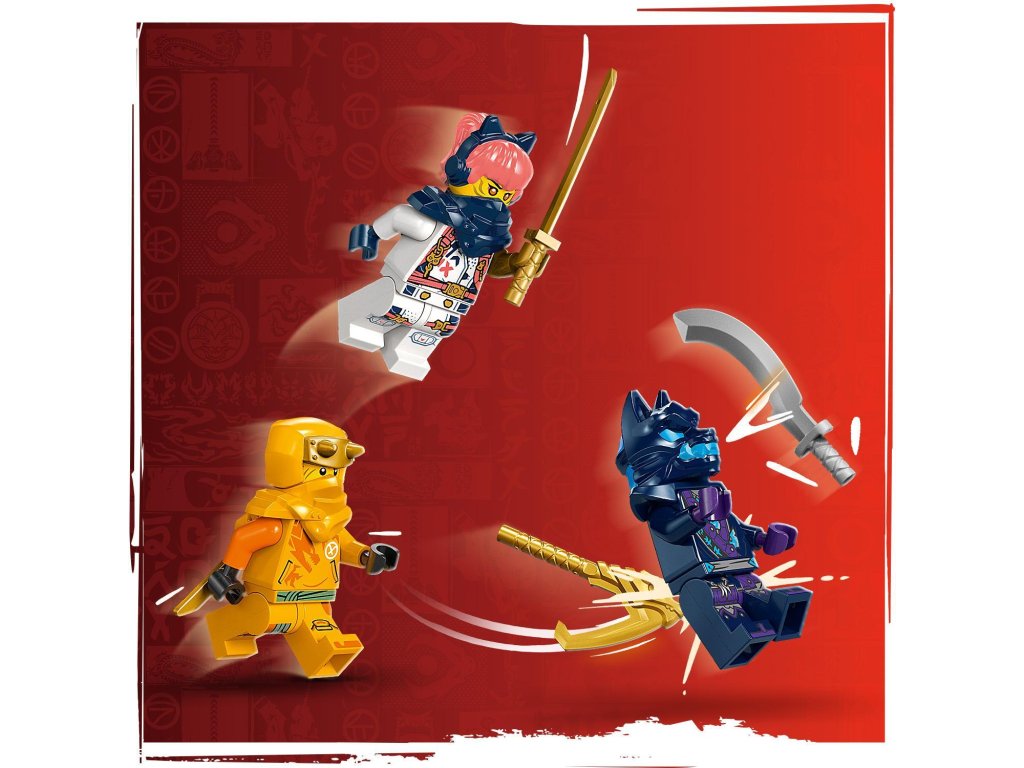 Součástí této nindžovské stavebnice jsou 3 minifigurky: Arin s lezeckým hákem a katanou, Sora s katanou a zlý válečník s vlčí maskou s mečem. Děti tak budou mít vše, co potřebují k tomu, aby se staly nindžovskými bojovníky a hrály si na akční bitvy.