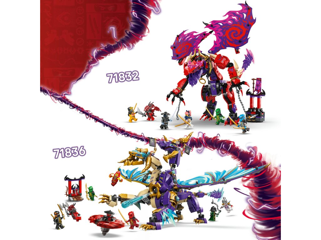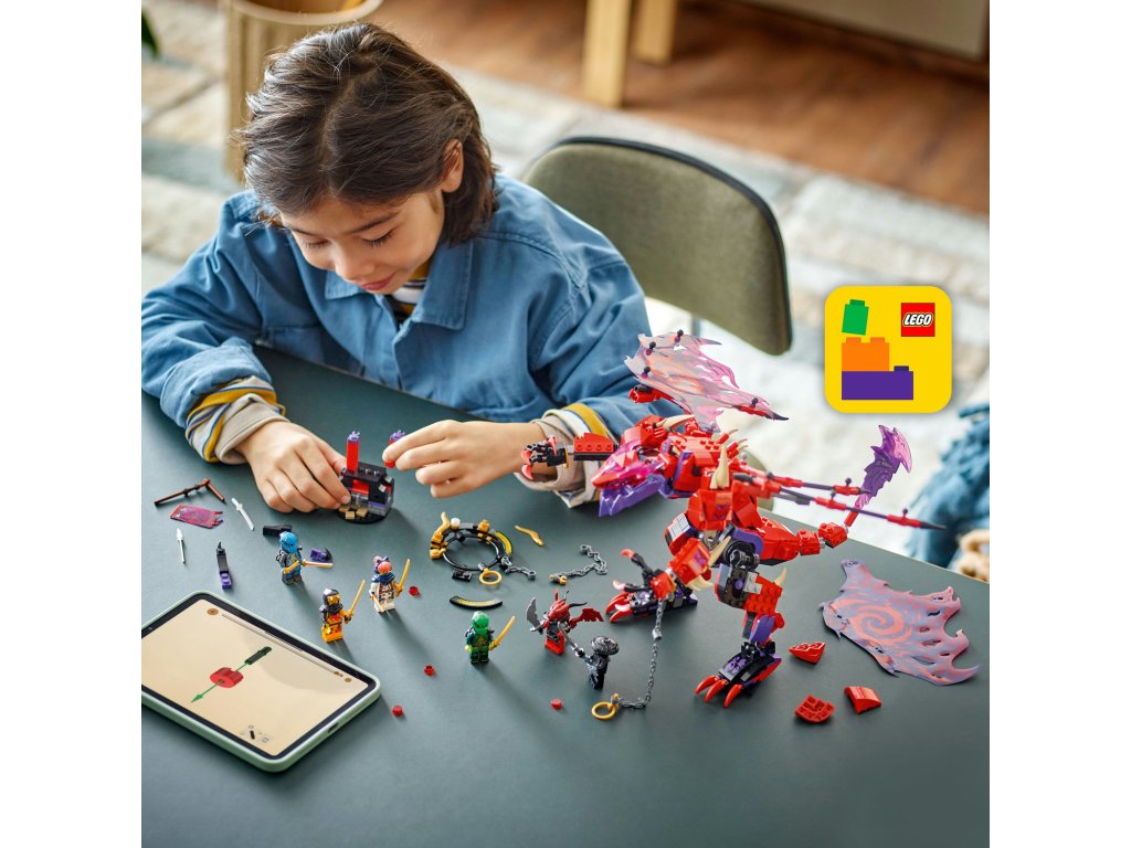 S nindžovskou stavebnicí LEGO® NINJAGO® (71832) Drak chaosu Thunderfang si kluci a holky od 8 let připomenou napínavé akční scény ze 3. řady televizního seriálu NINJAGO Dračí povstání. Tato stavebnice pro děti obsahuje velkého draka s pohyblivým ocasem, nohama, křídly, chodidly, hlavou a čelistí a vystřelovačem pod každým křídlem. Figurka draka je připoutaná k malému modelu a lze ji dostat na svobodu pomocí 2 prizmatických čepelí. Tato stavebnice LEGO obsahuje 6 minifigurek NINJAGO: Nindža válečníky Lloyda, Nyu, Arina a Soru, kteří mají nindžovské zbraně, a padouchy Nokta a vůdce dračích stvoření Tyra, kteří mají vlastní zbraně, aby si děti mohly zinscenovat napínavé bitvy dobra proti zlu. Stavebnice a sestavitelné akční hračky z řady LEGO NINJAGO (prodávají se samostatně) obsahují robotické obleky, draky, vozidla a chrámy a fanoušci si s nimi užijí hodiny hraní na boj dobra proti zlu. Aplikace LEGO Builder vám a vašemu dítěti ukáže snadnou a intuitivní cestu stavitelským dobrodružstvím.
