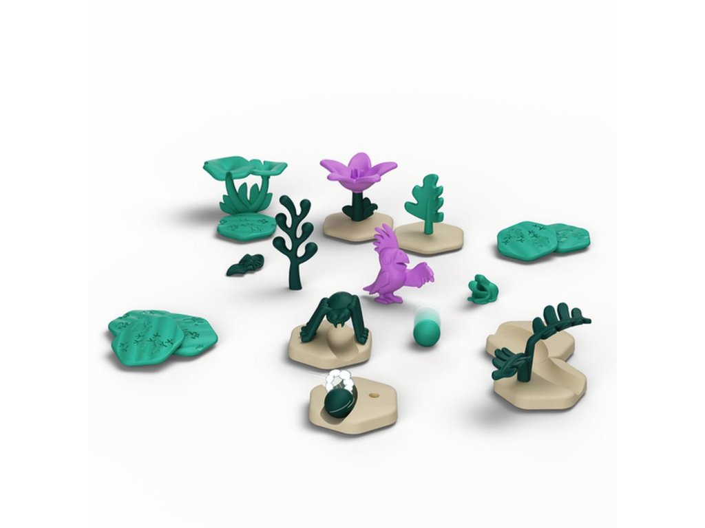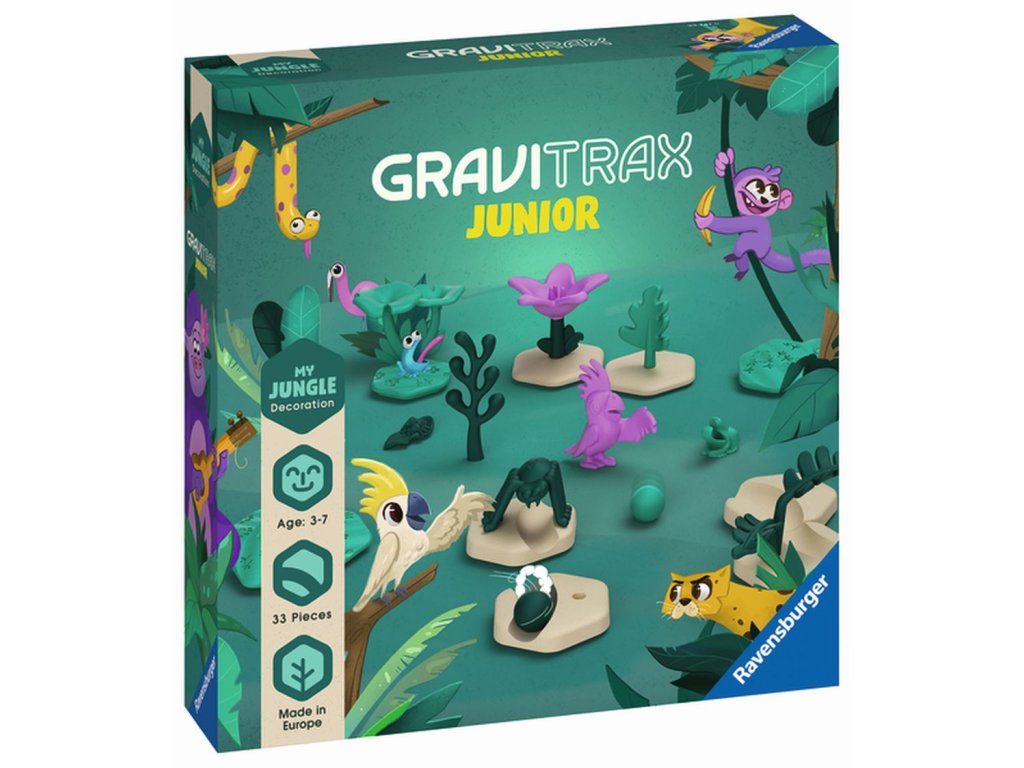 GraviTrax Junior je interaktivní systém kuličkové dráhy pro děti od 3 let. Ti nejmenší si staví své vlastní světy z kuličkových drah, které lze podle libosti zdobit a vytvářet tak jednotlivé tematické světy. Děti si tak při kreativním stavění užijí mnoho zábavy. Rozšíření Džungle obsahuje různé dekorační prvky a figurky zvířátek a rostlin z prostředí džungle. Děti si tak sami mohou v rámci GraviTrax dráhy prozkoumat toto prostředí a začít dobrodružství v džungli. Všechny stavební a dekorační součásti jsou vyrobeny z dřevěného bioplastu. Rozšíření obsahuje 33 stavebních a dekoračních prvků.