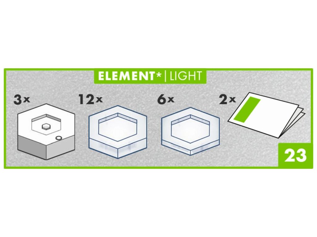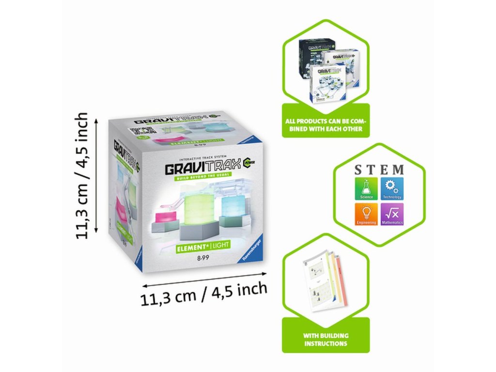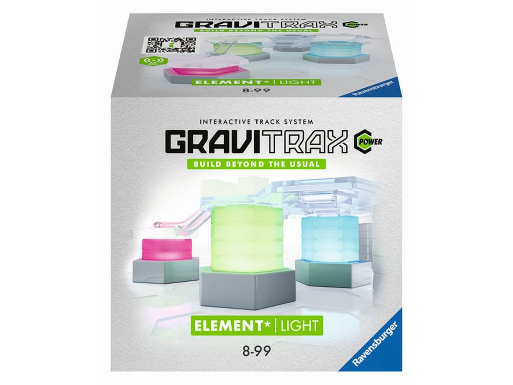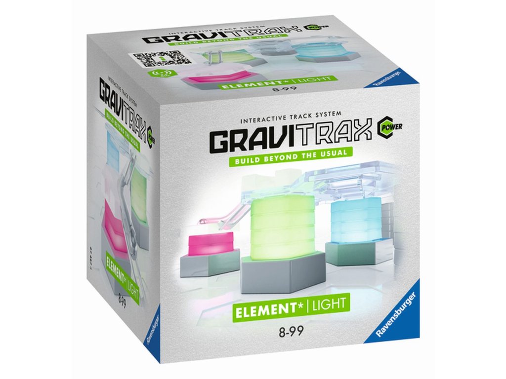 Parádní světelné efekty pro každou dráhu GraviTrax: s GraviTrax POWER Světelným prvkem to není problém! Celkem 3 světelné sloupce v kombinaci s transparentně strukturovanými výškovými kameny umožňují stavět světelné sloupy libovolně v různých výškách a zabudovat je do jakékoli dráhy GraviTrax. Hráč může navíc stisknutím tlačítka změnit barvu světla.