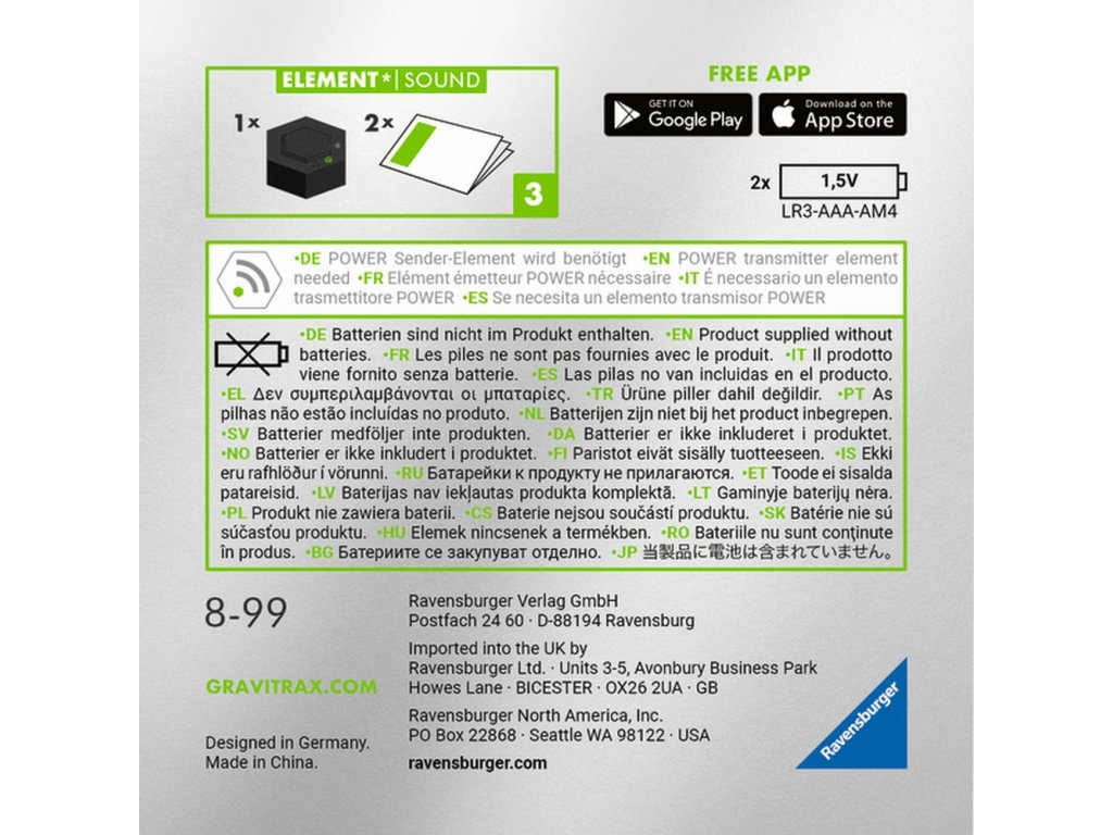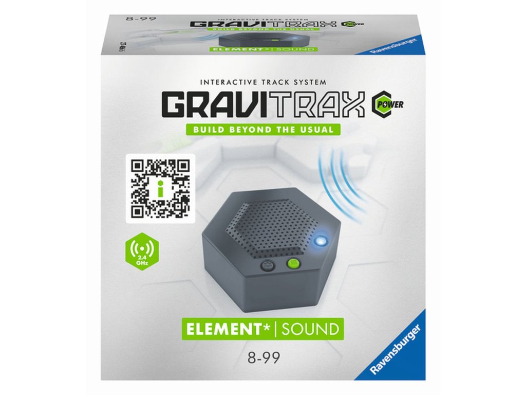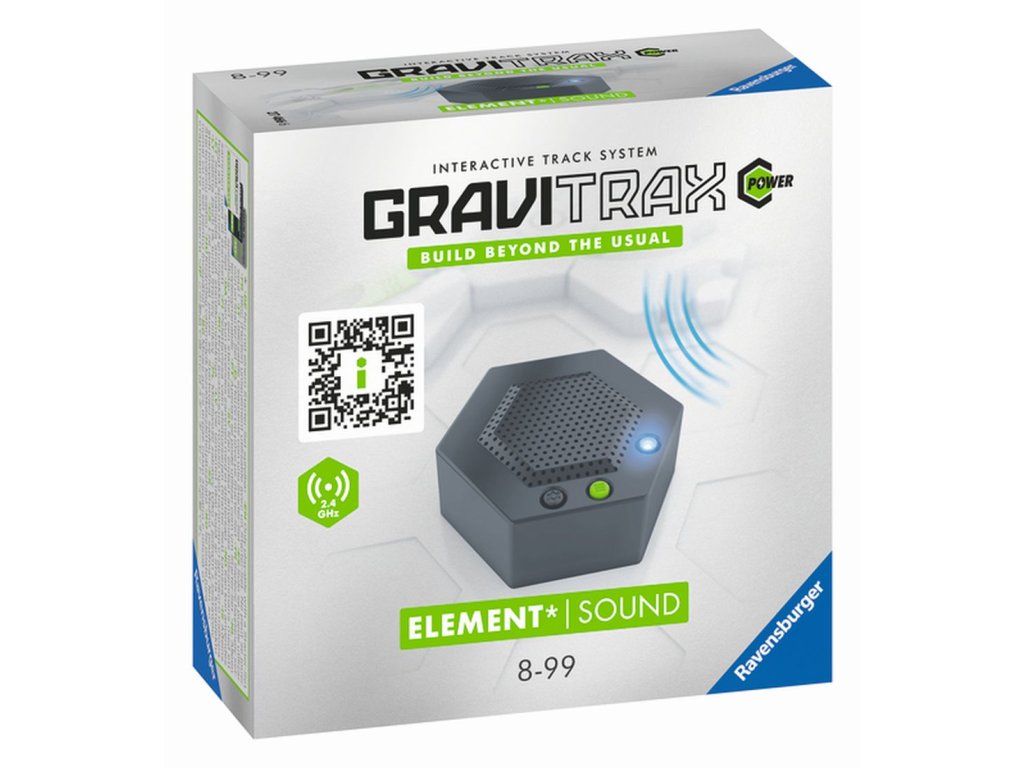 Se Zvukovým prvkem řady GraviTrax POWER lze do jakékoli dráhy GraviTrax integrovat skvělé zvukové efekty. Mezi všemi prvky GraviTrax POWER existují neviditelná spojení. Po přijetí signálu se spustí akční zvuk. Je možné přepínat mezi různými zvukovými světy. Kromě toho lze stisknutím tlačítka zvolit atmosférickou hudbu na pozadí. Budete potřebovat vysílací prvky GraviTrax POWER (nejsou součástí sady).