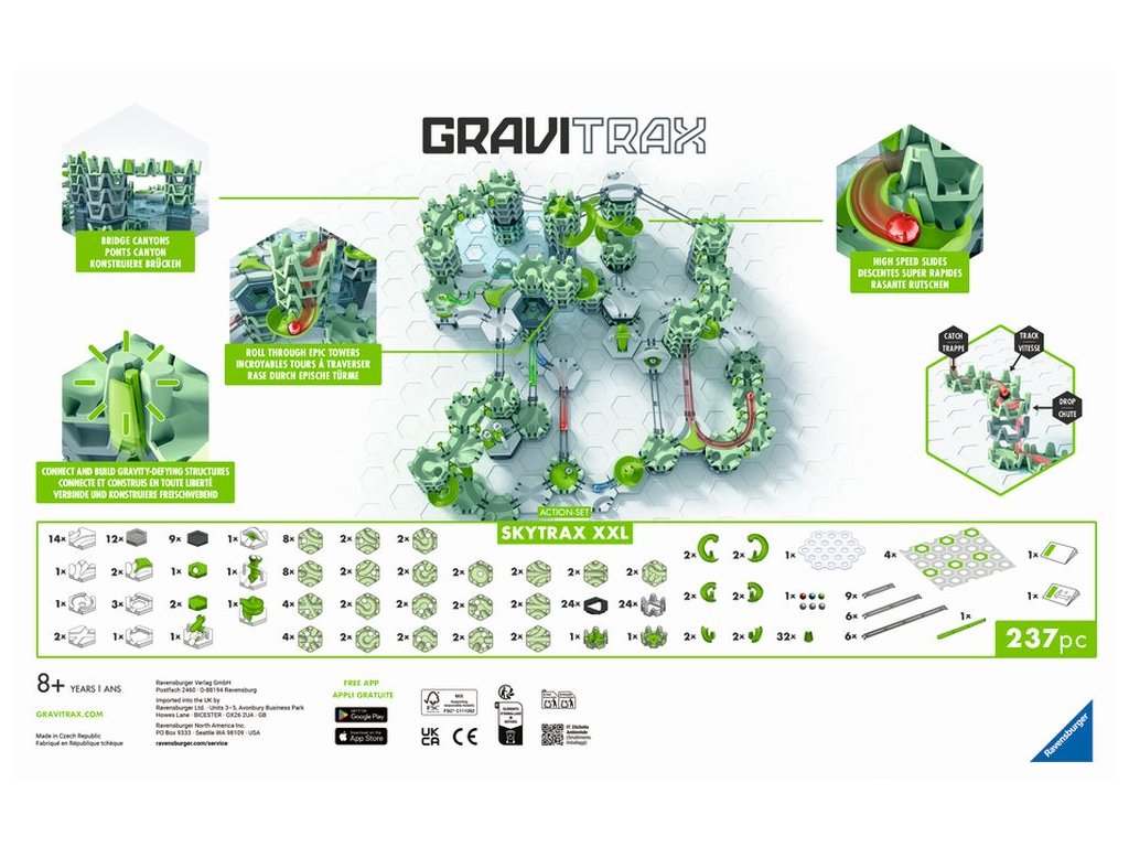 S touto sadou zažijete kreativní stavění jako nikdy předtím. Inovativní kameny Skytrax nabízejí zcela nové herní zážitky – nechte kuličky propadnout skrz, zachyťte je a propojte prvky do podoby mostů. Klouzavé dráhy roztočí kuličky kolem majestátních věží vysokou rychlostí. Tato velká sada je ideální pro všechny, kdo hledají dobrodružství plné triků a nekonečných možností při tvorbě kuličkových drah. Sada XXL obsahuje přes 215 různorodých prvků včetně plánu s ukázkovými dráhami. Mezi akčními prvky nebude chybět například lopatka, katapult, spirála, magnetické dělo nebo nové klouzavky.