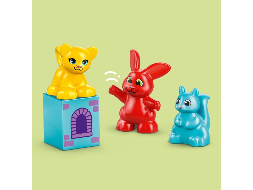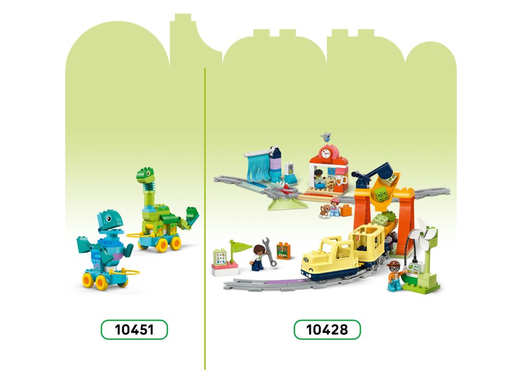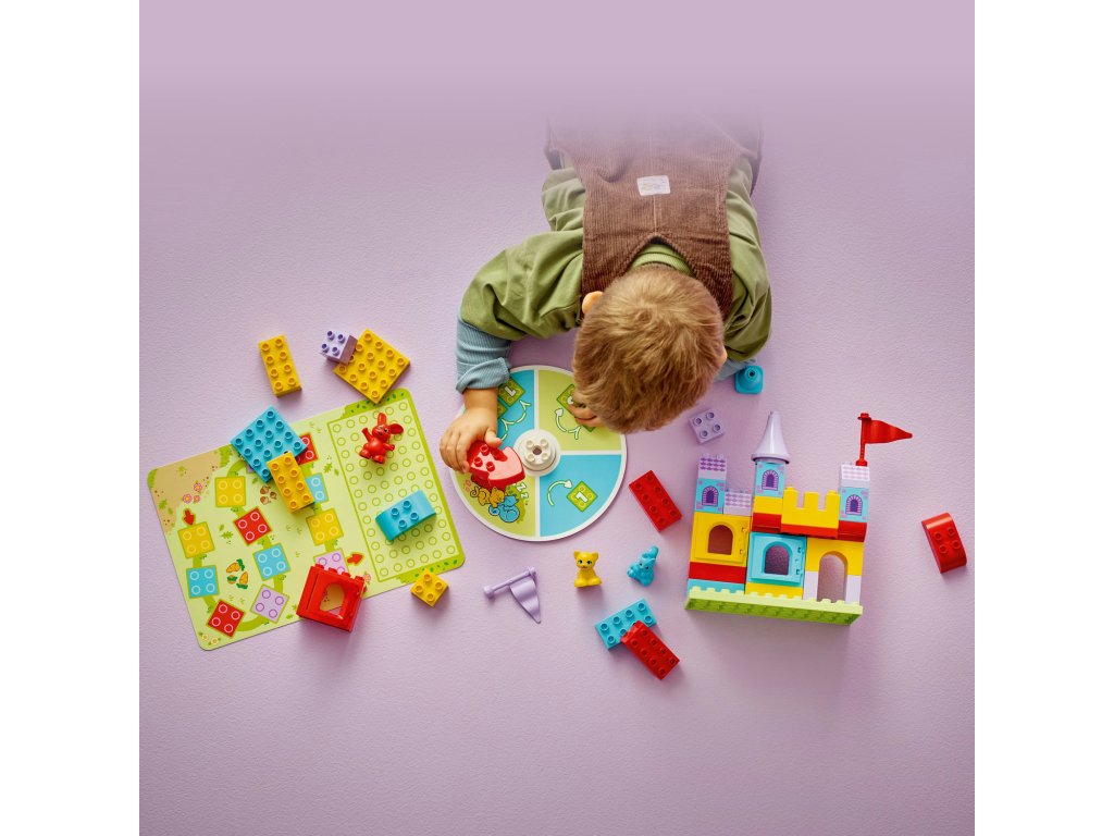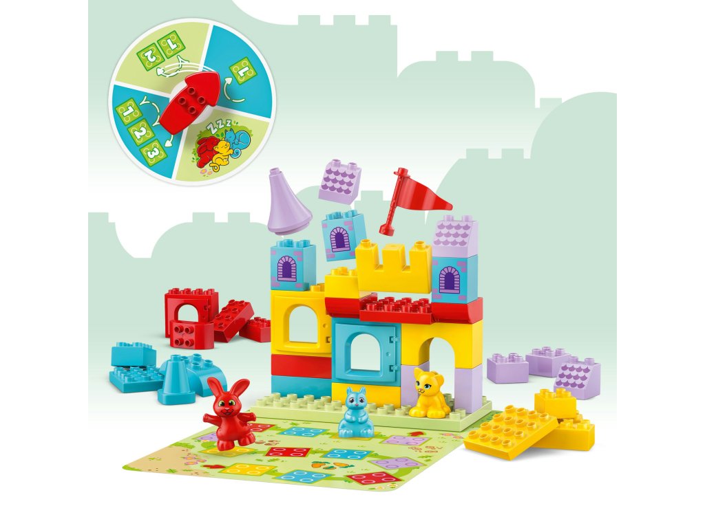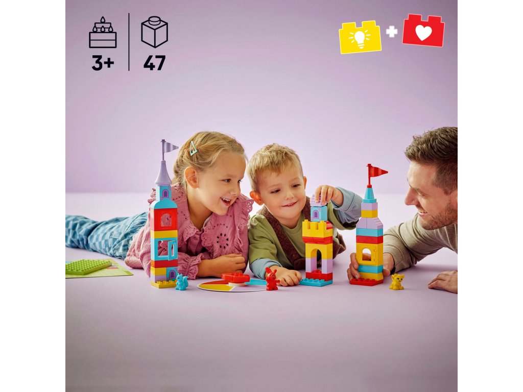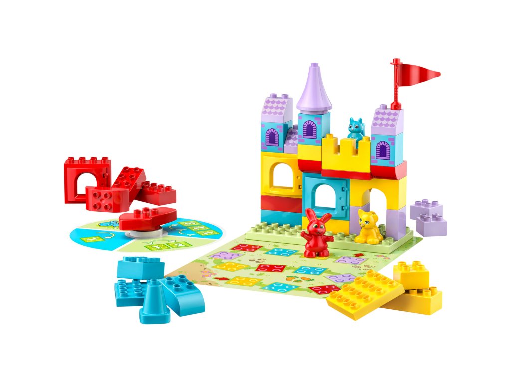 Užijte si se svou ratolestí hodiny rodinné zábavy a pomozte jí učit se hrou se stavebnicí 2 v 1 LEGO® DUPLO® (10450) Hopsy a hra s hradem. Děti se vydají na vzdělávací dobrodružství LEGO DUPLO a procvičí si počítání a třídění barev během hraní jedné ze dvou zábavných her. Děti se naučí poznávat barvy a čísla během kreativního stavění modelu hradu. Tato zábavná rodinná aktivita začíná tím, že si každý hráč vybere zvířátko a poté roztočí šipku, aby zjistil, o kolik míst na hrací ploše se může posunout. Do modelu pak přidá jednu kostku v té barvě, na které přistál. Hra končí, když všechny postavy dorazí na hrad. Ve druhé hře děti třídí barvy, aby zjistily, kdo dokáže postavit nejvyšší věž. Každý hráč roztočí šipku a zjistí, jakou barvu kostky může přidat do svého modelu. S touto vzdělávací stavebnicí si děti procvičí řadu dovedností, jako je střídání během hry, představivost a používání jemných motorických schopností během kreativního stavění nebo spolupráce s týmem během stavění hradu. Obsahuje 47 dílků.