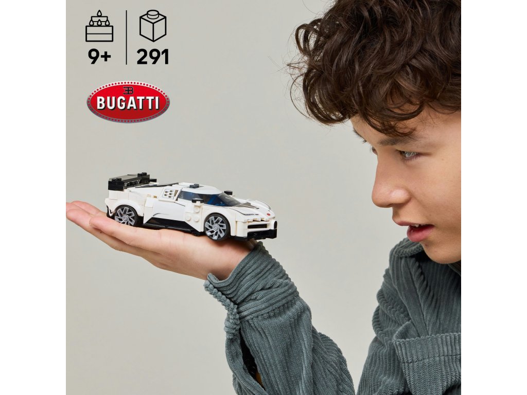 Model LEGO® vozu Bugatti obsahuje 5 kulatých otvorů sání na boku, jedinečné ráfky, světlomety, mřížku chladiče ve tvaru podkovy, převislé zadní křídlo a 4 zadní výfuky. Součástí této stavebnice auta LEGO je také minifigurka řidiče Bugatti, kterou děti usadí za volant a přehrají si s ní akční scénky.