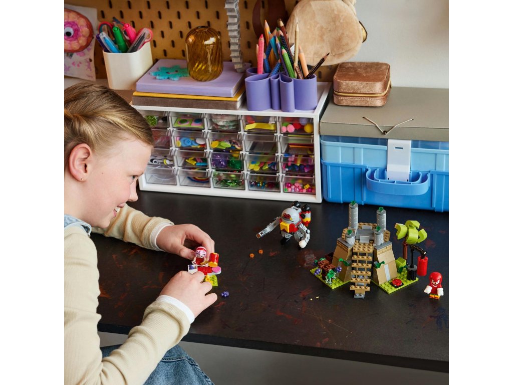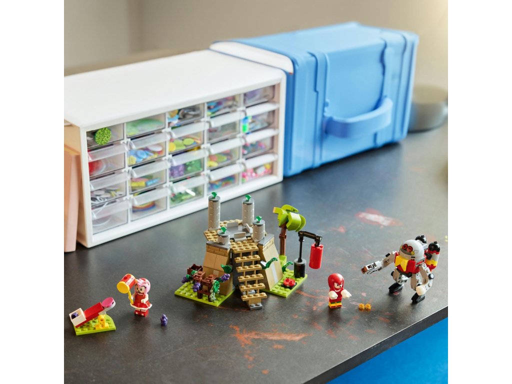 Hračka pro děti ze světa Sonica – Potěšte kluky, holky a fanoušky od 8 let stavebnicí Knuckles a chrám Master Emerald, která umožní dětem vytvářet příběhy s oblíbenými postavami ze světa Sonica. Sběratelská stavebnice LEGO® Sonic the Hedgehog™ obsahuje chrám se 4 Smaragdy chaosu, Knucklesovo obydlí pod chrámem s posilovnou, otočnou podlahou a vinnou révou, Amyino kladivo a katapult pro odpalování hroznů na Eggrobo. Tento zábavný herní dárek obsahuje 4 postavy: minifigurky Knucklese a Amy, pohyblivého Badnika Eggroba s jetpackem a vystřelovačem a Pickyho.