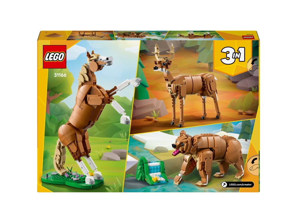 Děti čekají hned 3 různé možnosti stavění ze stejného balení kostek: Pohyblivý kůň LEGO®, pohyblivý medvěd s malým modelem vodopádu a pohyblivý elegantní srnec. Všechny 3 figurky zvířátek v této stavebnici na přestavování představují kreativní a zábavné dárky pro děti.