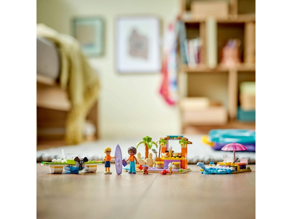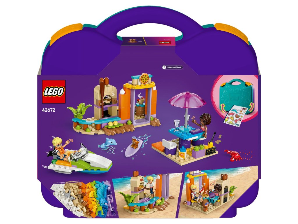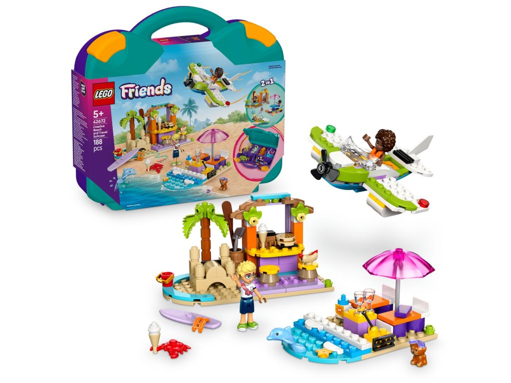S touto stavebnicí 2 v 1 se děti vydají na kreativní cestu při stavění a přestavování plážových scén. Stavebnice LEGO® Friends (42672) Kreativní plážový a cestovní kufřík představuje skvělý dárek pro holky a kluky od 5 let. Malí stavitelé si poskládají 3 modely a pak je přestaví a vytvoří alternativní scénu – nebo z dílků postaví vlastní nápadité výtvory. Tato stavebnice obsahuje vše, co děti potřebují k sestavení hydroplánu s otočnou vrtulí, odpočinkové zóny se surfovacím prknem a plážové kavárny s hrady z písku, posezením a zmrzlinou. Stavebnici lze přestavět na model motorového člunu, venkovní posezení a pizzerii s pecí na pizzu. Součástí stavebnice jsou 2 minipanenky a figurky psa a delfína, se kterými si užijete spoustu zábavného hraní. Po sestavení a přestavbě modelů můžete všechny dílky sbalit do kufříku a připravit se na další dobrodružství. Součástí stavebnice je arch se zábavnými samolepkami, takže si děti můžou kufr přizpůsobit podle sebe.