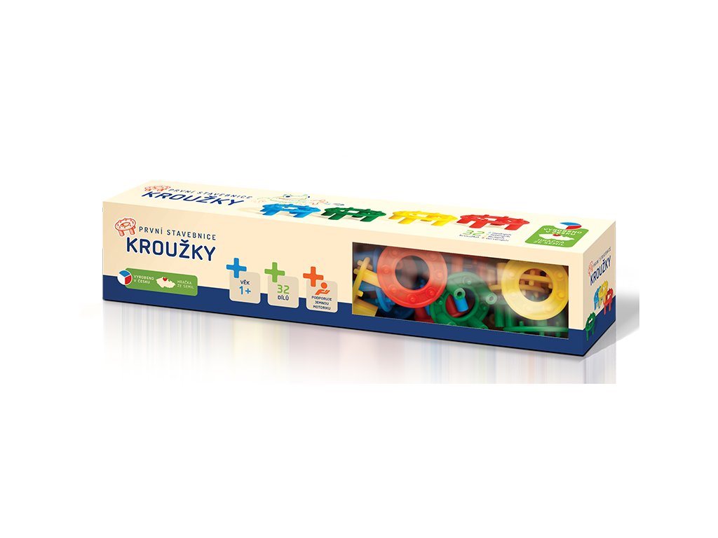 První stavebnice - Kroužky obsahuje 32 dílků – kroužků ve 4 barvách. Je vhodná již pro nejmenší děti od 1 roku. Pomáhá jim procvičovat cit v prstíkách a poznávat základní barvy.