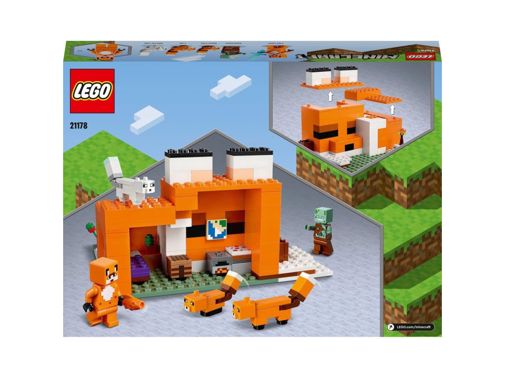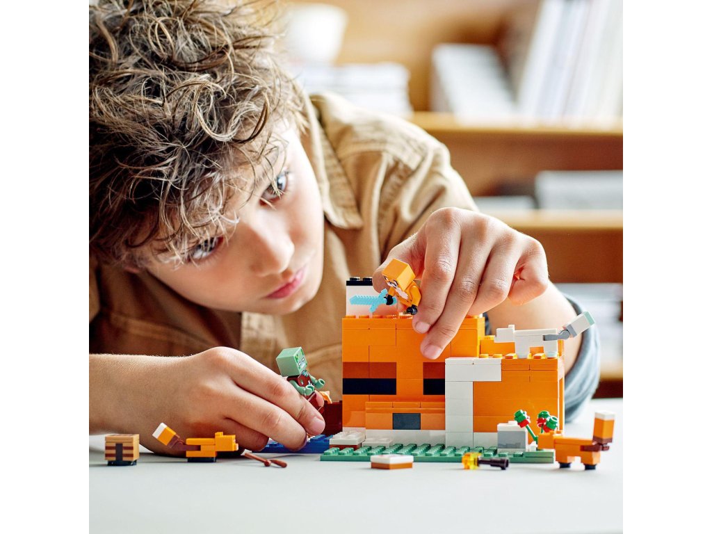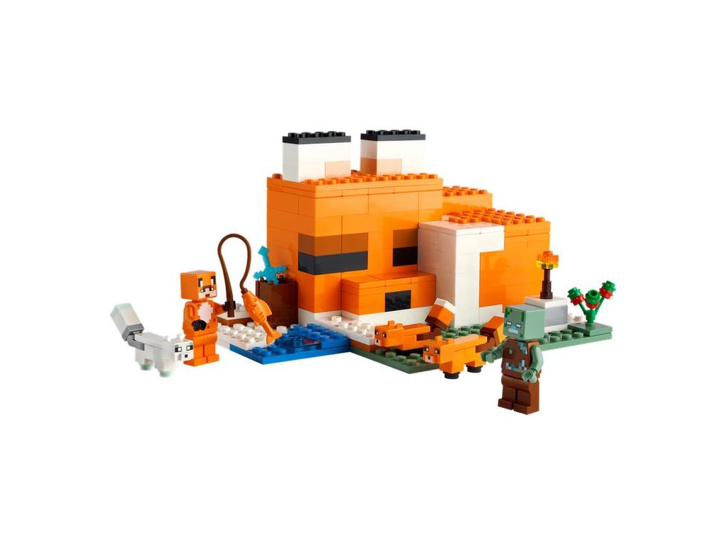 Děti mají možnost uplatnit své dovednosti ze světa Minecraft a postavit si domek ve tvaru spící lišky. Díky otevřené zadní straně a odnímatelné střeše lze velmi snadno uspořádat nábytek a hrát si ve vnitřním prostoru. Venku čeká liščí mládě, dospělá liška a polární liška, které děti mohou nakrmit lesními plody, než se zvířecí kamarádi uloží ke spánku. Zombie utopenec, oblíbená postava ze hry, způsobí pozdvižení. Děti se před ním musí ubránit mečem, aby zbraň následně mohly vyměnit za rybářský prut a nachytat si pár kousků.