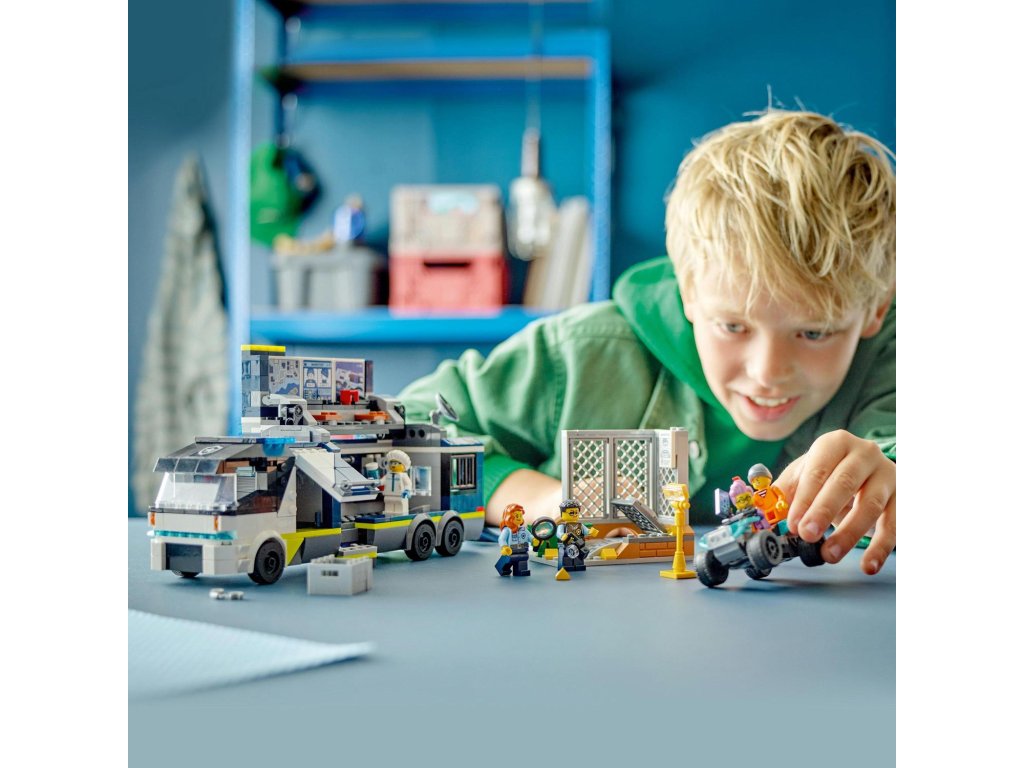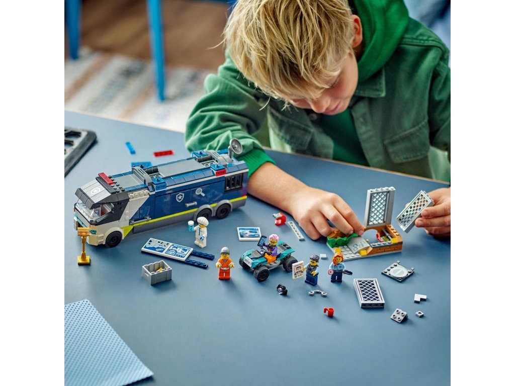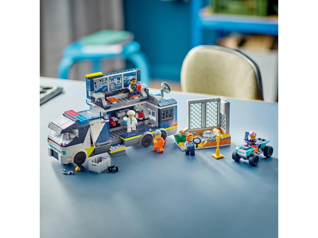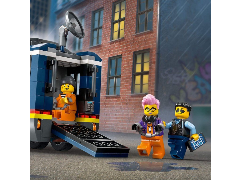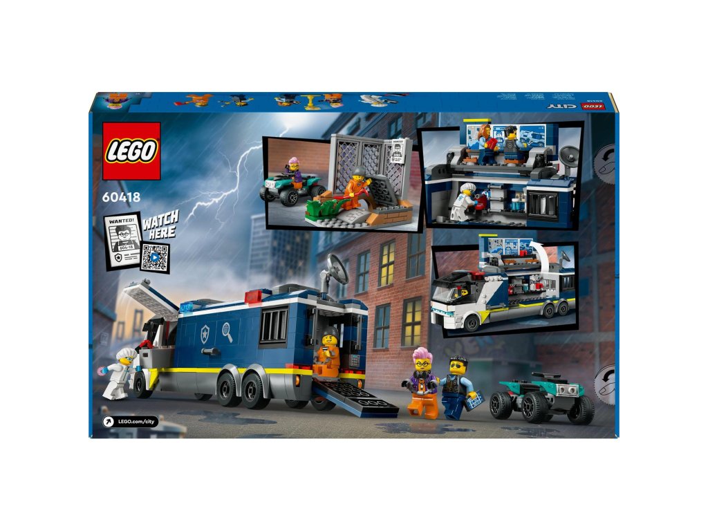 Vyšetřování stop, které za sebou zanechali zločinci na útěku, to je úkol pro policisty ve stavebnici 60418 LEGO® City Mobilní kriminalistická laboratoř policistů. Tato skvělá herní sada pro děti od 7 let obsahuje nákladní auto, které se otevře a odhalí dvouúrovňovou laboratoř pro zkoumání místa činu s pracovišti, mapou, monitory, mikroskopem, kávovarem a vězením. Součástí sady je také forenzní scéna a čtyřkolka zločinců. Pro vskutku epická dobrodružství stačí přidat minifigurky 2 policistů, 1 vědce a 2 zločinců.