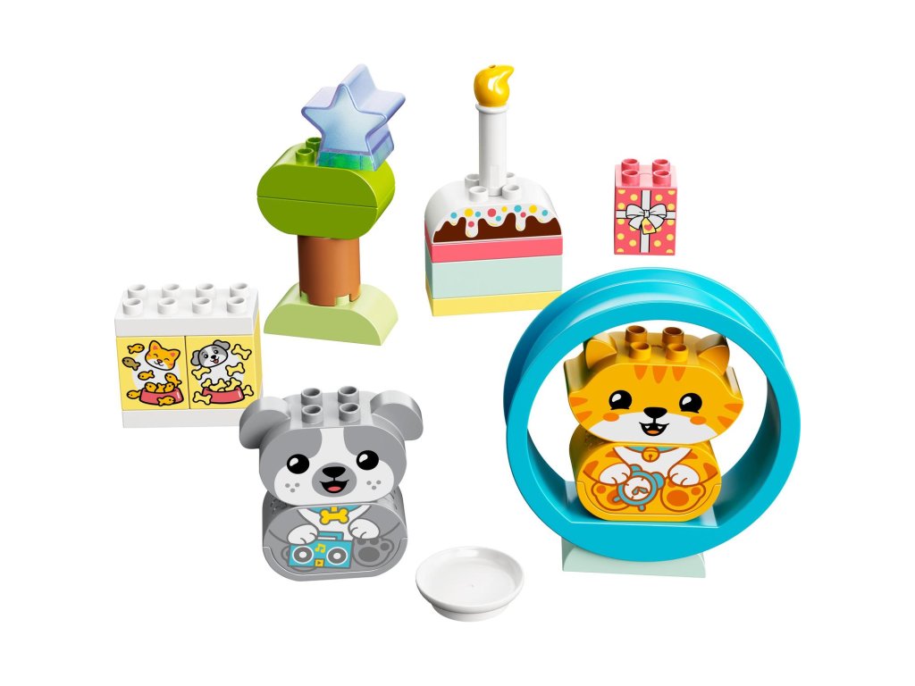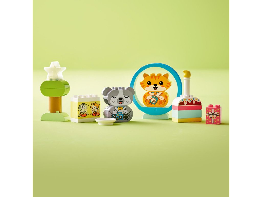 V této rozkošné stavebnici na vás čeká koťátko a pejsek. Obě figurky jsou tvořené 2 dílky vhodnými pro malé děti. Malí milovníci zvířat mohou své mazlíčky umístit do speciální kutálející se hračky. Zvukové funkce jednotlivých zvířat dále rozšiřují herní a výukové možnosti – zvuky totiž děti upozorní, když je čas na jídlo, hraní, spánek a tak dále. Jedná se o skvělý způsob, jak si předškoláci mohou osvojit každodenní rutiny.
