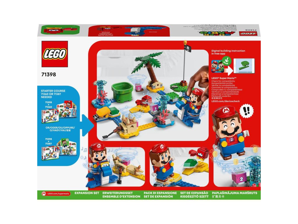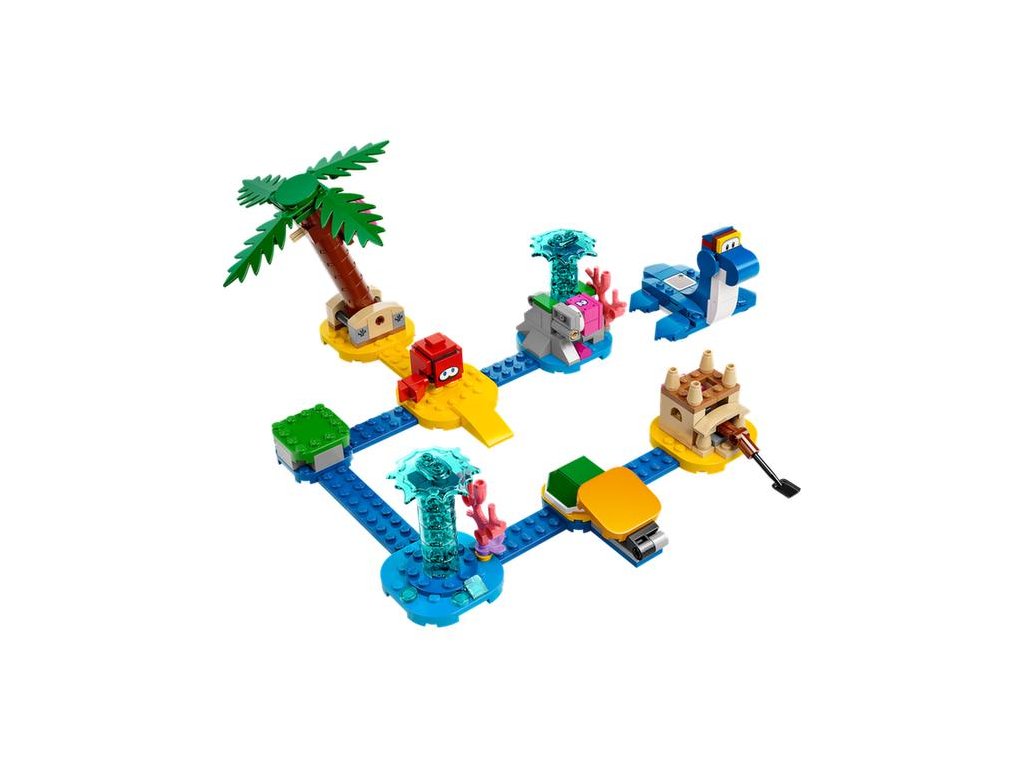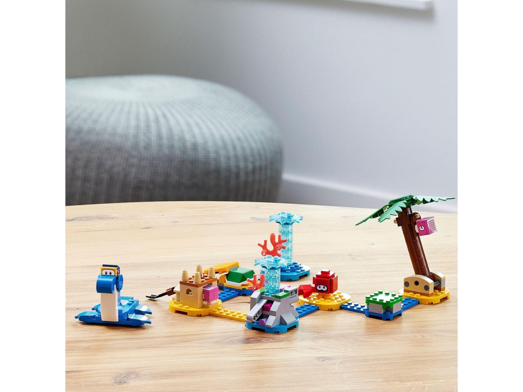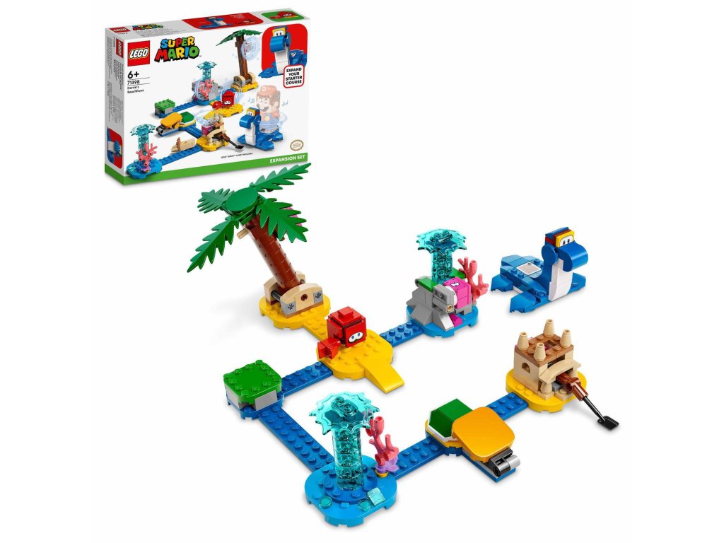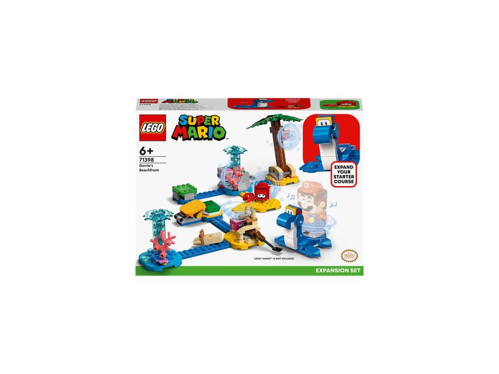 Obohaťte svůj svět LEGO® Super Mario™ o pestrou plážovou úroveň s rozšiřujícím setem Na pláži u Dorrie (71398) pro děti od 6 let. Najdete v něm figurku LEGO Dorrie, na které může jezdit LEGO® Mario™ nebo LEGO® Luigi™ (figurky nejsou součástí). Také se můžete těšit na vystřelovač, s pomocí kterého lze porazit figurku Huckit Craba, a navíc nechybí ani hrad z písku, fontána a strom – ty musí hráč aktivovat, aby získal přístup k akčním kostkám 1, 2 a 3. (Poznámka: Pro interaktivní hraní je vyžadován startovací set 71360 nebo 71387.)