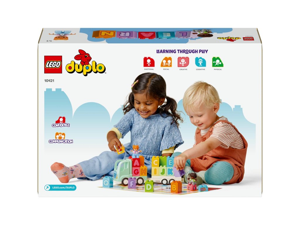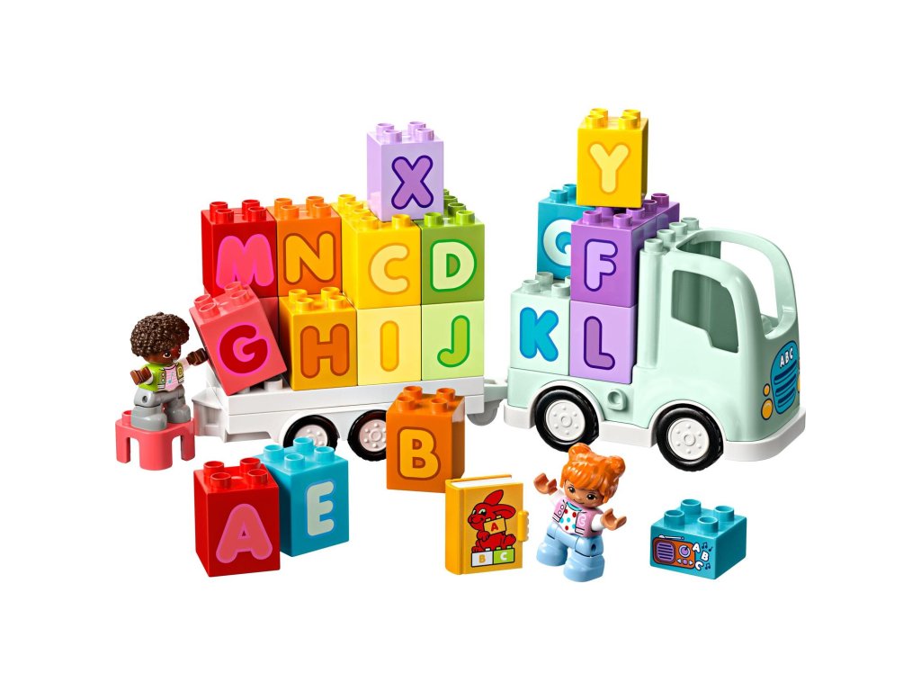 Tato kreativní hračka s abecedou přináší spoustu možností učení hrou. Malé děti si vyzkouší připojení přívěsu k náklaďáku, pomohou 2 figurkám LEGO DUPLO naskládat a vyskládat kostky a naučí se rozpoznávat písmena, barvy, zdokonalí mluvení a procvičí si jemné motorické schopnosti.