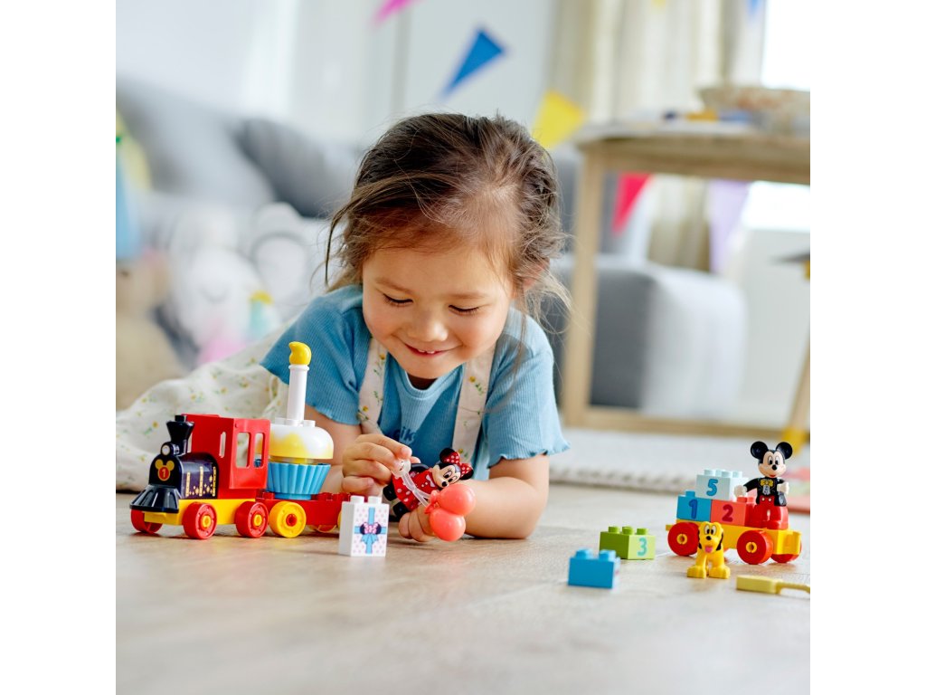 Malí stavitelé se připojí k Myšákovi Mickeymu, Myšce Minnie a Plutovi na palubě narozeninového vlaku, který je zaveze na nejedno zábavné a poučné dobrodružství. Tato pestrobarevná stavebnice podporuje rozvoj jemných motorických dovedností dětí, když staví vláček a skládají na sebe kostky s čísly, podněcuje kreativitu při zdobení vagónů a pomáhá jim osvojit si sociální dovednosti hraním příběhů s oblíbenými hrdiny pohádek od Disneyho.