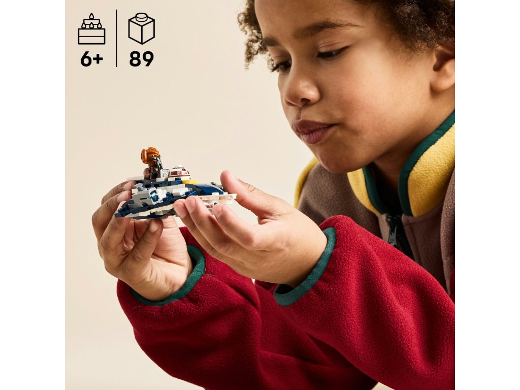 Představte malým dětem svět LEGO® Star Wars™ se stavebnicí Plo Koon a jeho jediská mikrostíhačka. Tato stavebnice je vůbec první model jediské mikrostíhačky LEGO Star Wars a představuje krásný dárek ve stylu Star Wars pro kluky, holky a fanoušky od 6 let. Model lze snadno a rychle sestavit, takže děti se můžou hned pustit do hraní. Stavebnice se pyšní autentickými detaily stíhačky Plo Koona z televizního seriálu Star Wars: Klonové války a součástí je kokpit pro minifigurku LEGO a 2 vystřelovače. Tato fantastická stavebnice obsahuje také minifigurku LEGO Plo Koona s modrým světelným mečem, který lze připnout na spodní stranu mikrostíhačky. Součástí je také hlava R7-D4, kterou lze připevnit k trupu před kokpitem, aby to vypadalo, že je spolehlivý droid ze Star Wars druhým pilotem. Tuto sběratelskou stavebnici pro děti lze kombinovat s ostatními stavebnicemi mikrostíhaček LEGO Star Wars (prodávají se samostatně) pro ještě více herních možností. Stavebnice obsahuje 89 dílků.
