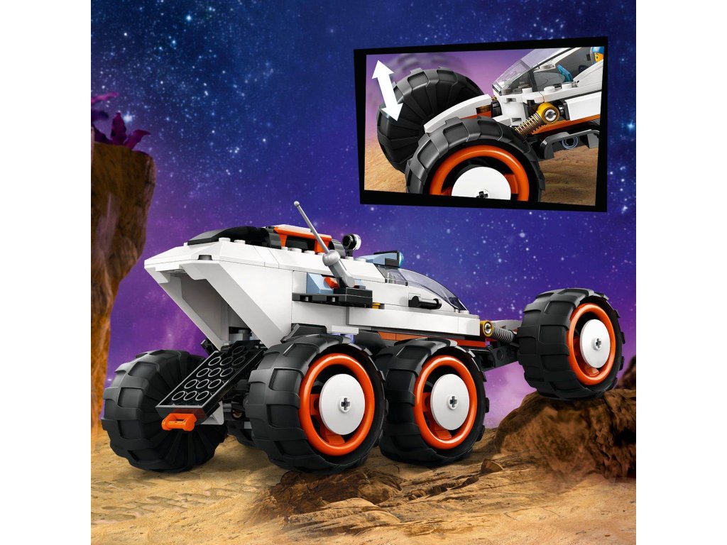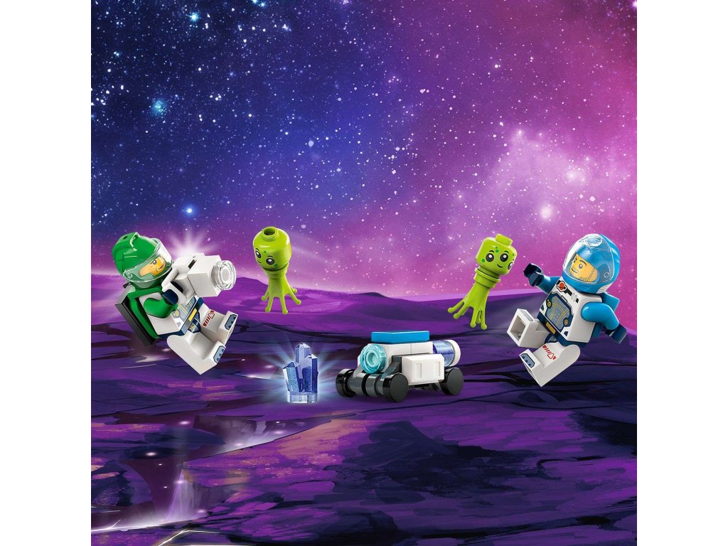 S touto stavebnicí 60431 LEGO® City Průzkumné vesmírné vozidlo a mimozemský život se mohou děti od 6 let pustit do projíždění nových světů. Odolné vozidlo pro průzkum vesmíru je vybaveno 6 velkými pneumatikami a pokročilým odpružením pro jízdu po kamenitém terénu planety. Děti se mohou připojit k posádce, která mapuje povrch planety a objevuje podivné gejzíry tryskající páru a mimozemský život. Součástí této zábavné stavebnice jsou 2 minifigurky vesmírné posádky, robot a figurky mimozemšťanů.
