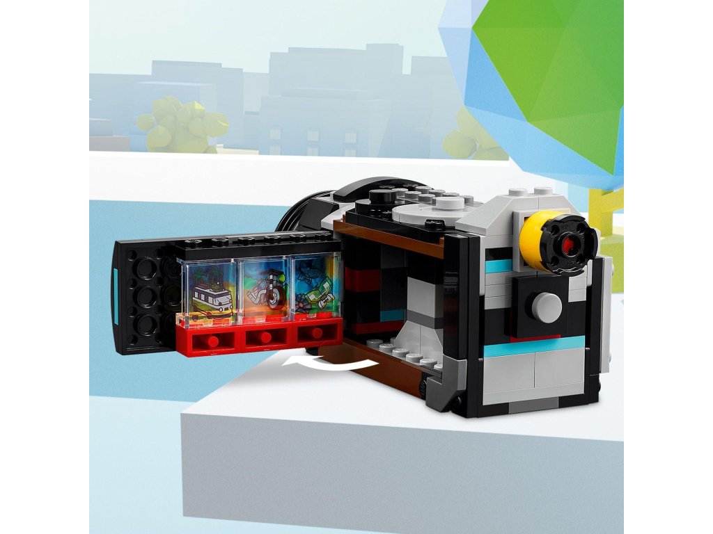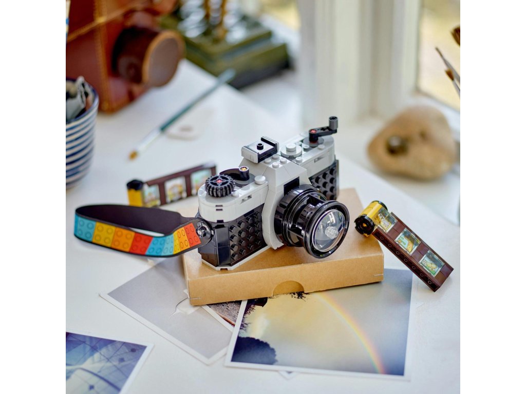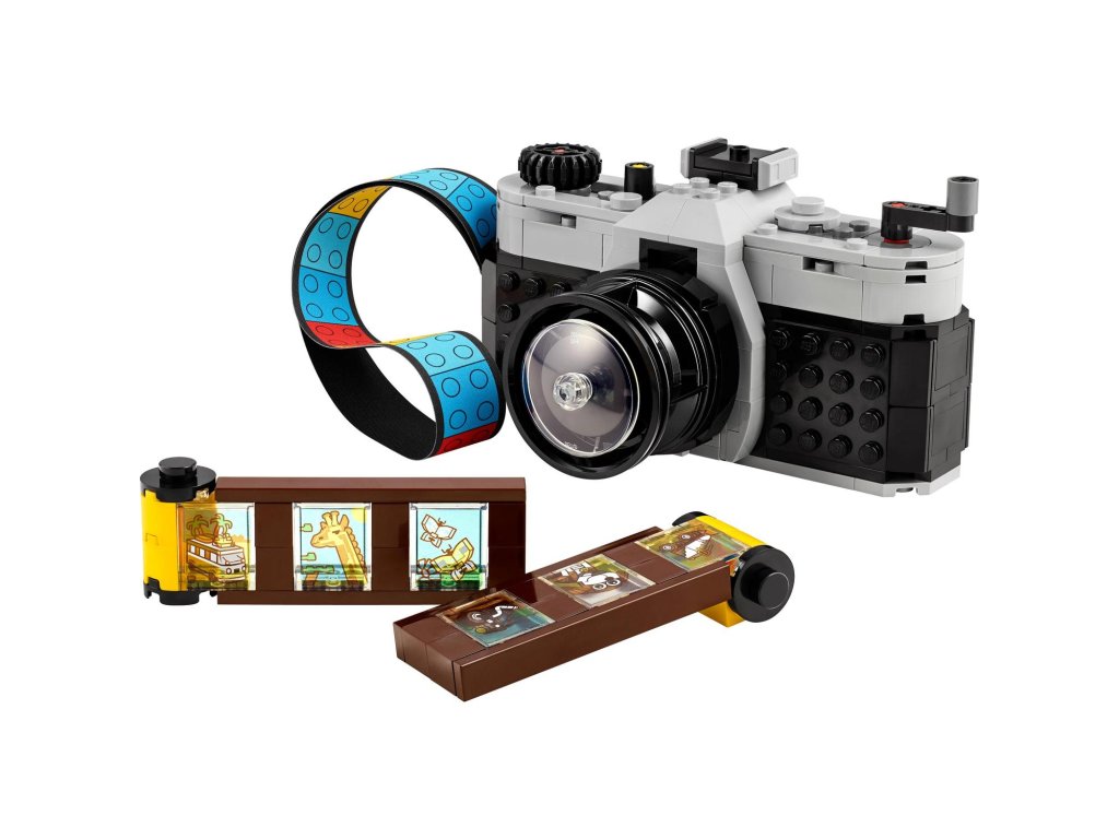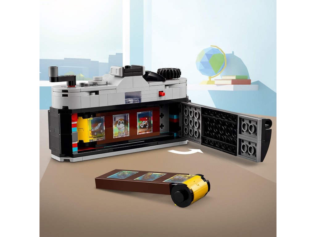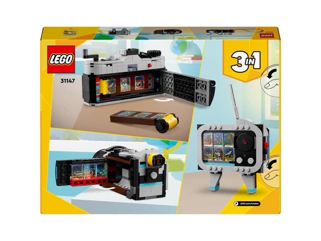 Inspirujte děti od 8 let k nápaditému hraní se stavebnicí LEGO® Creator 3 v 1 (31147) Retro fotoaparát. Model fotoaparátu má pohyblivý objektiv, na horní straně najdete tlačítka k pořízení fotografie a vzadu je otvor, do kterého můžete umístit film z kostek a barevný textilní pásek na nošení. Součástí je také 6 samolepek, které představují fotografie a děti je nalepí na jednotlivá filmová políčka.