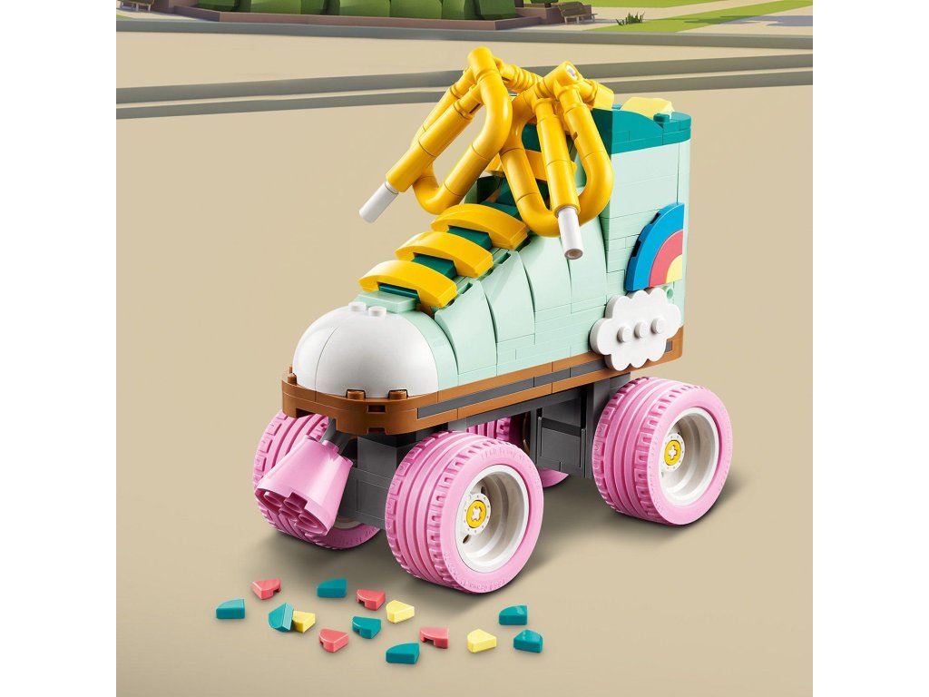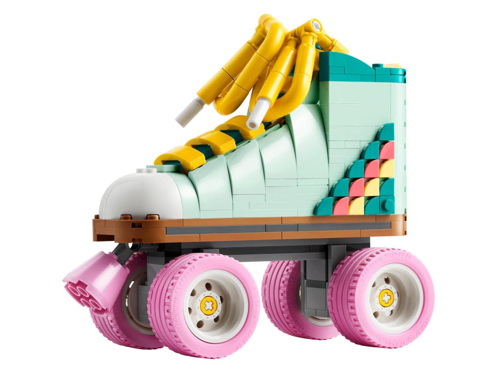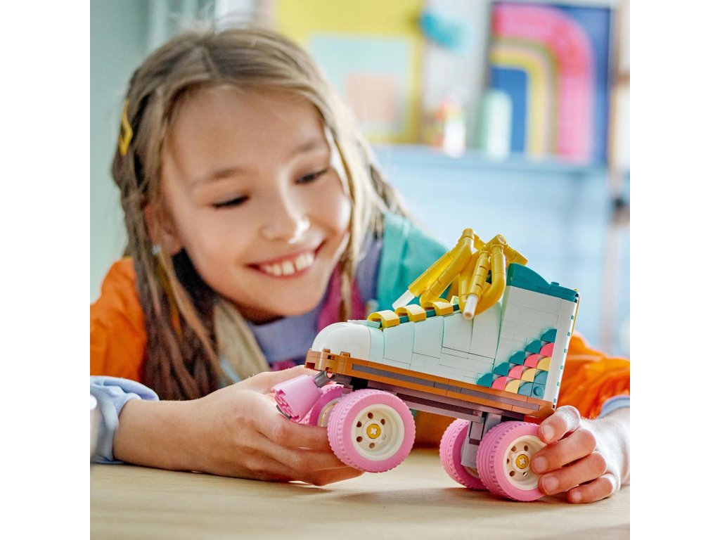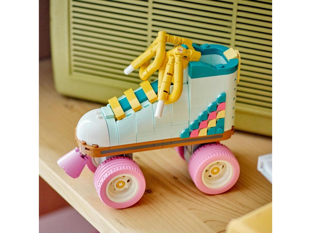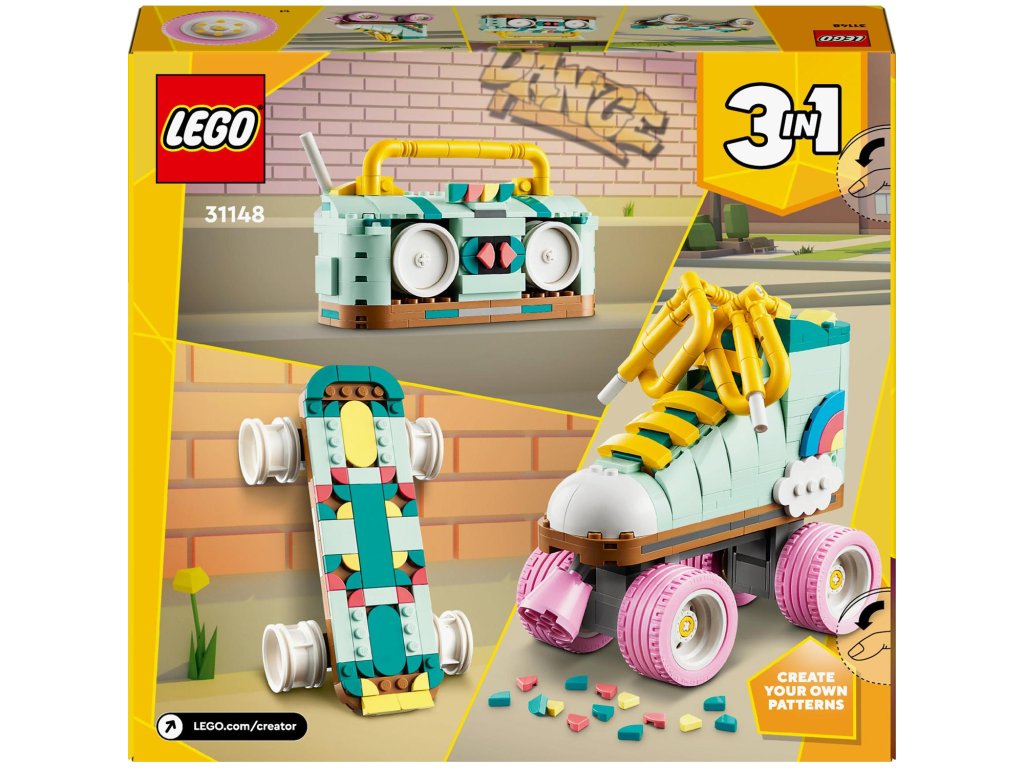 Kreativní děti od 8 let se se stavebnicí LEGO® Creator 3 v 1 (31148) Retro kolečkové brusle vrátí do minulosti. Postaví si s ní kolečkovou brusli LEGO se 4 pohyblivými růžovými kolečky, růžovou brzdou, tlustou žlutou tkaničkou a sadou barevných dílků, se kterými ozdobí patu brusle podle vlastní fantazie.
