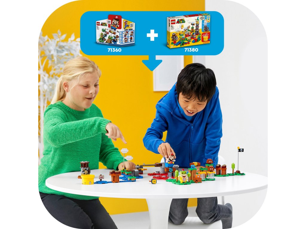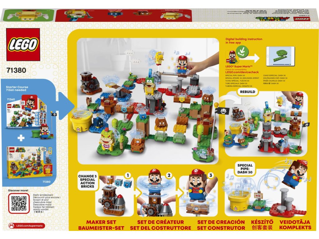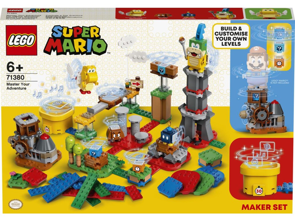 Malí stavitelé mohou se vzrušující stavebnicí Set pro tvůrce – mistrovská dobrodružství (71380) upravovat svůj LEGO® Super Mario™ Startovací set a rozšiřovací sety, a vytvářet tak jedinečné úrovně. Nechybí zvláštní stroj pro výběr odměn, které nabízí časová kostka a 2 kostky se speciálními předměty. Modulární stavebnice zaujme také posuvnou plošinou, barevnými LEGO dílky, které vyvolávají u LEGO® Maria různé reakce (figurka není součástí), a speciální potrubí Dash 30, s jehož pomocí lze přestavovat a vytvářet nové úrovně.