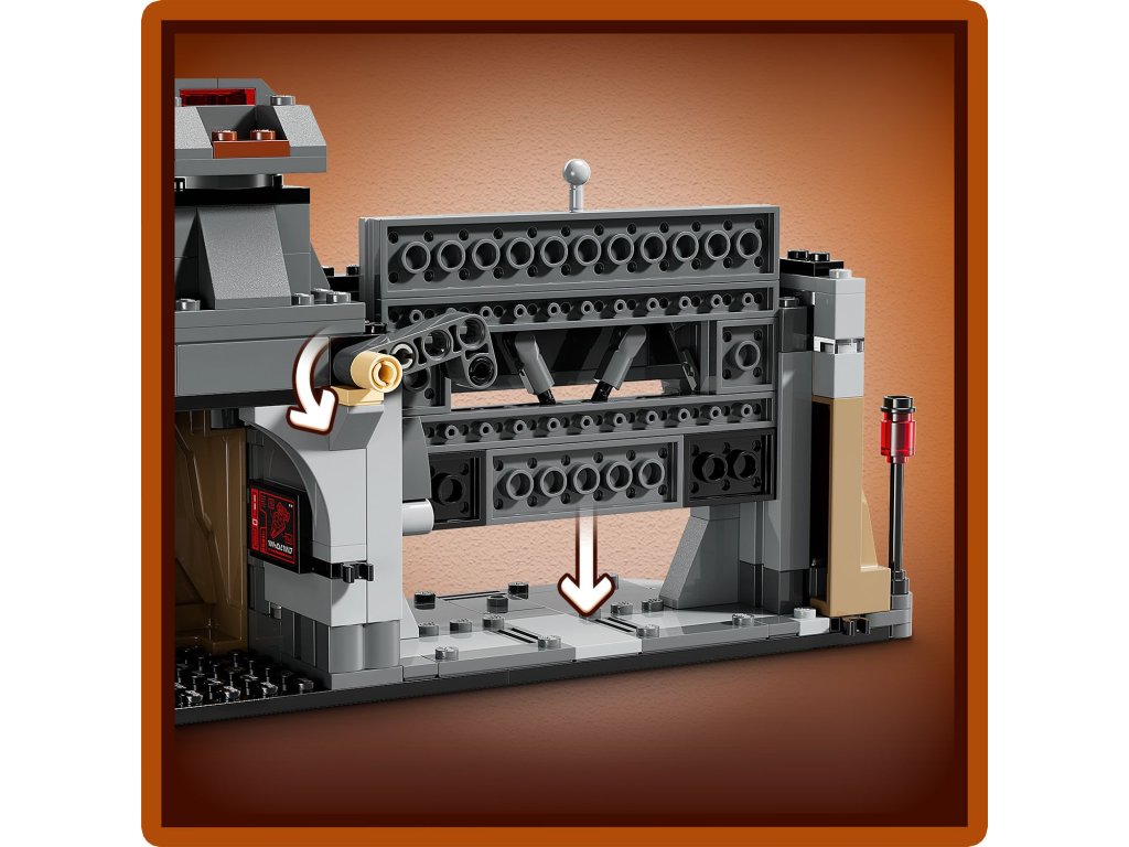Stavebnice Star Wars™ pro děti – Mandaloriánská základna v této stavebnici má těžce obrněné dveře se spouští, která se aktivuje při zabouchnutí, ovládací panely, a navíc otočnou vystřelovací věž