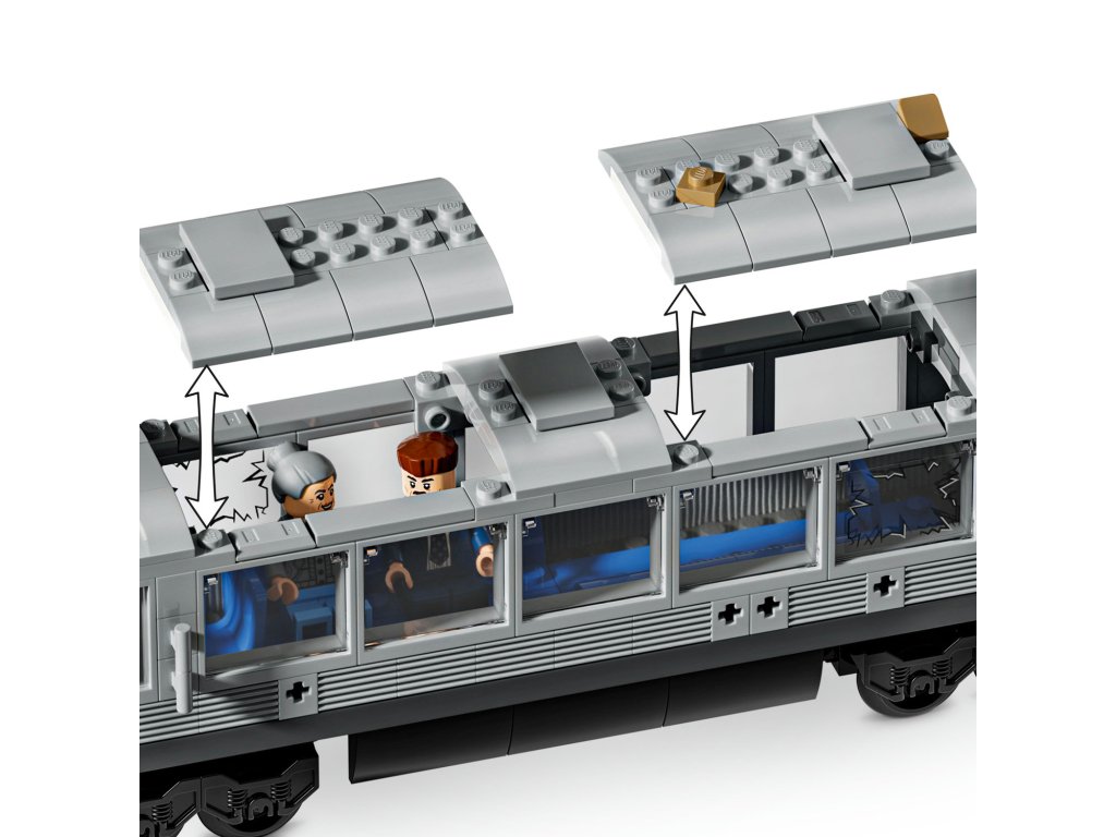 Sběratelské předměty LEGO® | Marvel – Minifigurka Spider-Mana má hlavu s maskou i bez ní a střecha vlaku umožňuje přístup do interiéru, kde se může usadit cestující