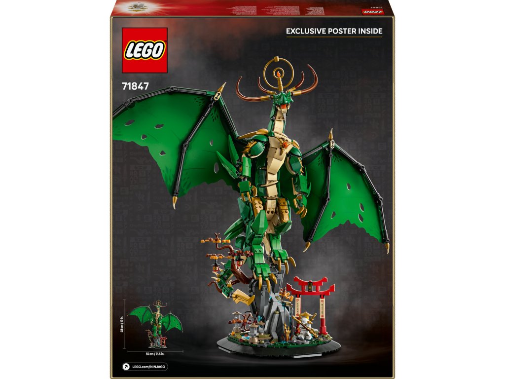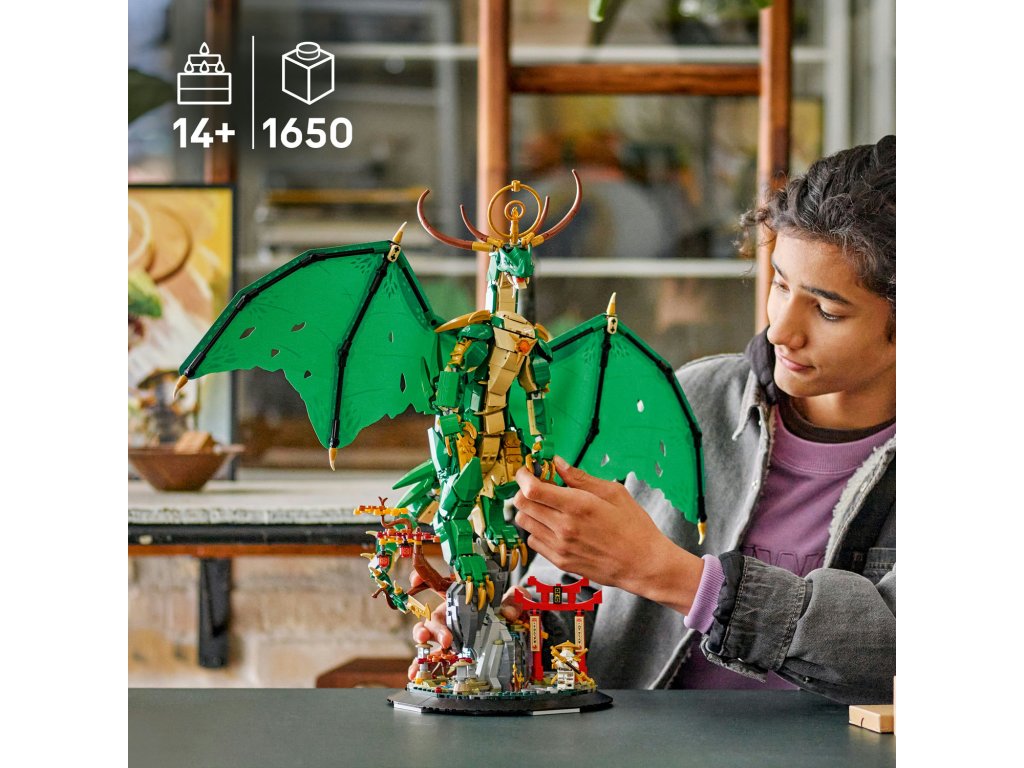 Starší fanoušci NINJAGO® od 14 let můžou rozšířit svou sbírku modelů LEGO® NINJAGO o majestátní stavebnici Strážný drak (71847). Tento výstavní model draka má pohyblivou hlavu, paže a šupiny a nechybí velká křídla, ostny a svatozář nad hlavou, takže poslouží jako krásný dárek pro fanoušky seriálu NINJAGO Legends Příšernost. Díky propracovanému podstavci na vystavení s jezerem, vznášejícímu se kouzelnému meči, lucerně, bráně a minifigurce mistra Wu se bude tento model skvěle vyjímat na polici, na stole nebo třeba na nočním stolku. V ostatních stavebnicích z řady LEGO NINJAGO (prodávají se samostatně) najdete draky, vozidla a chrámy a fanoušci si užijí hodiny zábavného hraní se svými oblíbenými hrdiny. Aplikace LEGO Builder vám a vašemu dítěti ukáže snadnou a intuitivní cestu stavitelským dobrodružstvím pro skládání nindžovského modelu. Přibližujte a otáčejte modely ve 3D, ukládejte si stavebnice a sledujte svůj postup. Stavebnice obsahuje 1650 dílků.
