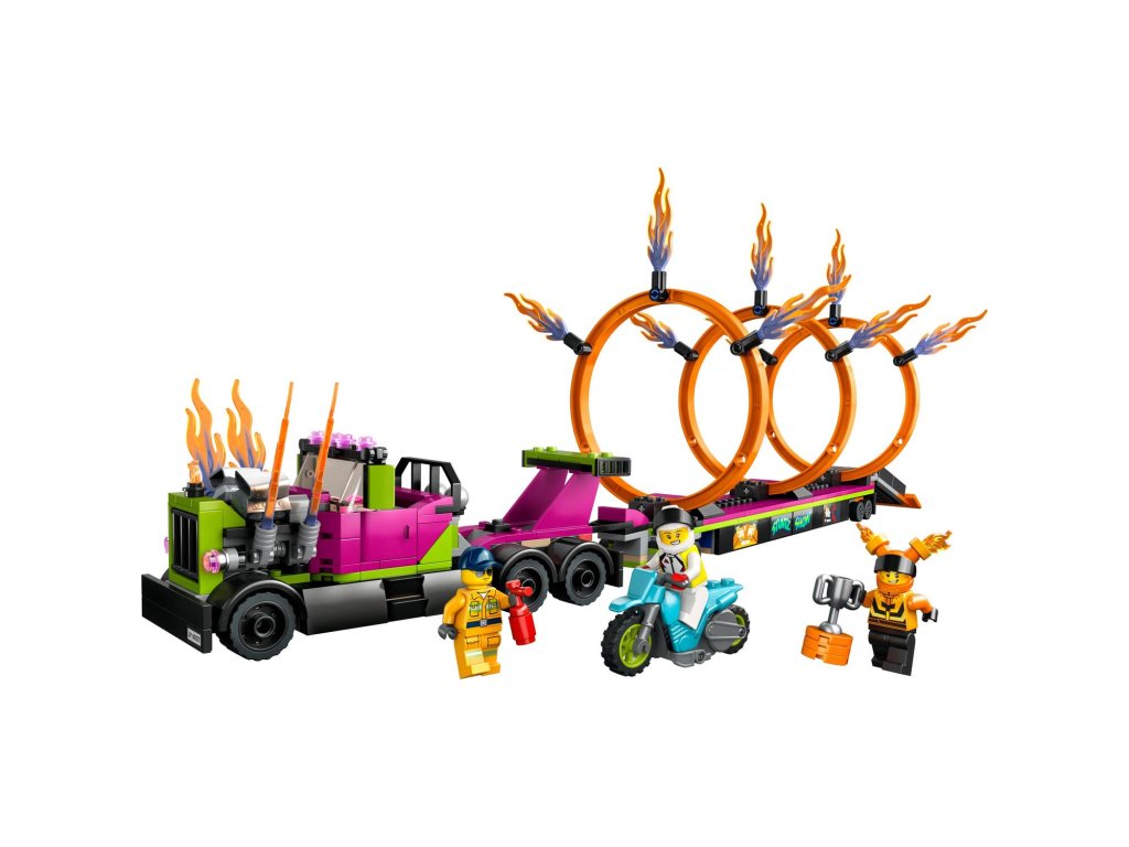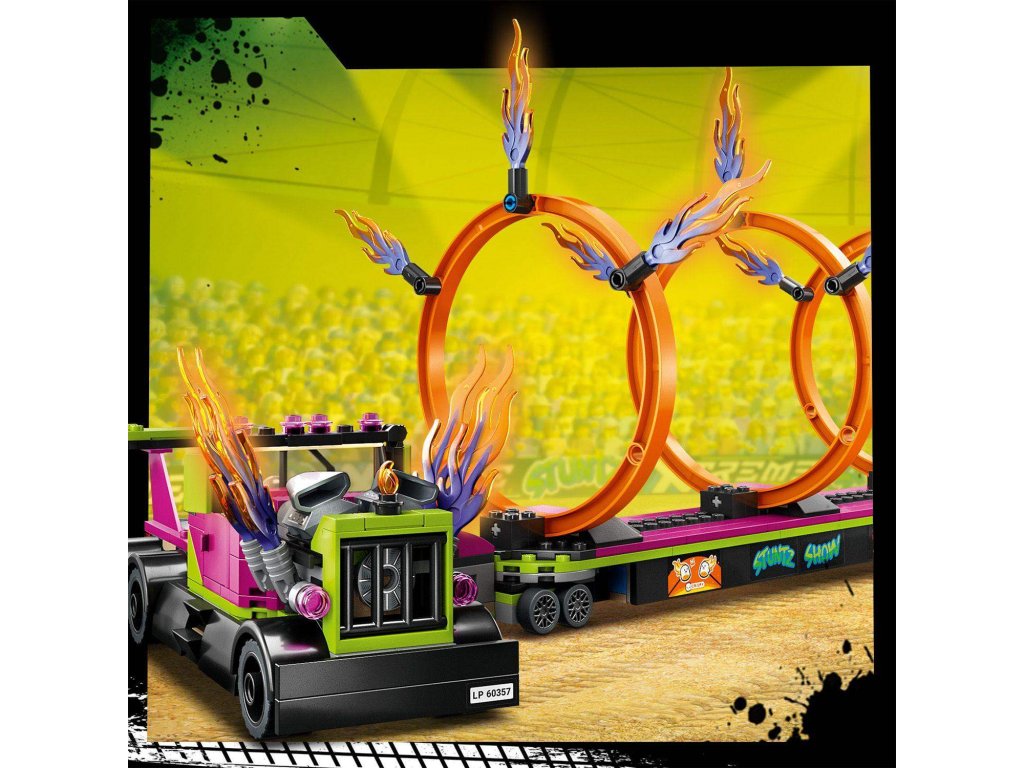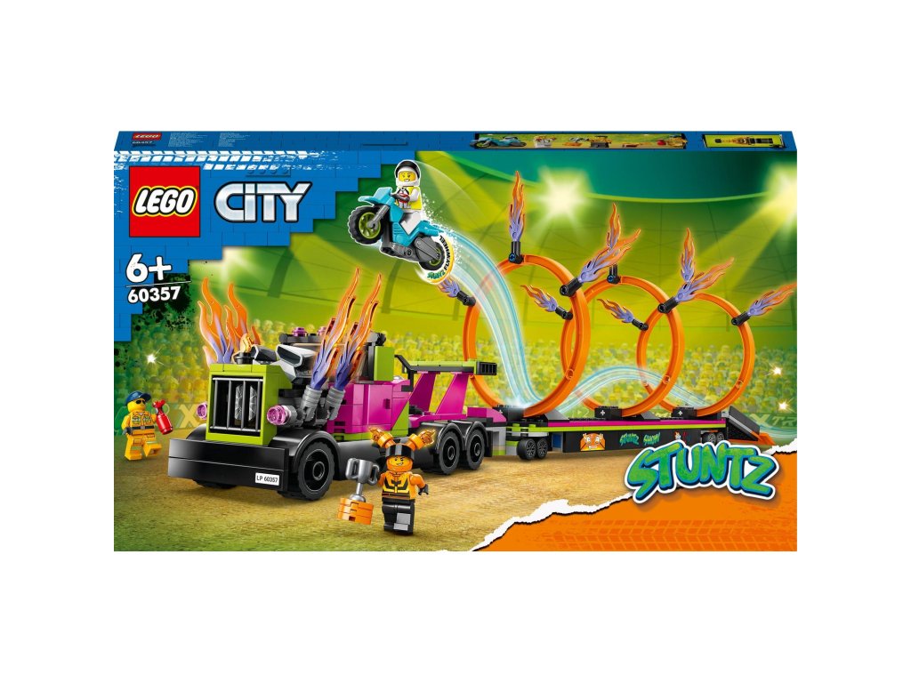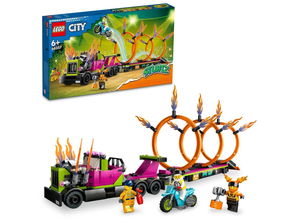 Vrhněte se do akce se stavebnicí Tahač s ohnivými kruhy od LEGO® City (60357). Součástí této akční stavebnice pro děti od 6 let je parádní tahač, kterému z výfuku šlehají plameny, plochý přívěs s vyklápěcí rampou na vypouštění a 3 upravitelné ohnivé kruhy. Stačí přidat kaskadérskou motorku se setrvačníkem, řidiče tahače a 2 minifigurky jezdců Stuntz a čekají vás hodiny akcí nabitého hraní.