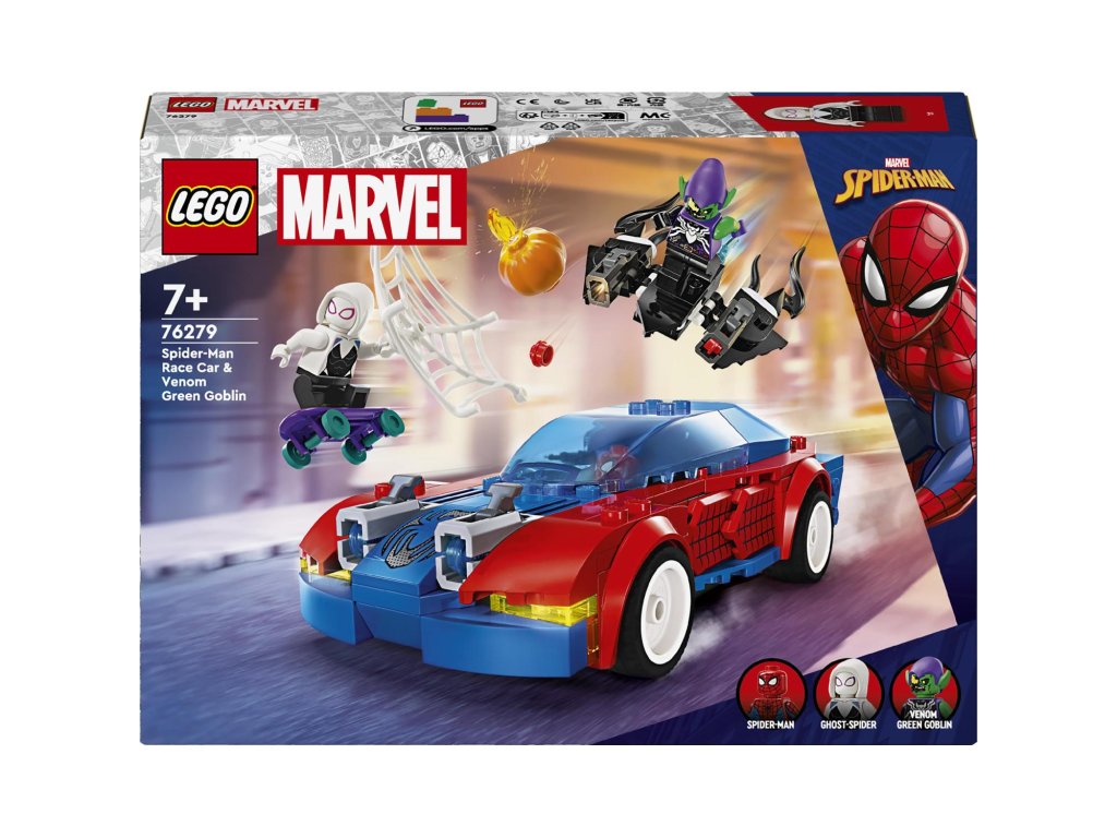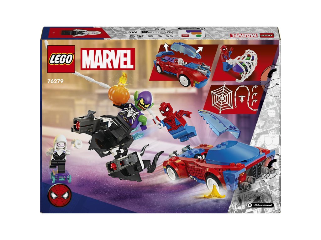 Spider-Man, Ghost-Spider a Venom Zelený goblin se utkají v rychlé akční bitvě s řadou vozidel, zbraní a doplňků. Spider-Manovo auto má 2 přední vystřelovače, Zelený goblin se pyšní 2 vystřelovači na kluzáku a dýňovými bombami a Ghost-Spider při jízdě na skateboardu používá 2 ruční vystřelovače pavučin. Spider-Man se houpe na ohebném pavučinovém „laně“ a pomocí velké pavučiny uvězní padouchy. Odnímatelné části stavebnice umožňují přístup do interiéru auta, do kterého se vejdou hned 2 minifigurky a skateboard. Pro ještě více digitální zábavy je zde zábavná a intuitivní aplikace LEGO Builder, kde mohou stavitelé přibližovat a otáčet modely ve 3D a sledovat postup.