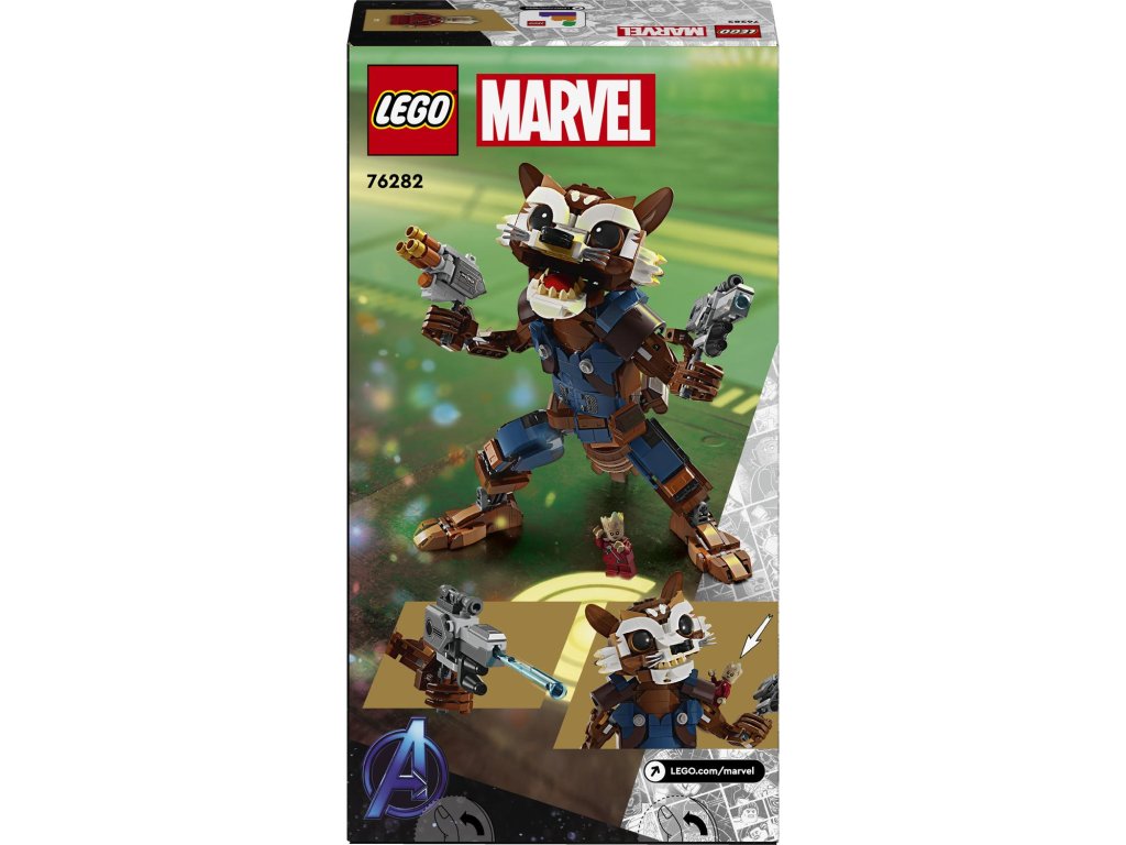 Stavebnice LEGO® Marvel (76282) Rocket a malý Groot posune zážitek z marvelovských akčních scén na novou úroveň. Stavebnice je vhodná pro děti od 10 let a po sestavení měří přes 22 cm na výšku. Tato akční figurka Rocketa je mnohem víc než jen dětská hračka – jedná se o realistické zpracování oblíbené postavy z filmu Strážci Galaxie od studia Marvel.