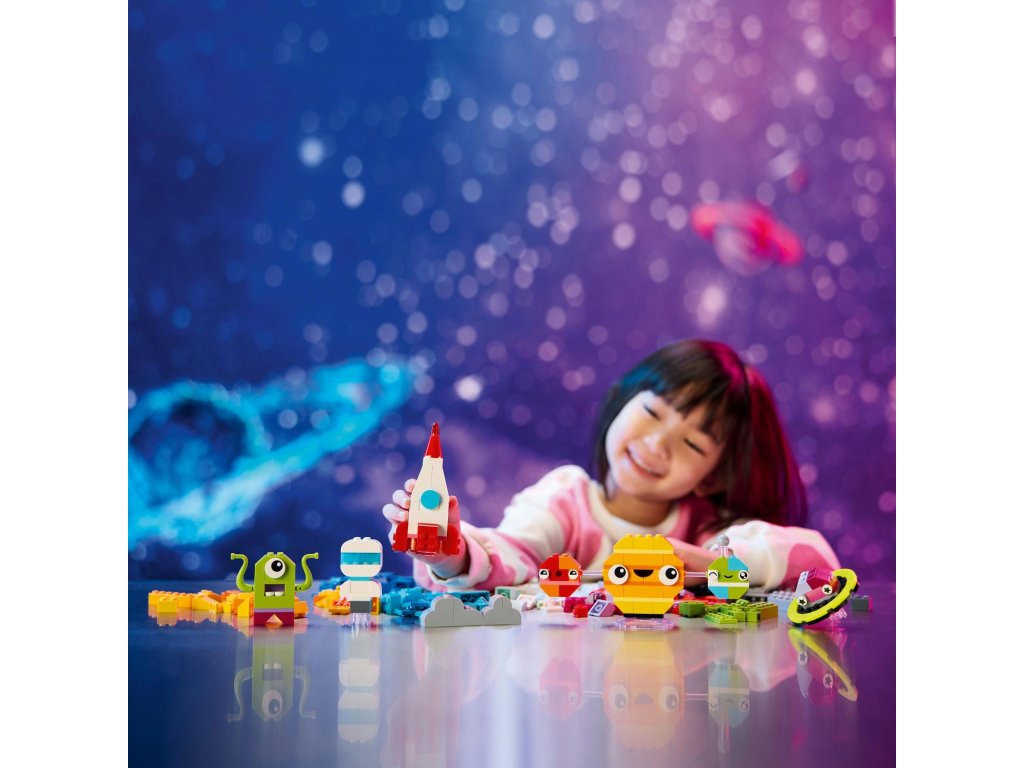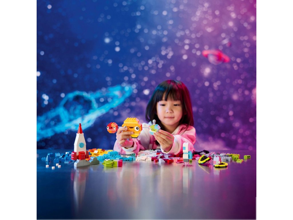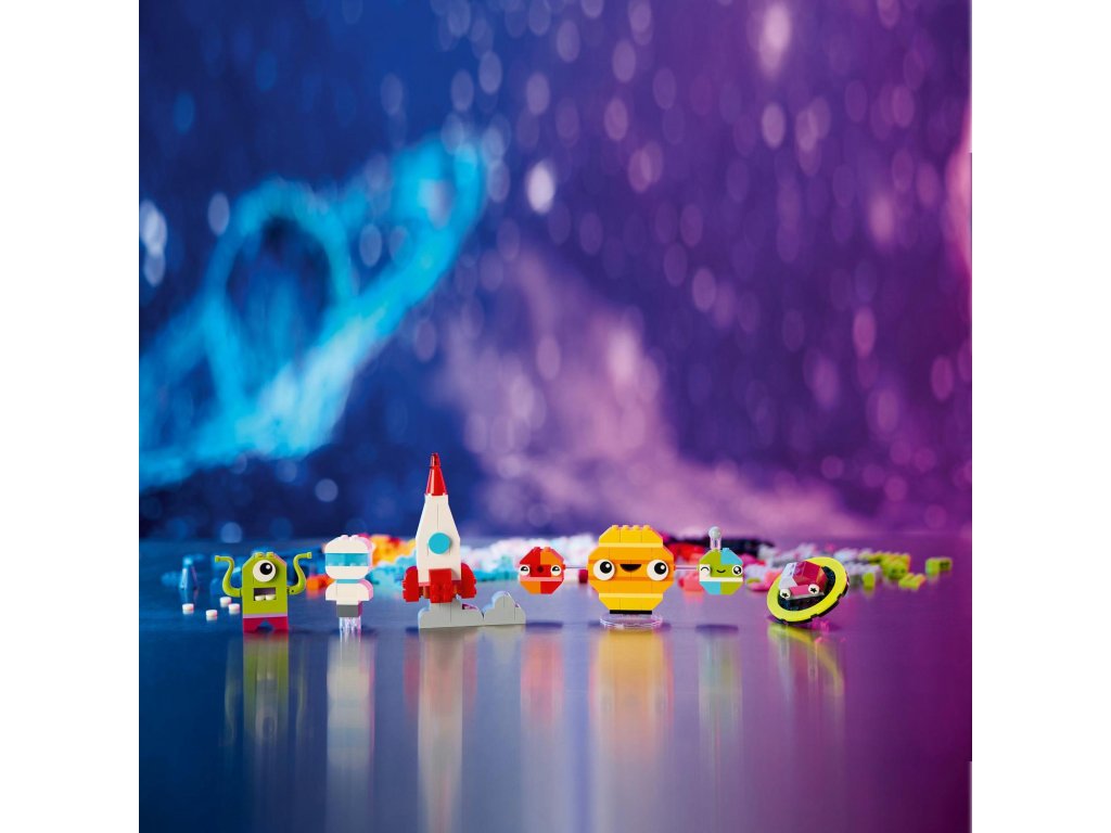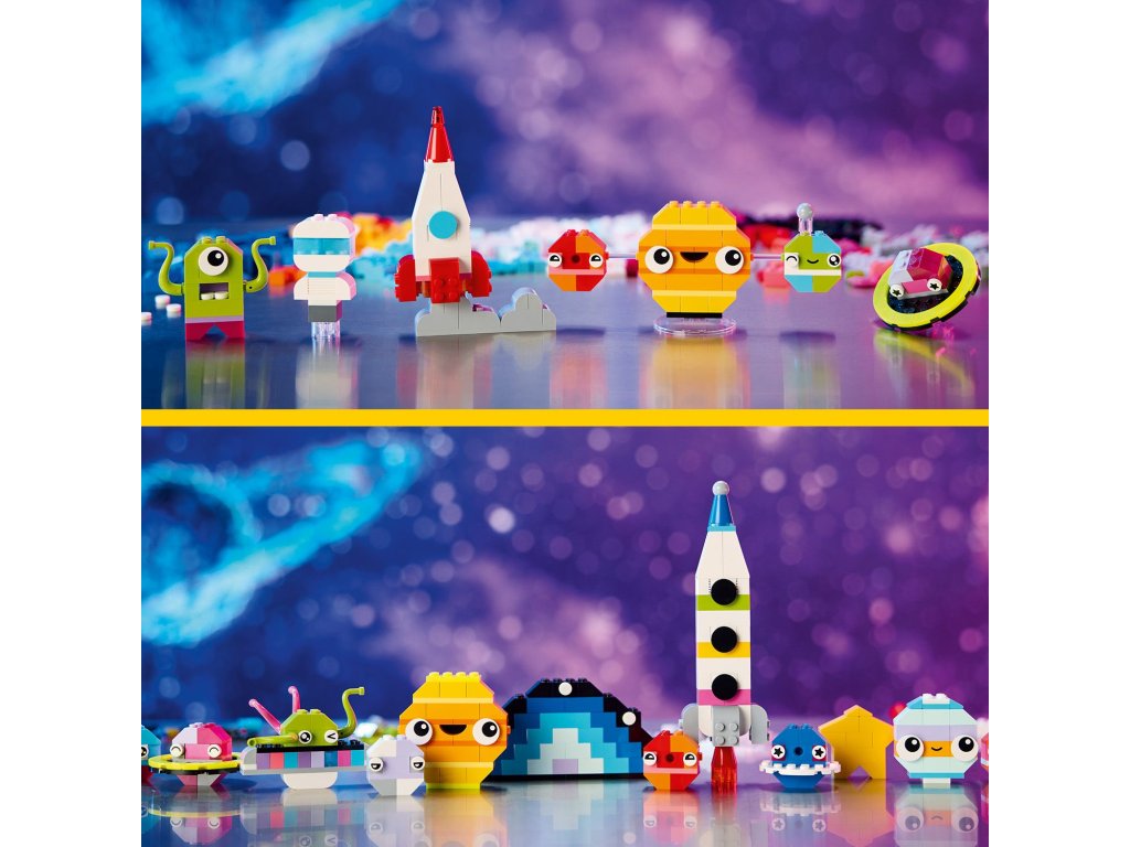 Z barevných kostek mohou děti poskládat vesmírnou raketu, mimozemšťana, astronauta a miniaturní sluneční soustavu včetně Marsu, Země, Slunce a Saturnu s jeho proslulými prstenci. Vesmírné modely mohou vylepšit použitím odlišných barev, tvarů, očí, výrazů a stojánku, díky němuž lze model otáčet. Součástí jsou dokonce i kostky svítící ve tmě, aby výtvory byly vidět i v noci. Díky našim alternativním návodům na stavění si malí stavitelé užijí svou vesmírnou kreativitu a postaví například sluneční soustavu se všemi 8 planetami. V aplikaci LEGO Builder najdete digitální návod a funkce.