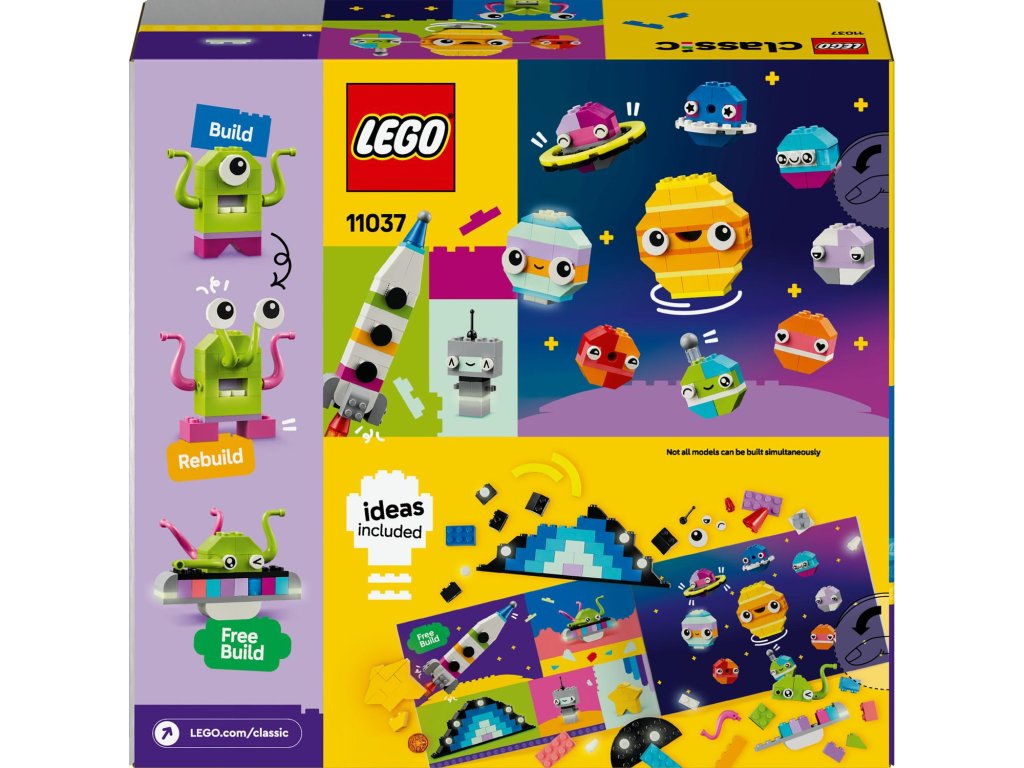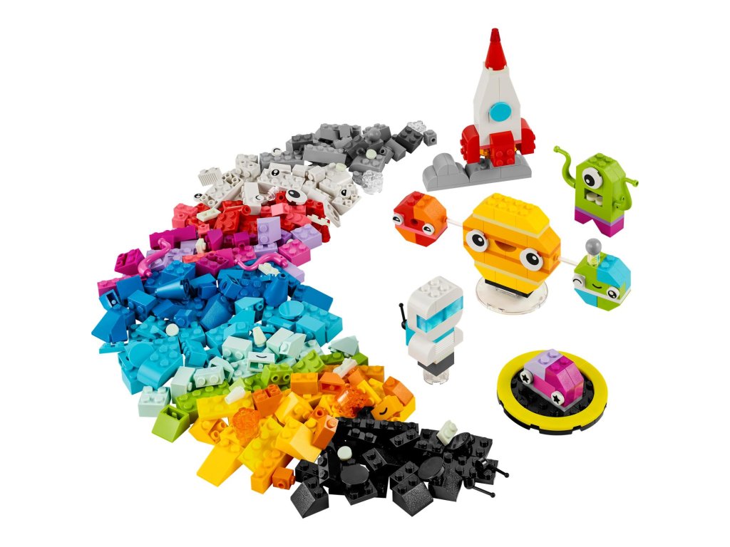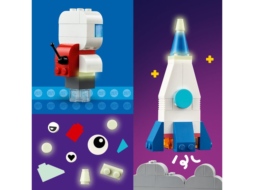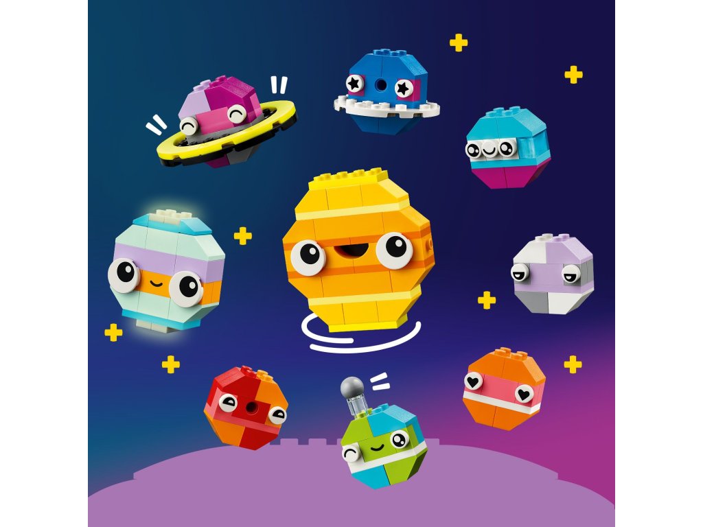 Z barevných kostek mohou děti poskládat vesmírnou raketu, mimozemšťana, astronauta a miniaturní sluneční soustavu včetně Marsu, Země, Slunce a Saturnu s jeho proslulými prstenci. Vesmírné modely mohou vylepšit použitím odlišných barev, tvarů, očí, výrazů a stojánku, díky němuž lze model otáčet. Součástí jsou dokonce i kostky svítící ve tmě, aby výtvory byly vidět i v noci. Díky našim alternativním návodům na stavění si malí stavitelé užijí svou vesmírnou kreativitu a postaví například sluneční soustavu se všemi 8 planetami. V aplikaci LEGO Builder najdete digitální návod a funkce.