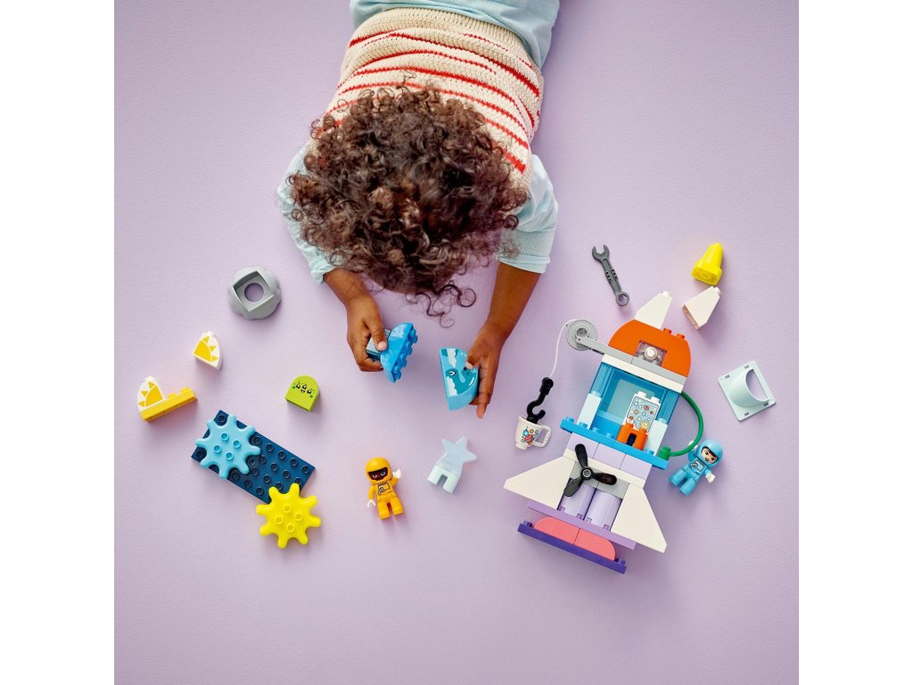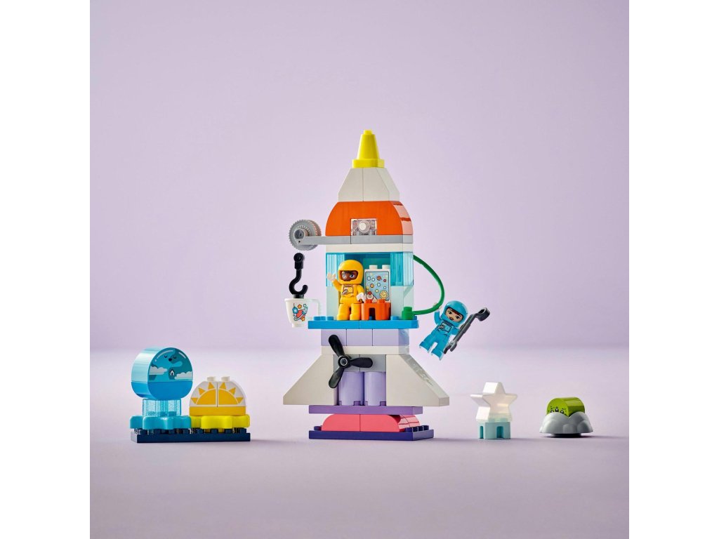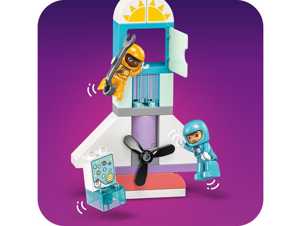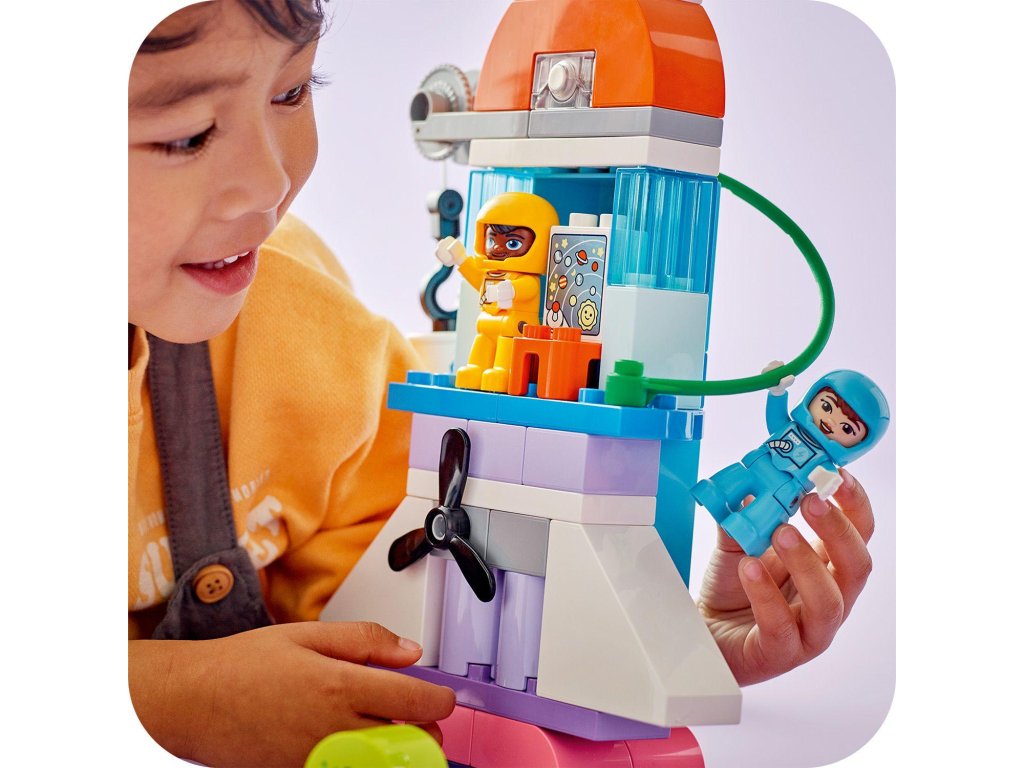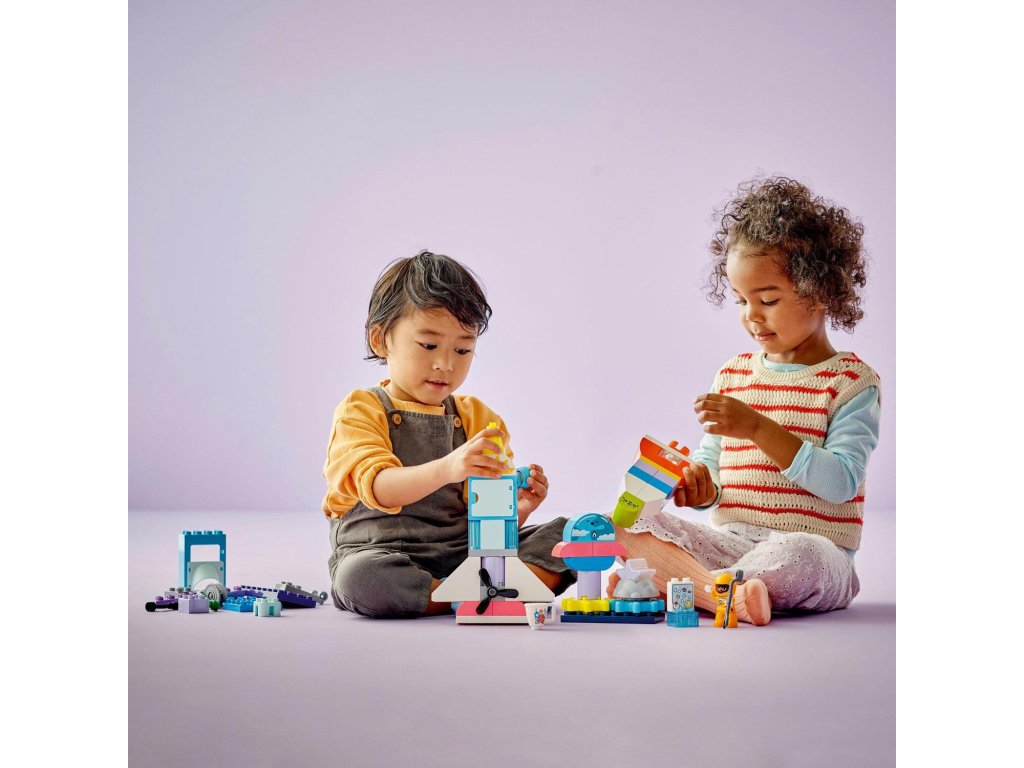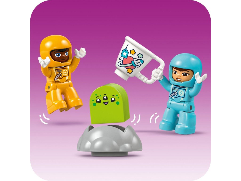 Tato vesmírná hračka je plná zábavných doplňků, které podněcují kreativní hraní. Děti prozkoumají nové obzory a prožijí galaktická dobrodružství se 2 figurkami LEGO® DUPLO® astronautů – spřátelí se s mimozemšťanem nebo se třeba vydají opravit raketoplán pomocí hasáku.