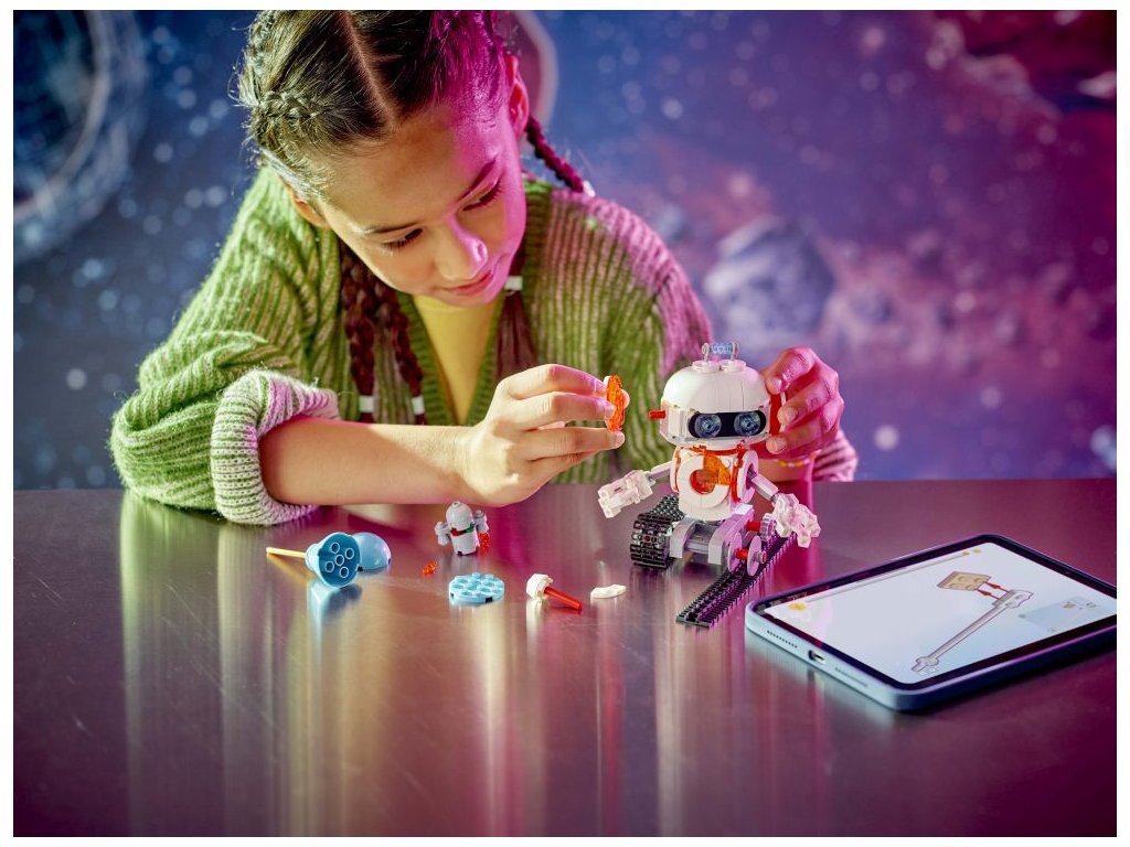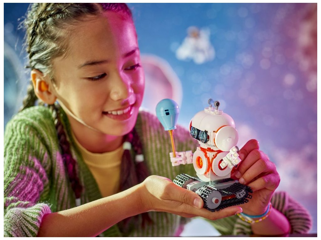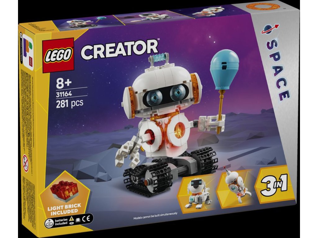 Kluci a holky od 8 let si přehrají příběhy z hvězd s vědeckou stavebnicí LEGO® Creator 3 v 1 (31164) Vesmírný robot. Tento model robota pro děti má pohyblivé pásy a jetpack, otáčecí tělo a hlavu, pohyblivé paže a prsty, balón a světelnou kostku, která osvětluje jeho trup. Fanoušci LEGO můžou stavět a přestavovat 3 různé akční vesmírné modely ze stejných kostek: robota na pohyblivých pásech, pohyblivou figurku vesmírného psa s kostí a létajícím diskem nebo vesmírnou raketu. Všechny 3 modely představují parádní dárky s vesmírnou tematikou, se kterými si děti užijí spoustu zábavy. Stisknutím světelné kostky (baterie jsou součástí balení) děti model rozsvítí. Stavebnice LEGO Creator 3 v 1 představují skvělé dárky pro děti díky 3 různým možnostem stavění v každé krabici. Tyto stavebnice jsou součástí působivé řady, která potěší milovníky parádních vozidel, úžasných zvířat a propracovaných domů a malí stavitelé si s nimi vychutnají hodiny kreativního hraní. Upozorňujeme, že modely nelze sestavit najednou.