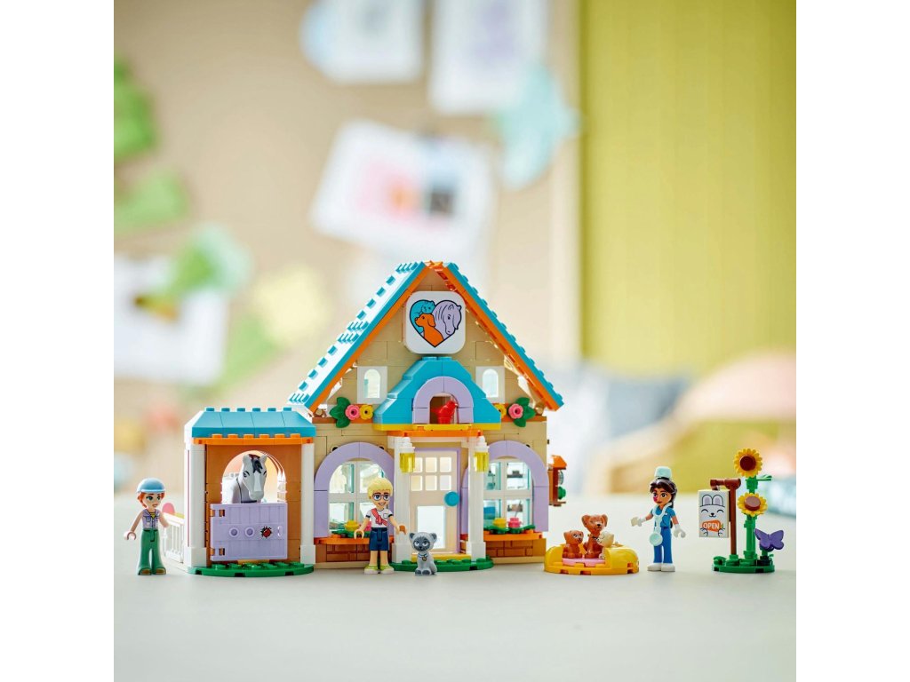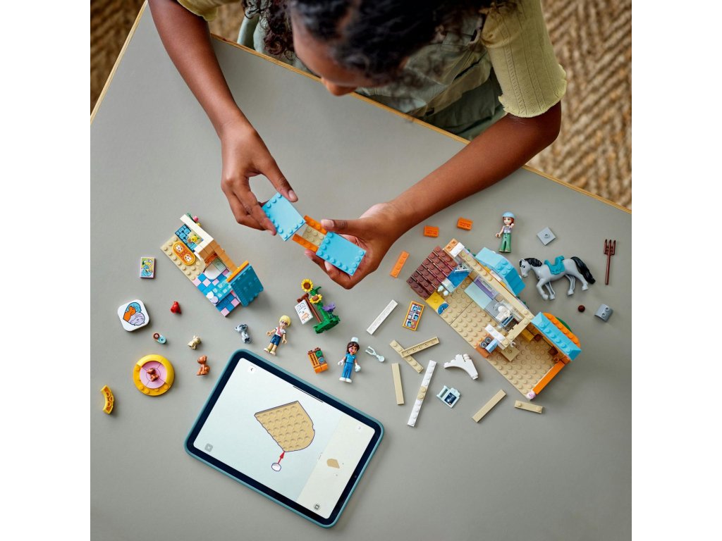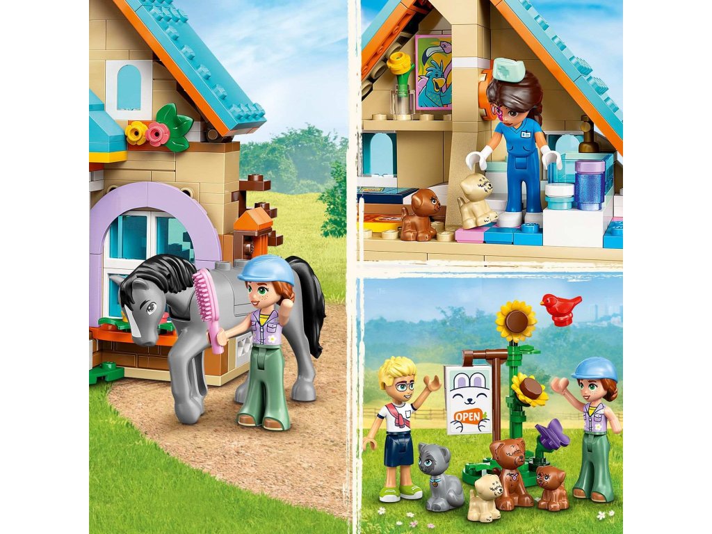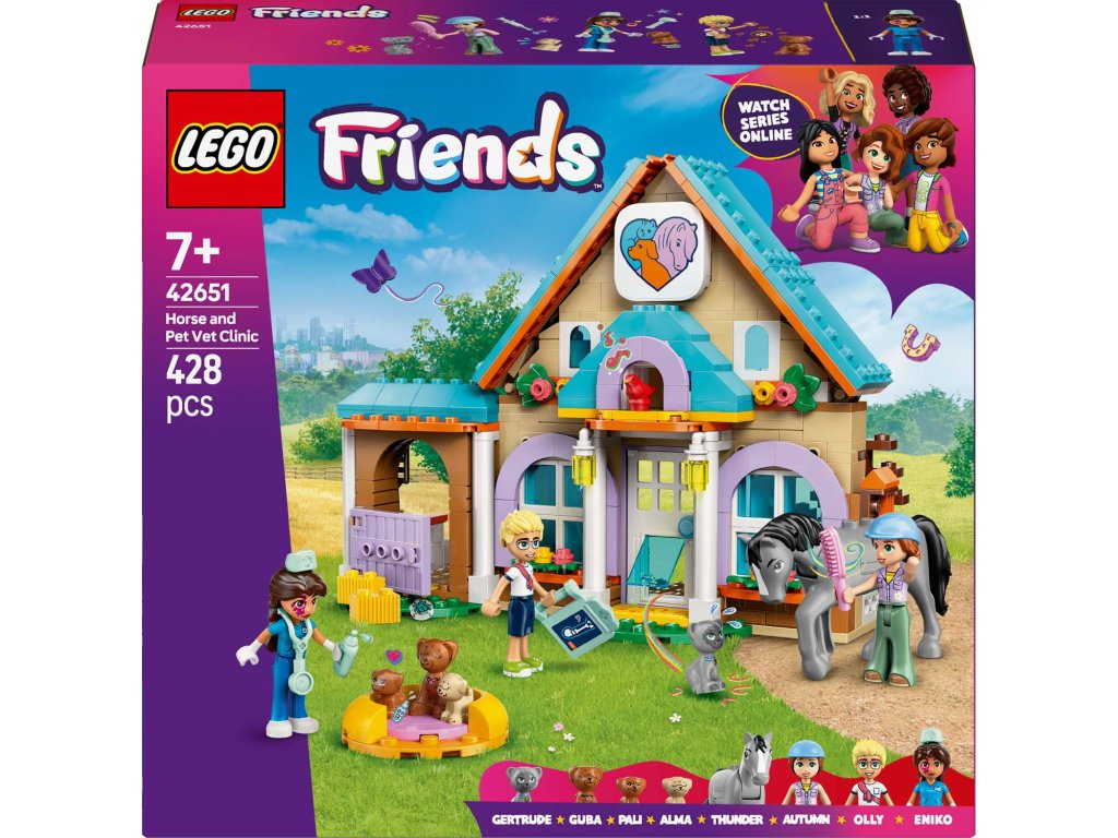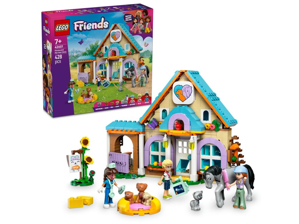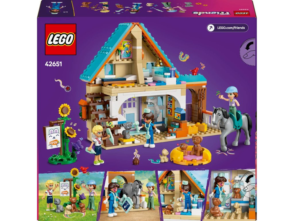 Inspirujte holky, kluky a milovníky zvířat od 7 let ke kreativnímu hraní. Stavebnice LEGO® Friends (42651) Veterinární klinika pro koně a domácí mazlíčky obsahuje 3 minipanenky LEGO Friends, koně, 3 psy a figurku kočky. Malí stavitelé si užijí hodiny zábavy při vymýšlení nekonečných příběhů o péči o zvířátka. Součástí stavebnice je pracovní prostor pro veterinářku Eniko s vyšetřovacím stolem, krmivem pro domácí mazlíčky, veterinárním vybavením a váhou na vážení zvířat. Ve stáji najdete seno, vidle, kartáč, sedlo a psací podložku s rentgenem koně. Děti se můžou hrát na příběhy o majitelích domácích mazlíčků, když Olly přijde se svou kočku k veterinářce a Autumn navštíví svého koně. Veterinářka má své vlastní domácí mazlíčky – psa a dvě štěňátka. Po kontrole zvířátek Eniko zamíří nahoru, kde má ložnici a koupelnu. Stavebnice obsahuje spoustu zábavných doplňků pro zvířata a představuje skvělý dárek k narozeninám nebo jakékoli jiné příležitosti pro malé milovníky zvířat. Objevte další herní stavebnice ze světa LEGO Friends (prodávají se samostatně).