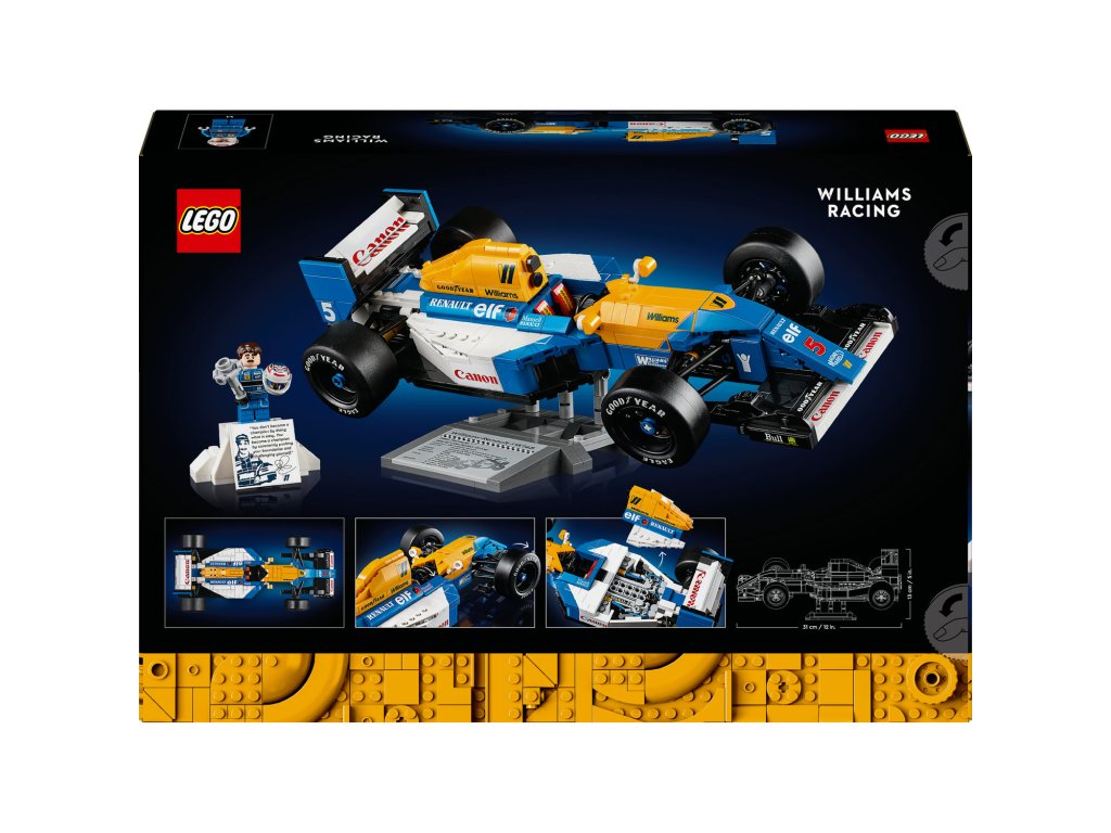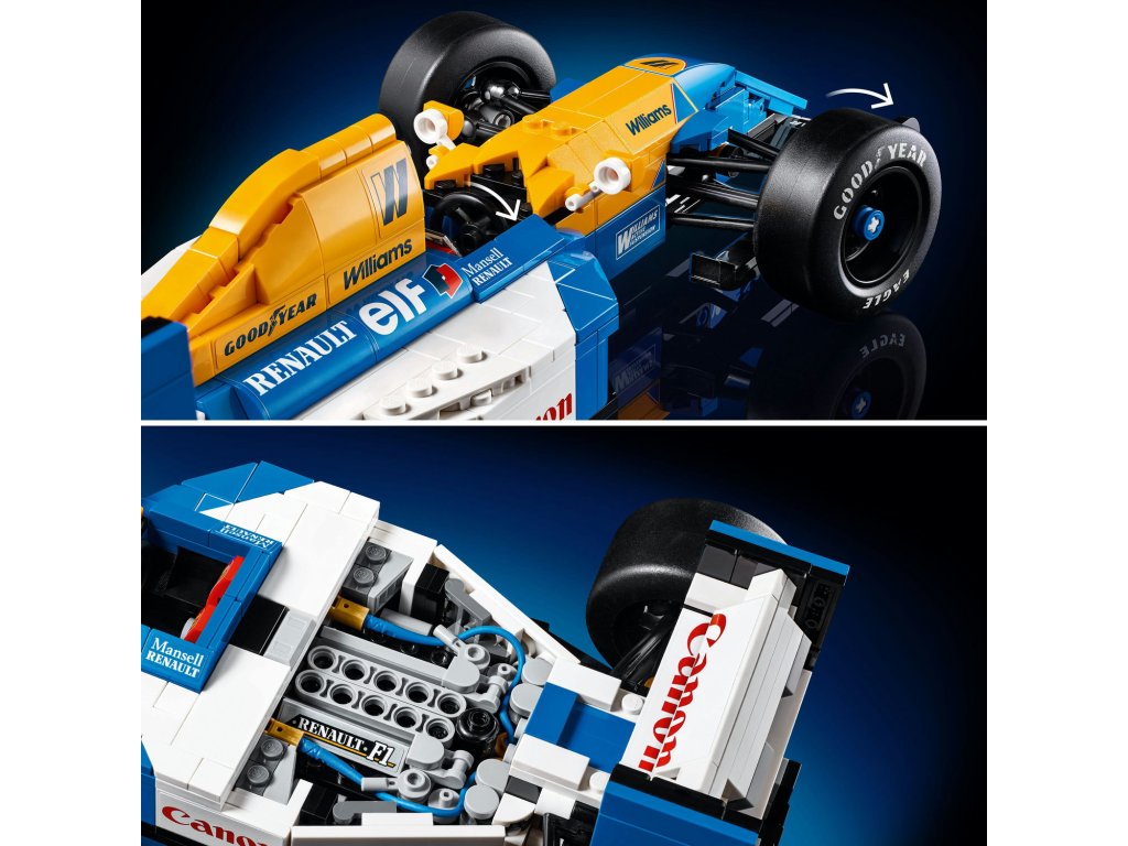 Model LEGO Icons Williams FW14B má funkční řízení, široké zadní hladké pneumatiky s tištěným nápisem Goodyear, detailně zpracovaný motor a podstavec na vystavení s podrobnostmi o vozidle a statistikami. Minifigurka Nigela Mansella má helmu a podstavec ve stylu pódia s fotografií a citátem tohoto legendárního jezdce.