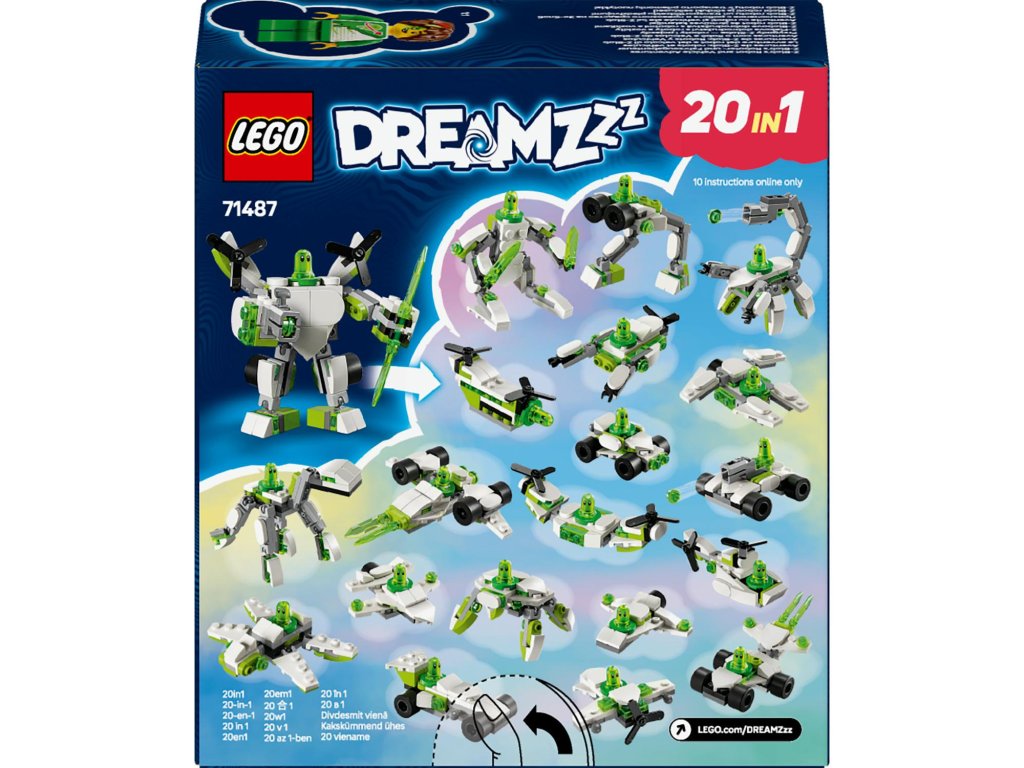 Nastartujte dětskou fantazií se stavebnicí LEGO® DREAMZzz™ (71487) Z-Flekova dobrodružství s roboty a vozidly pro kluky a holky od 7 let, která jim nabízí 20 úžasných způsobů stavění parádních robotů a vozidel. Hlavním modelem v této stavebnici jerobot Z-Flek. Malí snílci si užijí stavění a pak objeví 19 úžasných možností, jak ho přestavit. Mezi některé z jiných robotů a vozidel patří vrtulník, závodní auto, robot, turbo tryskáč a škorpion. Modely obsahují úžasné detaily, jako jsou pohyblivé no hy, ruce, chodidla a křídla, otočné vrtule a vystřelovač. Součástí stavebnice je také minifigurka Matea, která rozproudí kreativní hraní. Tento skvělý dárek pro děti a fanoušky televizního seriálu LEGO DREAMZzz s robotem a vozidlem obsahuje návod na stavění vedený příběhem. Malí snílci se ponoří do napínavých dobrodružství plných akce s Mateem a Z-Flekem.
