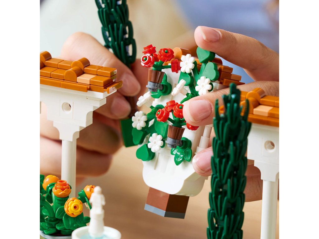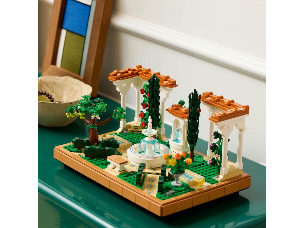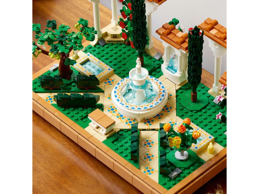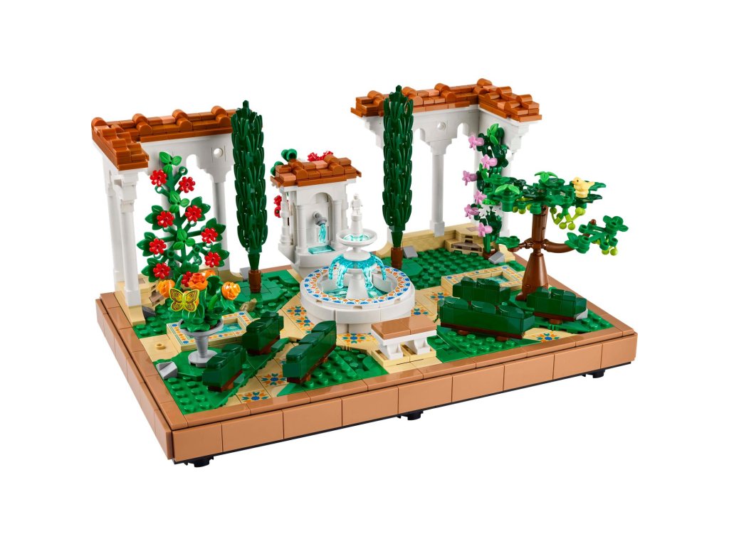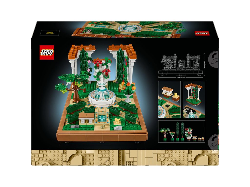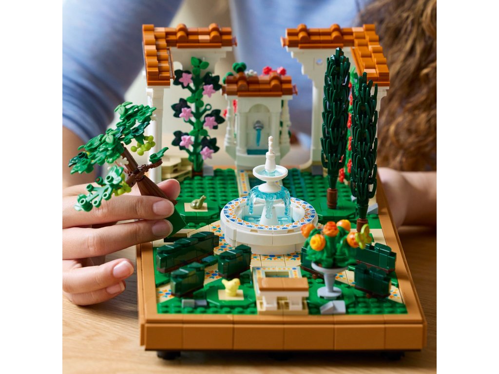 Vychutnejte si stavění propracované stavebnice LEGO® Icons (10359) Zahrada s fontánou pro dospělé, která se skvěle hodí domů i do kanceláře. Odpočiňte si při skládání složitých detailů a uspořádejte stromy, květiny, pergoly i všechny 4 rohy zahrady, abyste dosáhli dokonalého vzhledu. Tento přírůstek do kolekce Zahrady světa byl inspirován krásou a rozmanitostí krajinářské architektury. Součástí je stupňovitá fontána, zdobené lavabo, dekorativní dlážděné chodníky a pergoly s bílými sloupy a červenou střešní krytinou. V zahradě najdete kvetoucí vinnou révu, 2 cypřiše, červený kakost, bílé petúnie, červený ibišek, růžové bugenviley a afrikány a figurku ptáka, žáby a můry. Užijte si chvíle odpočinku s širokou řadou stavebnic LEGO pro dospělé(prodávají se samostatně). Aplikace LEGO Builder obsahuje 3D digitální verzi návodu na stavění, který je součástí této sběratelské stavebnice zahrady z kostek LEGO.