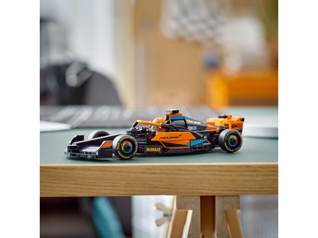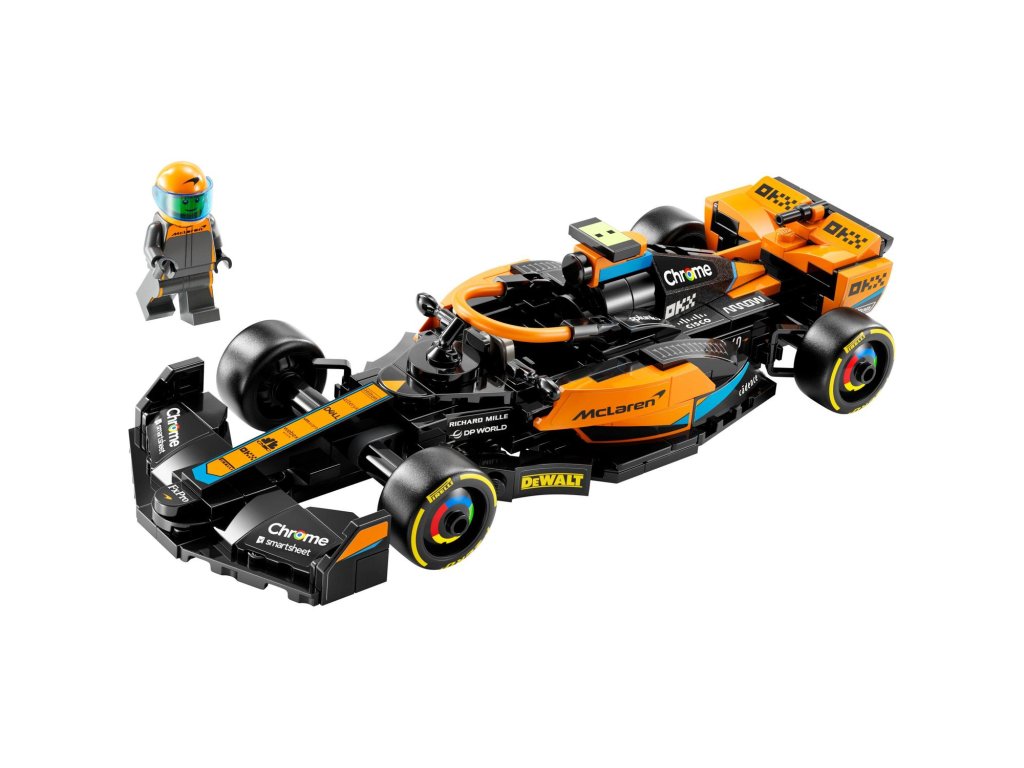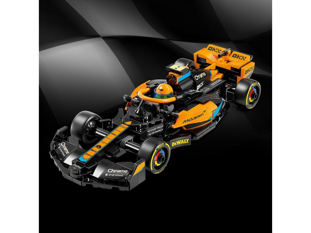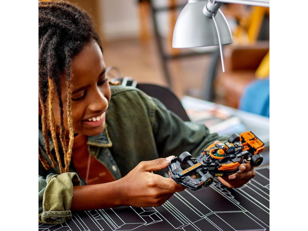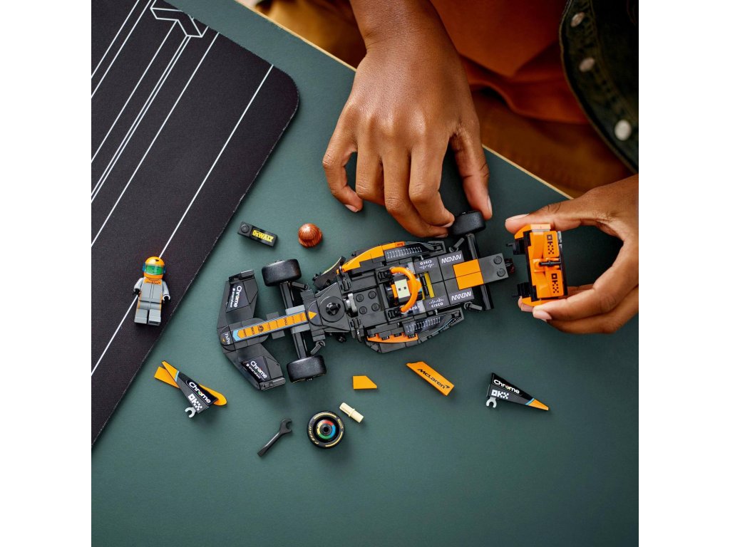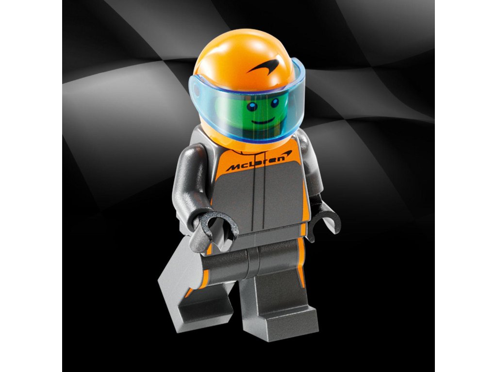 Model vozu McLaren se pyšní realistickými detaily: Papájovo-černým barevným provedením, logy sponzorů týmu, koly s potisky Pirelli a papájovou svatozáří. Součástí je také minifigurka řidiče, kterou děti usadí za volant a pustí se s ní do akčního závodění.