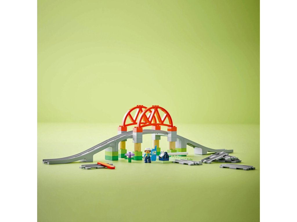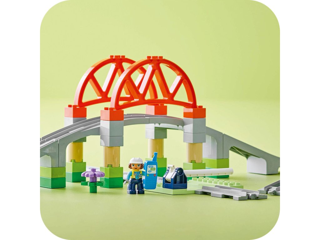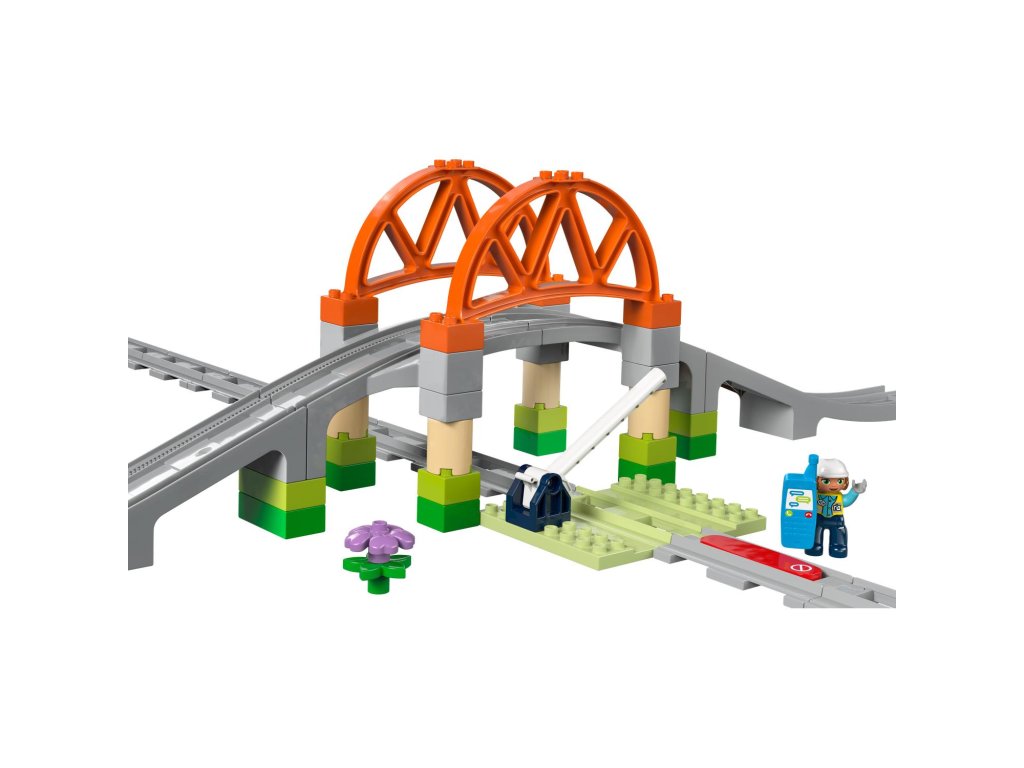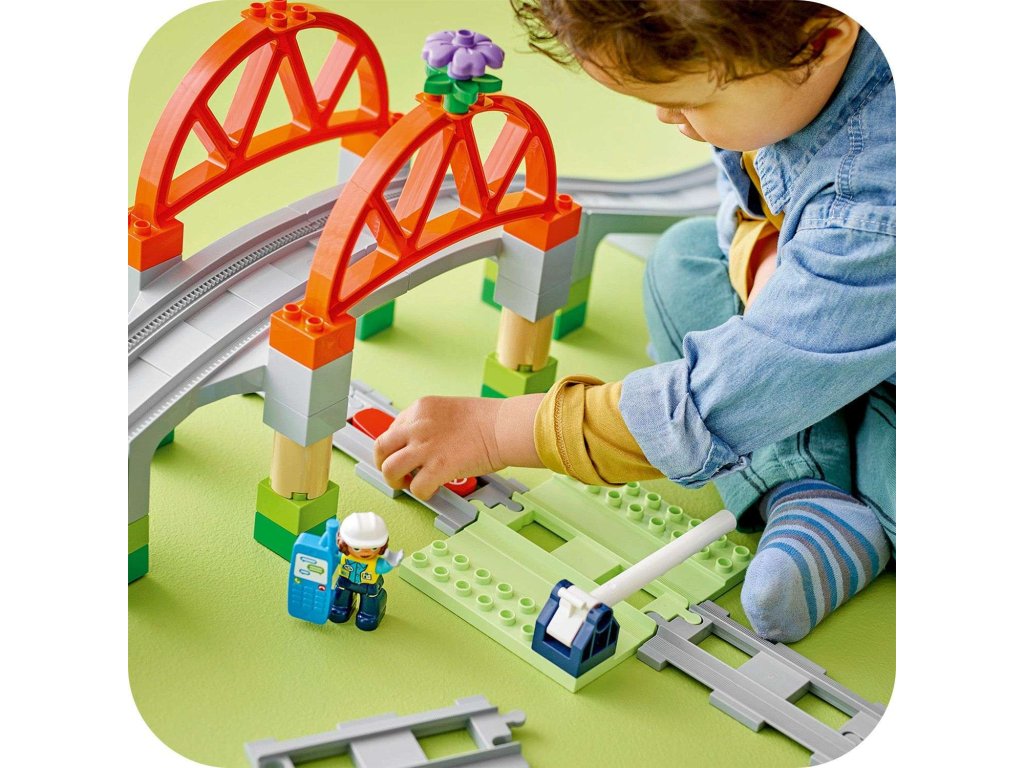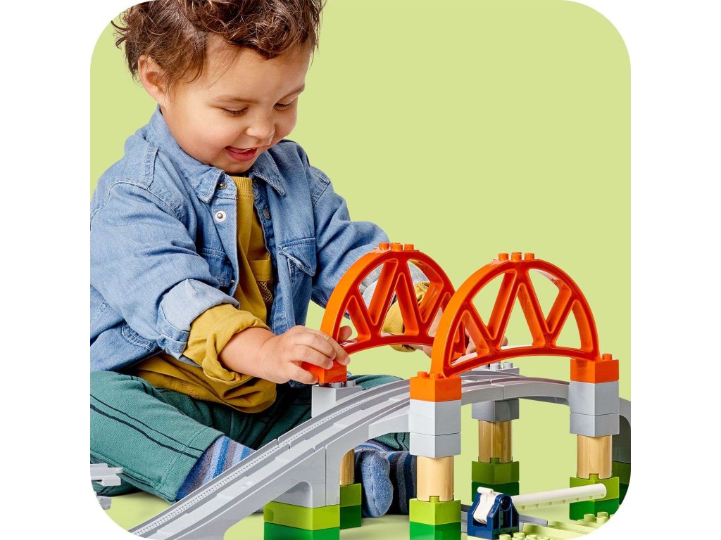 Posuňte hraní vaší ratolesti s vláčky na vyšší úroveň díky rozšiřující sadě Železniční most a koleje (10426). Tato kreativní hračka na stavění a přestavování malým dětem umožňuje ke svým interaktivním stavebnicím LEGO® DUPLO® Město s vláčky (10427a 10428, prodávají se samostatně) přidat vyvýšený most a prodloužit trasu 8 rovnými dílky kolejí, které jsou kompatibilní se všemi stavebnicemi LEGO DUPLO s vláčky. Součástí je také sestavitelný model mostu a zdvihací závora. Děti od 2 let si užijí spo ustu zábavy při hře na inženýra, který pouští vlak, a zároveň procvičí své jemné motorické schopnosti. Díky akční kostce se interaktivní vláčky ze stavebnic 10427 a 10428 zastaví v její blízkosti a při příjezdu k ní vydají zábavné zvuky. Tato vzdělávací stavebnice podporuje rozvoj malých dětí. Rozšířením kolejí přidáním mostu si děti procvičí prostorové vnímání. Při kombinování kolejí se děti budou rozhodovat, kterým směrem vláček pojede, čímž prohloubí svou schopnost předvídání, trpělivost a soustředění.