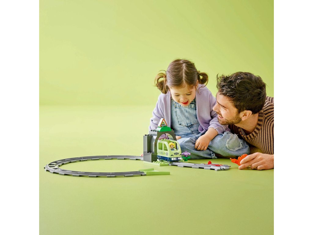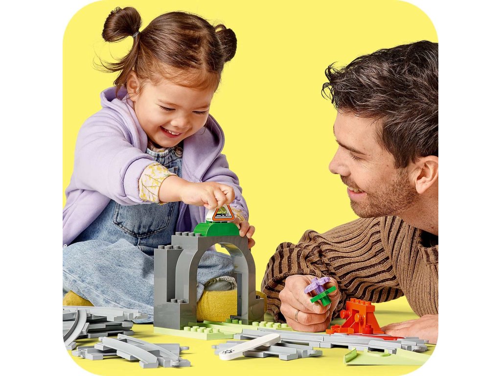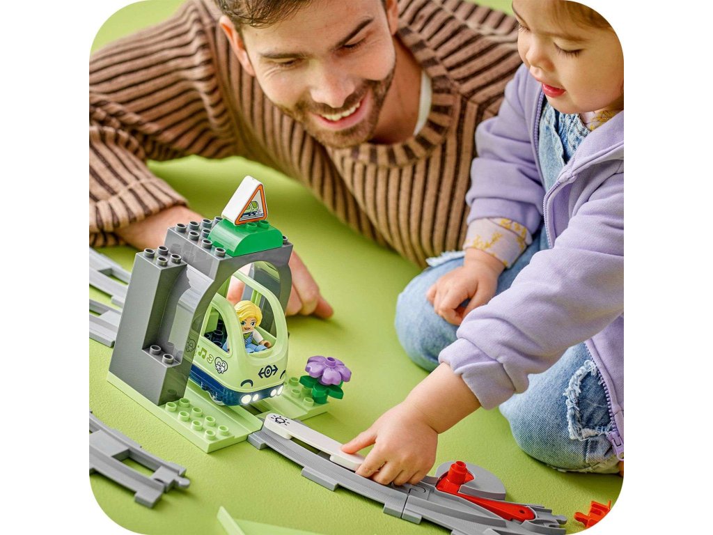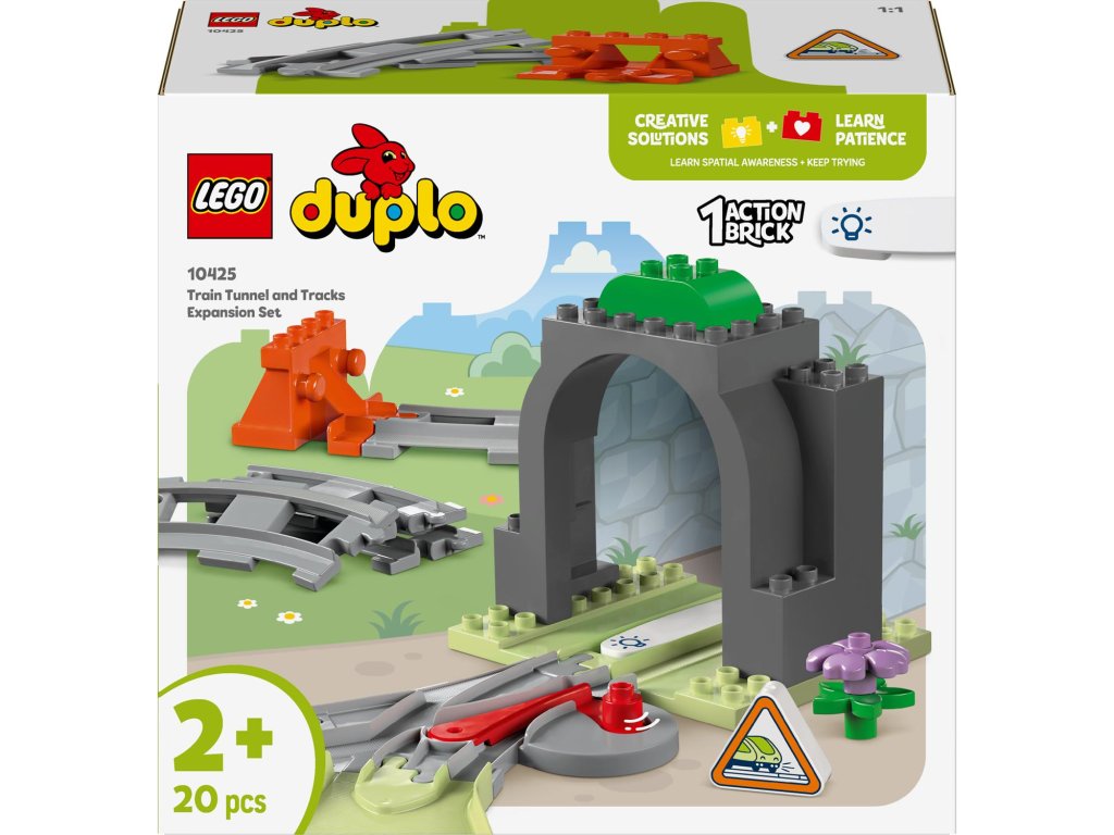Dopřejte malým dětem ještě více dobrodružství se sadou Železniční tunel a koleje – rozšiřující sada (10425). Malé stavitele od 2 let čeká úchvatná cesta za poznáním díky tunelu a novým kolejnicím, které zkombinují se svými interaktivními stavebnicemi LEGO® DUPLO® Město (10427 a 10428, prodávají se samostatně). Součástí této kreativní stavebnice je model tunelu, 10 dílků kolejnice, komín a dvojitá výhybka, pomocí které děti mohou změnit směr jízdy vláčku. Akční kostka rozsvítí tmavý tunel, když ji aktivuje interaktivní vláček ze stavebnic 10427 a 10428. Tato stavebnice povzbuzuje rozvoj malých dětí. Prodloužením kolejí skrz tunel se děti učí orientovat v prostoru. Procvičí si také schopnost řešení problémů a schopnost předvídání při určování destinace vlaku. Prohloubí také svou trpělivost a schopnost soustředění při vymýšlení dalších tras vláčku.