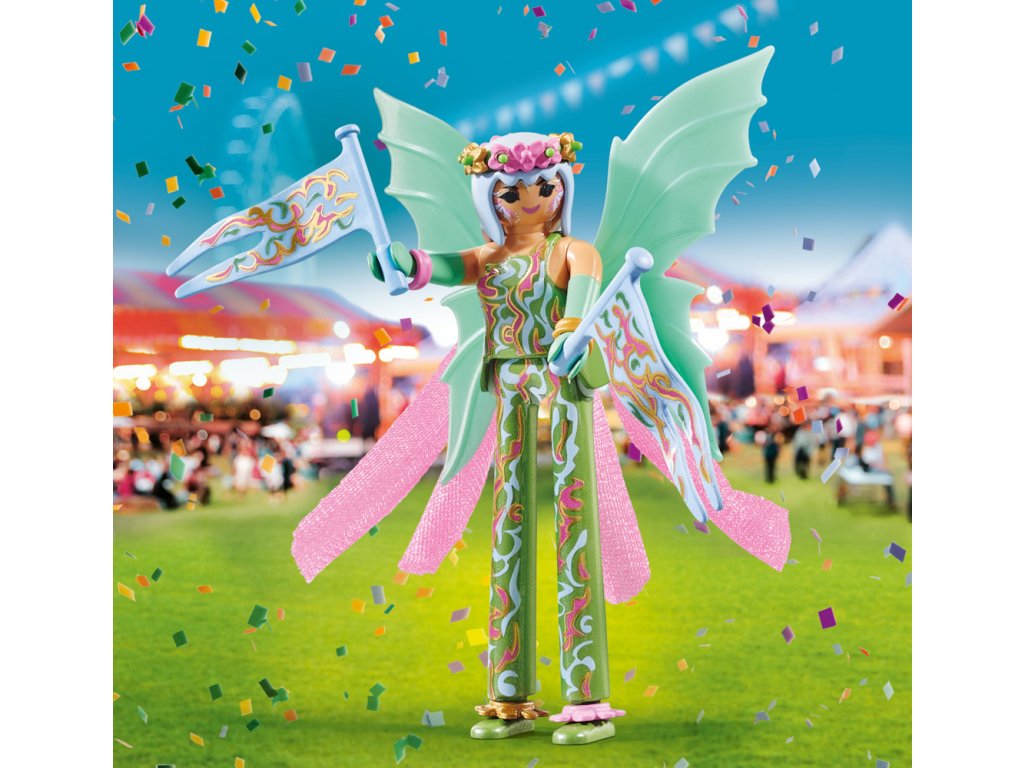 Na hudebním festivalu vystupuje umělkyně na chůdách v kostýmu víly. Víla s křídly a praporky. Rozměry: 12 x 9,3 x 3,8 cm. Věk: 4+