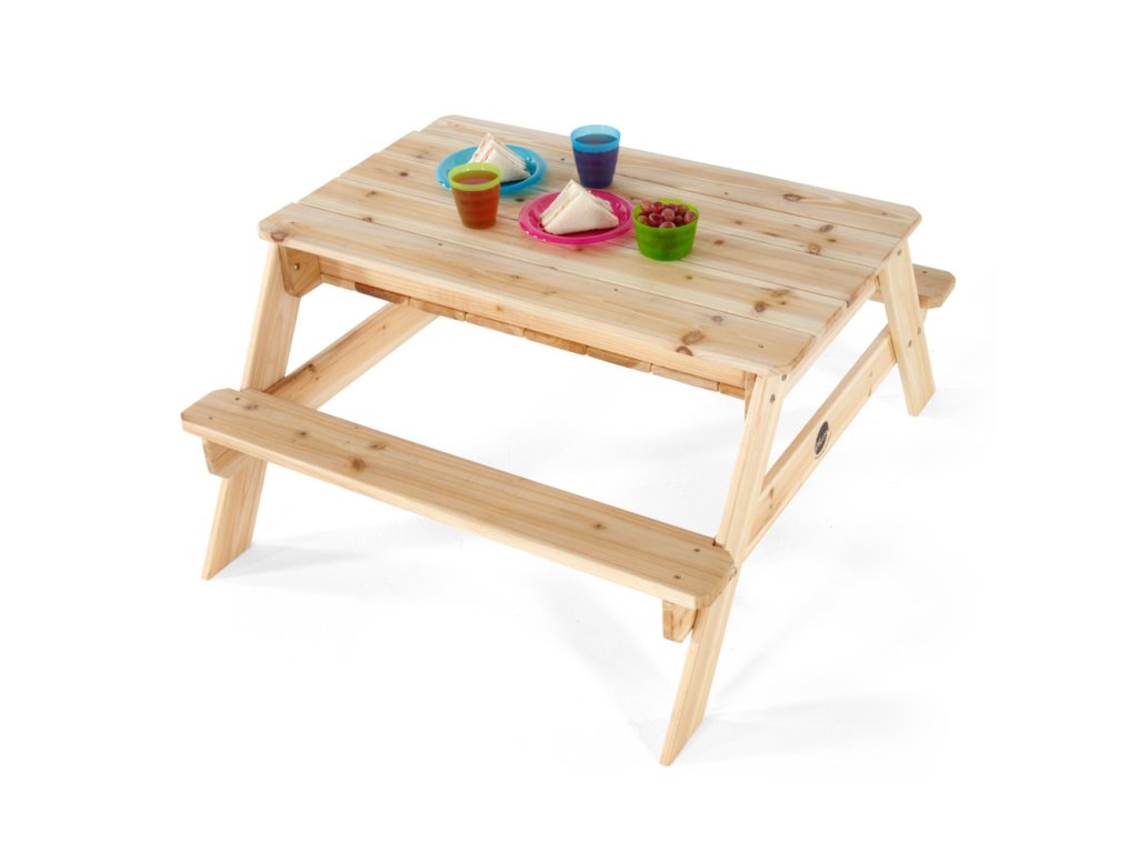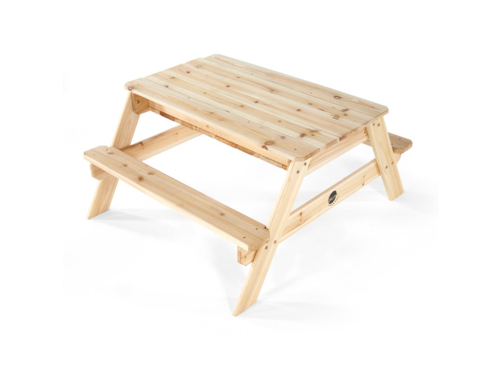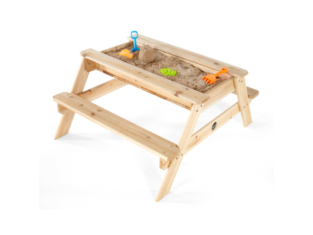 Dřevěný piknikový stůl 2v1 je prostorově úsporný stůl vhodný pro venkovní použití. Sundáním vrchní desky, která slouží k psaní a kreslení, vznikne plocha pro hru s pískem. Dřevěný piknikový stůl s lavičkami a pískovištěm je vyroben z robustního dřeva čínské jedle s certifikátem FSC. Dřevo je ošetřeno před povětrnostními vlivy. Písek není součástí balení. K naplnění pískoviště je potřeba cca 30 kg písku. Pokud pískoviště nepoužíváte, vždy jej zakryjte Pravidelně kontrolujte písek, zda neobsahuje nečistoty a ostré předměty. .aximální nosnost: 50 kg. Rozměr balení: 100 x 34 x 15 cm. Rozměr sestaveného stolku cca L105 x Š89 x V49cm. Věk: 18m+