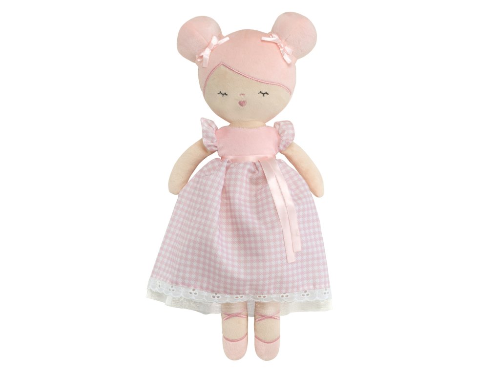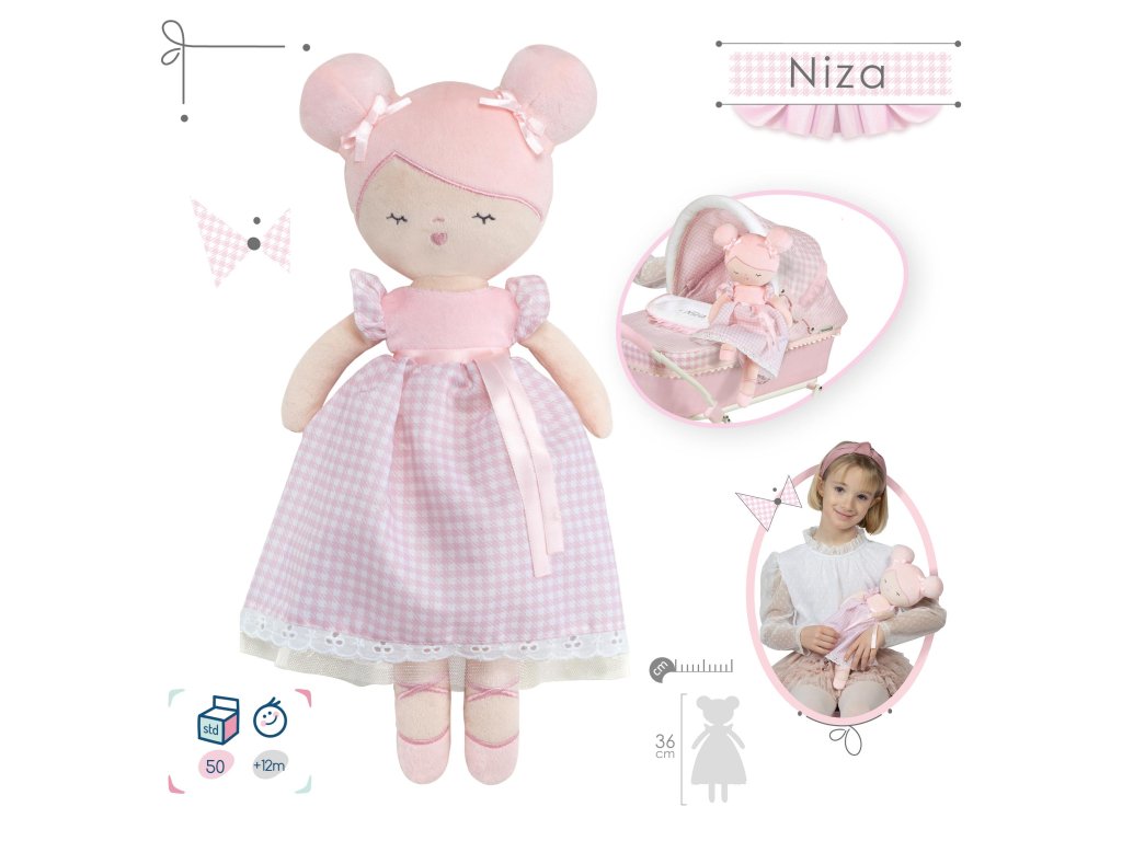 DeCuevas 20146 Plyšová panenka NIZA - 36 cmPlyšová panenka NIZA je malá baletka, patřící do stejnojmenné něžně růžové kolekce, která je novinkou roku 2022 a nabízí kromě různých druhů kočárků i nábytek pro panenky a malé parádnice. Charakteristická je pro ni jednobarevná růžová v kombinaci s růžovobílou drobnější kostičkou. Panenka je vyrobena z vysoce kvalitního hladkého lesklého plyše a je pratelná (ručně na 30 °C). Díky své velikosti a lehoučké váze je ideální společnicí každé malé holčičky nejenom na cestách, ale díky měkkému materiálu je příjemná i na mazlení do postýlky. Panenka je balena v igelitovém obalu. Velikost 36 cm. Doporučený věk 12m +.Doplňující informace:• Nádherný španělský design• Materiál: plyš, polyester, duté vlákno• Pratelná ručně na 30 °C• Rozměry samotné panenky: 15 x 8 x 36 cm (š x d x v)• Baleno v ochranném igelitovém obalu • Rozměry balení 15 x 8 x 36 cm (š x d x v)• Váha balení: 0,12 kg• Doporučený věk od 12 měsíců