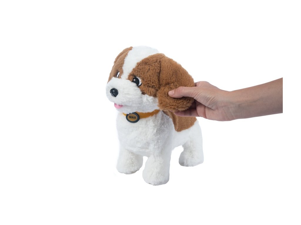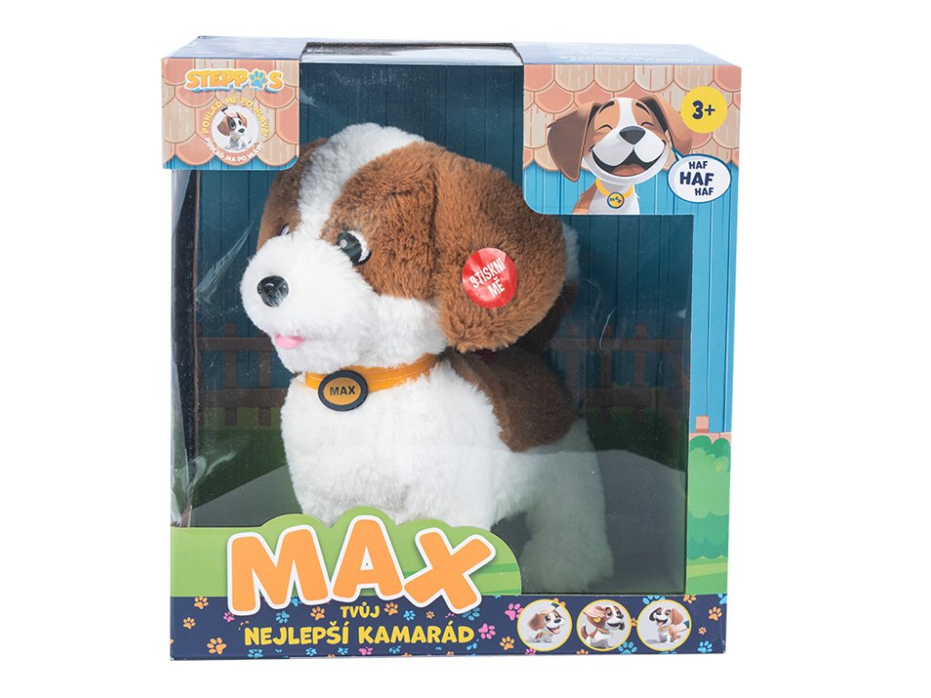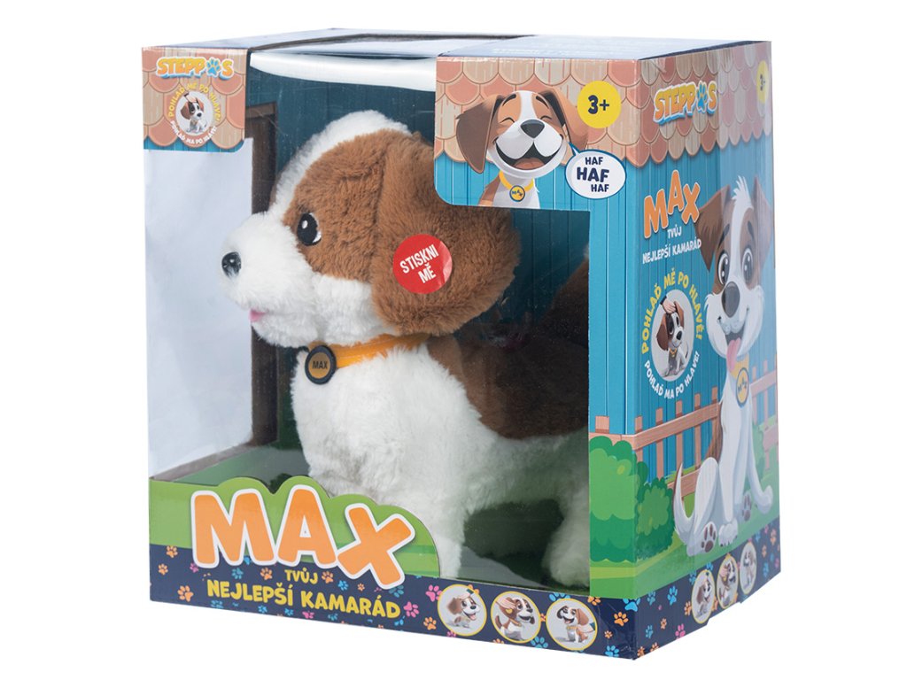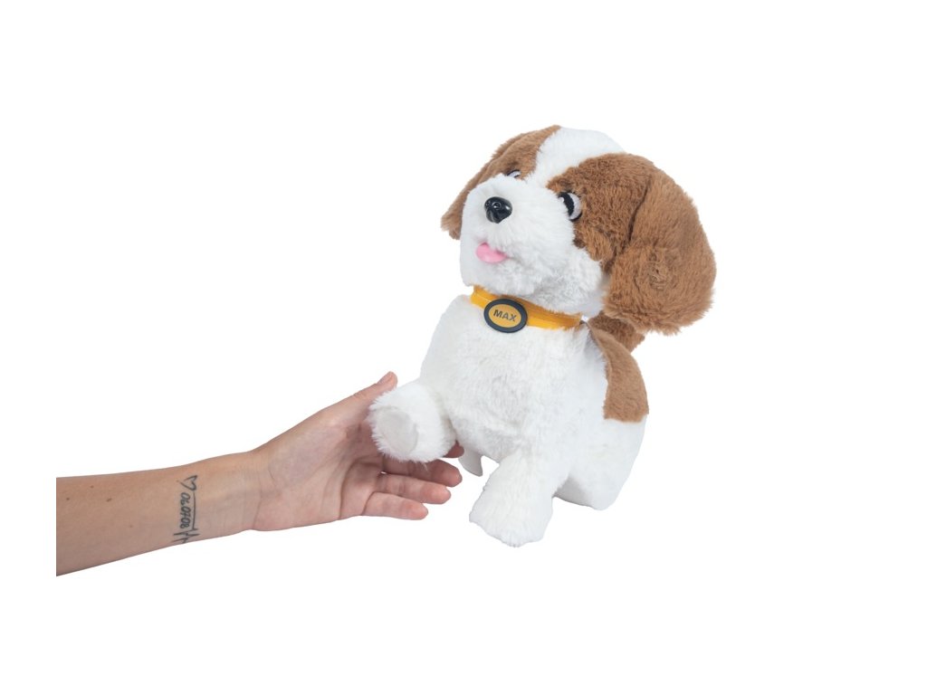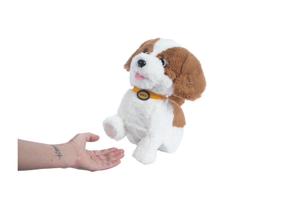 Interaktivní pejsek Max umí si sednout, chodit, zvedat pacičku, vystrkovat jazýček, štěkat… Reaguje na dotek.