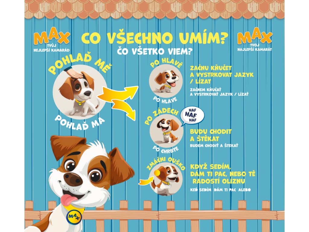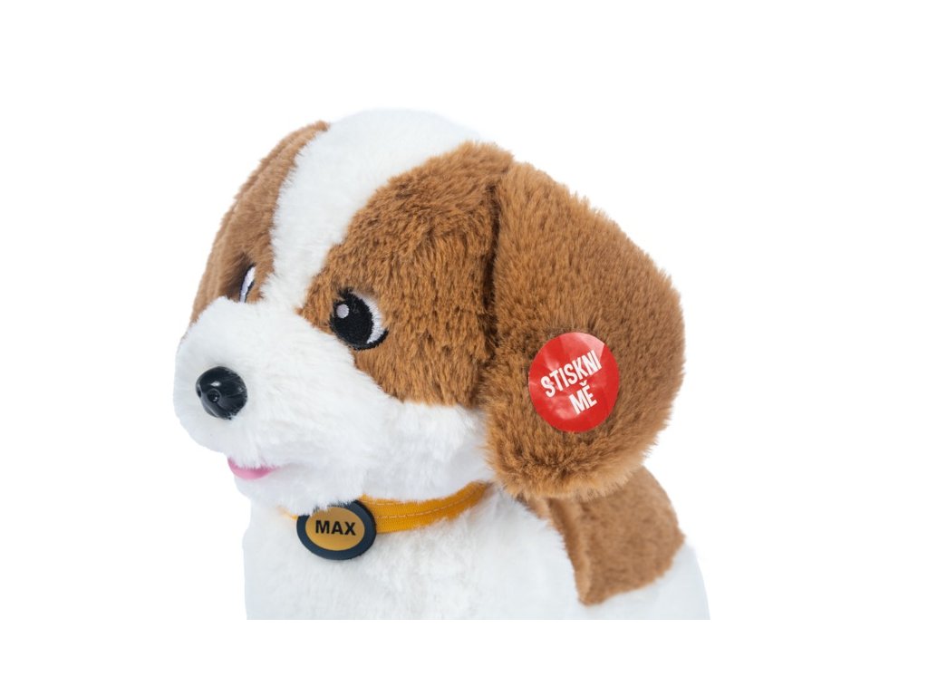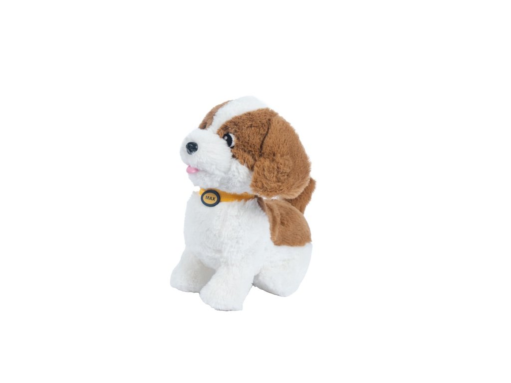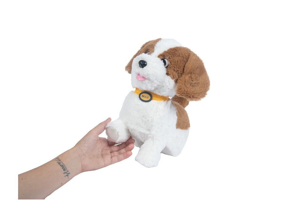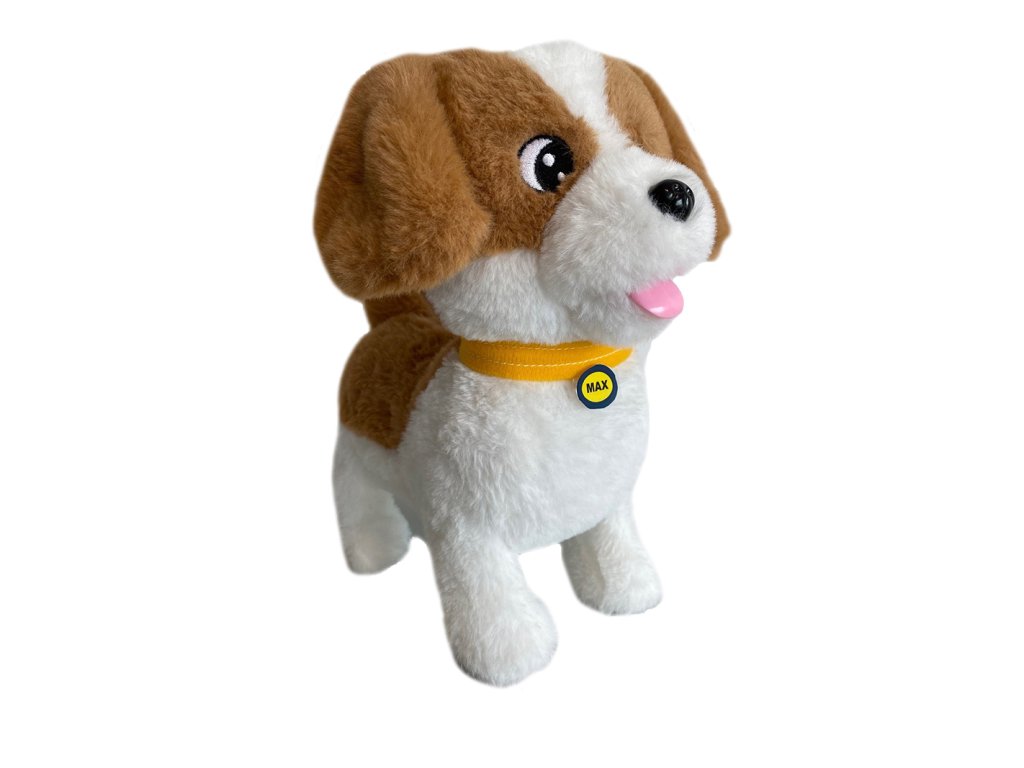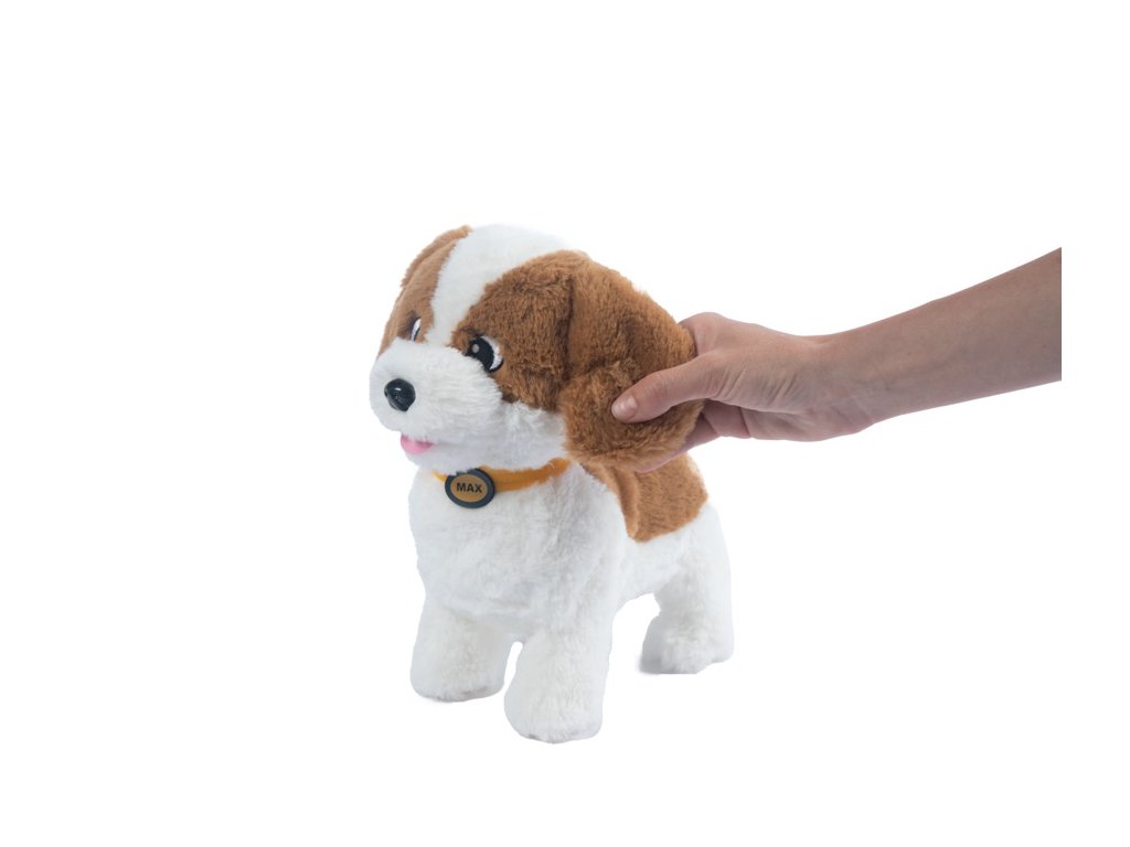 Interaktivní pejsek Max umí si sednout, chodit, zvedat pacičku, vystrkovat jazýček, štěkat… Reaguje na dotek.