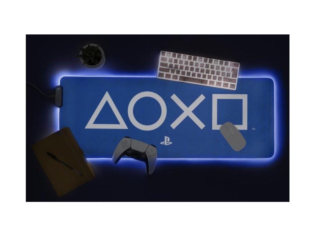 Praktická rolovací herní podložka na stůl, vyvedená s grafikou Playstation tlačítek. Zvyšte úroveň svého herního nastavení s touto podložkou PlayStation. Vnější strana této modré LED podložky na stůl se po zapnutí rozsvítí. Vyberte si ze dvou barevných režimů - modrá nebo bílá záře. Zdobí jej okamžitě rozpoznatelné ikony ovladače. Tato podložka o rozměrech 80 cm (31") x 30 cm (11") je dostatečně velká, aby se vešla pod plnohodnotnou klávesnici a myš pro větší pohodlí při hraní nebo práci.
