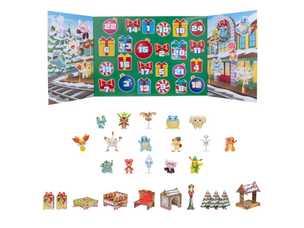 Adventní kalendář s překvapením na 24 dnů! Perníková chaloupka jako tematický displej! Obsahuje 15 ks 6 cm vysokých figurek pokemonů. 1 x NOVÁ 6 cm figurka s vánočním motivem a se speciální povrchovou úpravou! 8 ks vánočních dopňků
