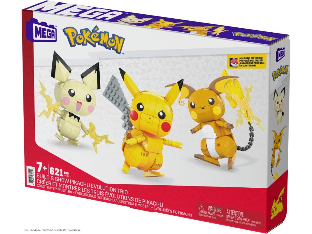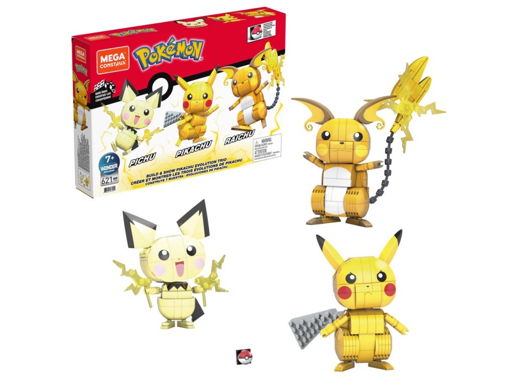 Stavebnice MEGA™ Construx Postav a vystav si Pikachu a jeho vývojové trio obsahuje kompletní evoluce Pichu, včetně Pikachu a Raichu, z nichž každý má kloubové končetiny a je vybaven vlastní speciální silou. Speciální dílky, které zapadají do Pichuových rukou, představují elektrickou sílu, zatímco Pikachu a Raichu jsou vybaveni vlastními mocnými pohyby.