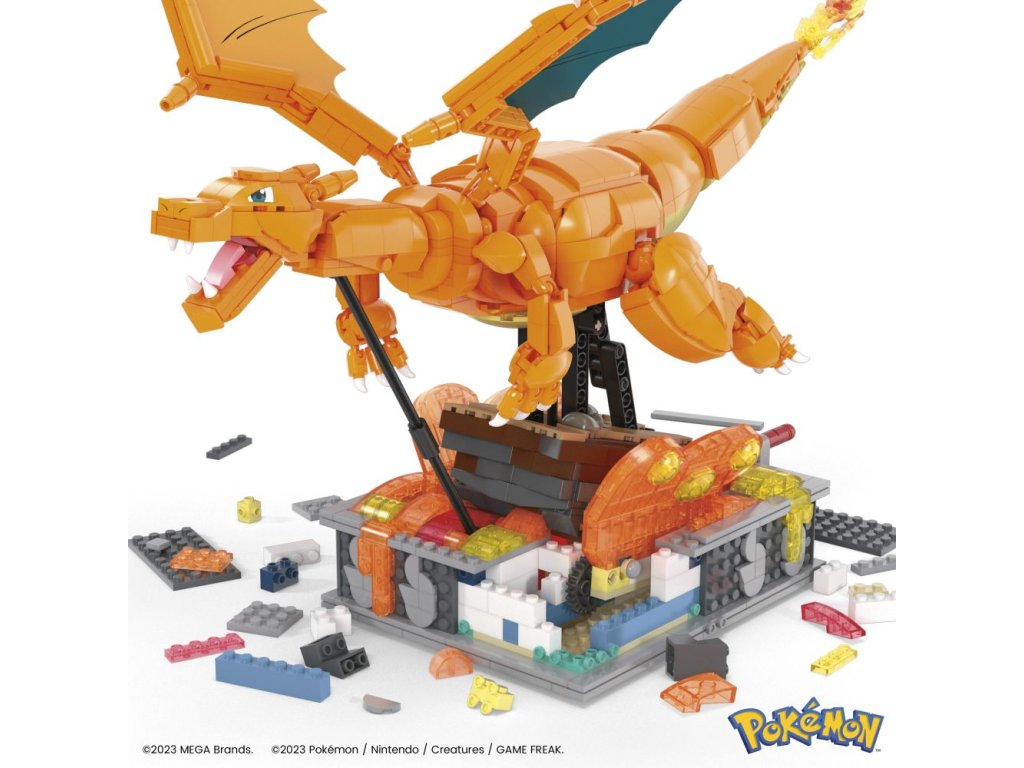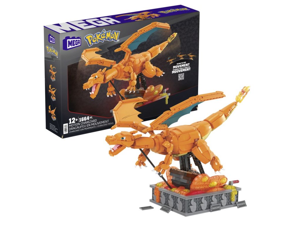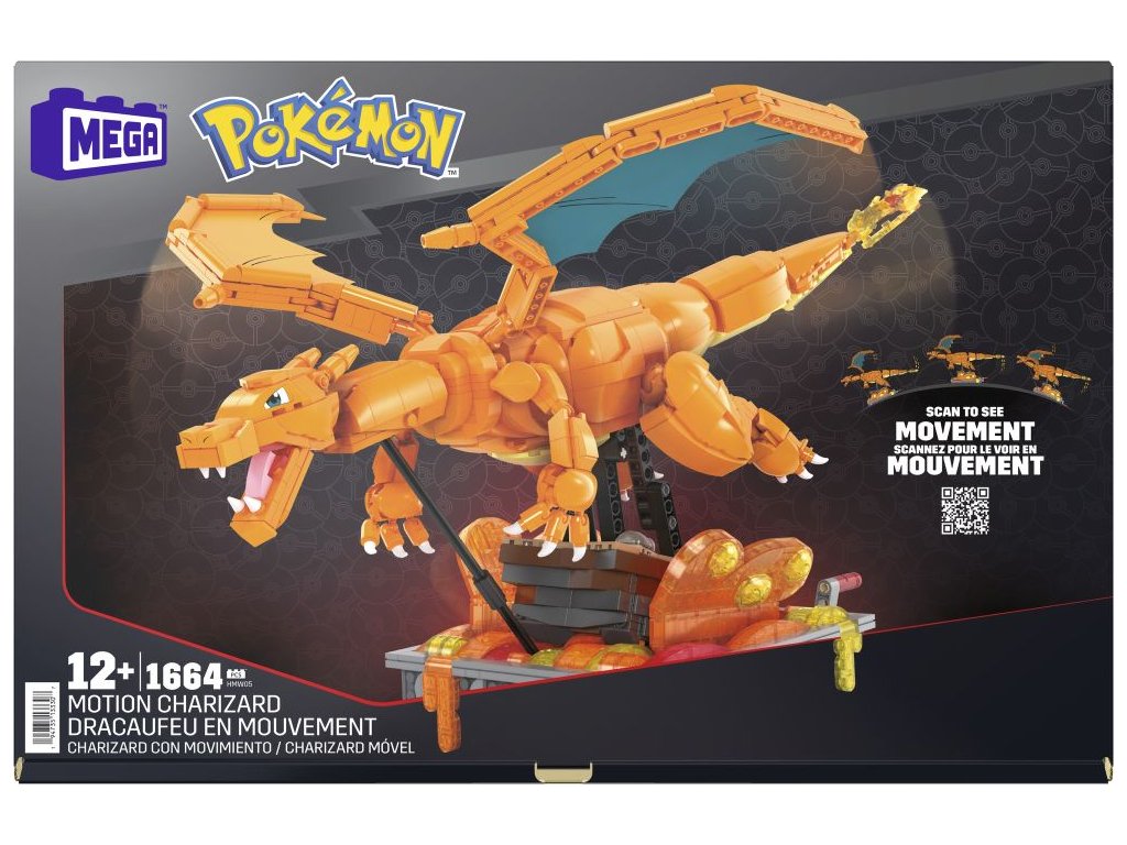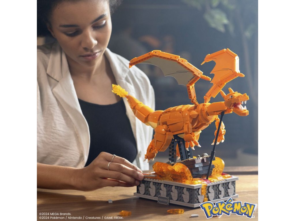 Pociťte žár s touto velmi detailně propracovanou a snadno pózovatelnou stavebnicí Charizard. Postavte model a otáčením kličky sledujte, jak se Charizard pohybuje sem a tam, jak se mu třepotají křídla a pohybuje láva. Do detailu propracovaná základna obsahuje vyměnitelné jmenovky v různých jazycích.