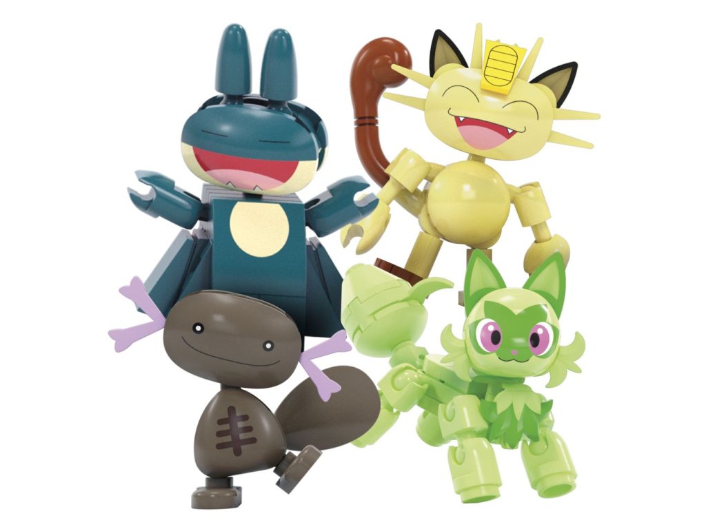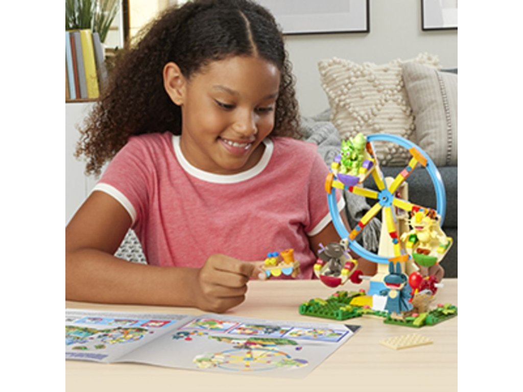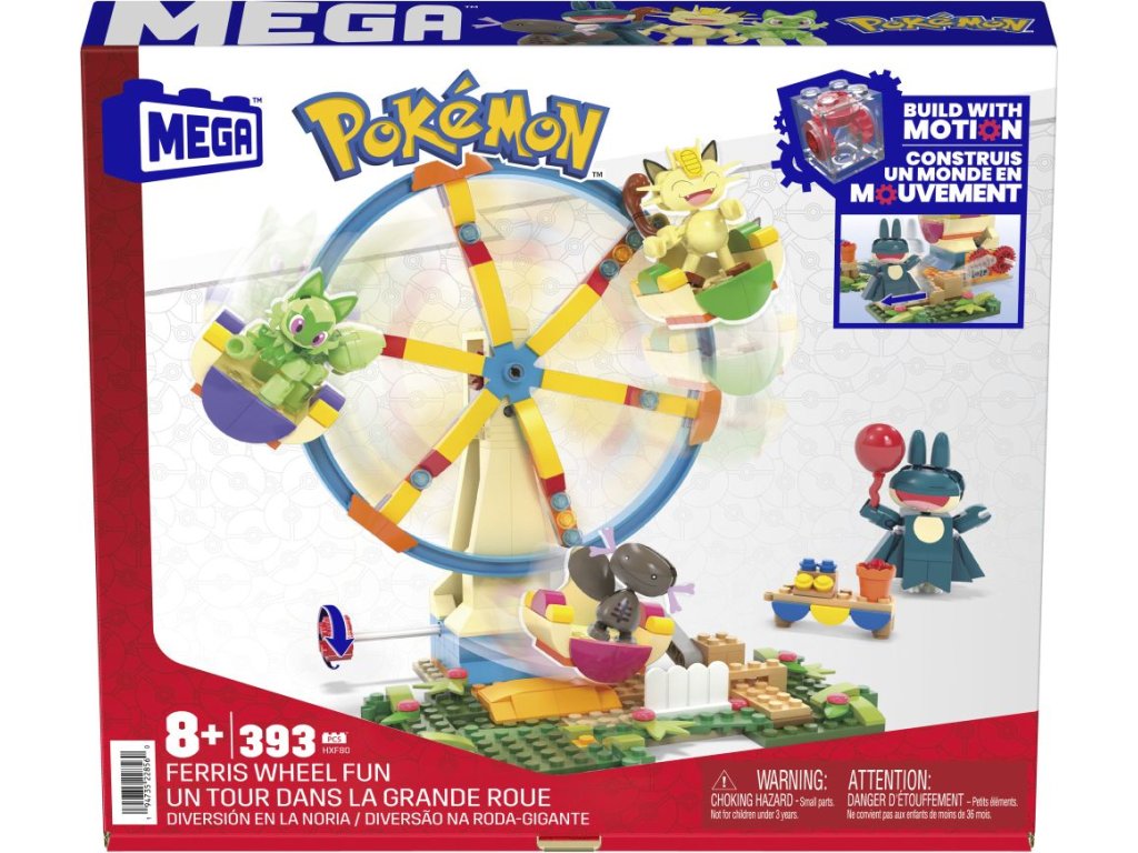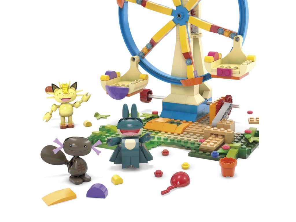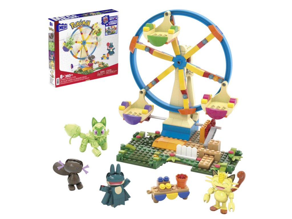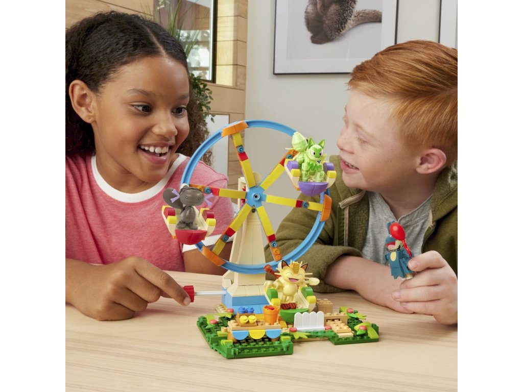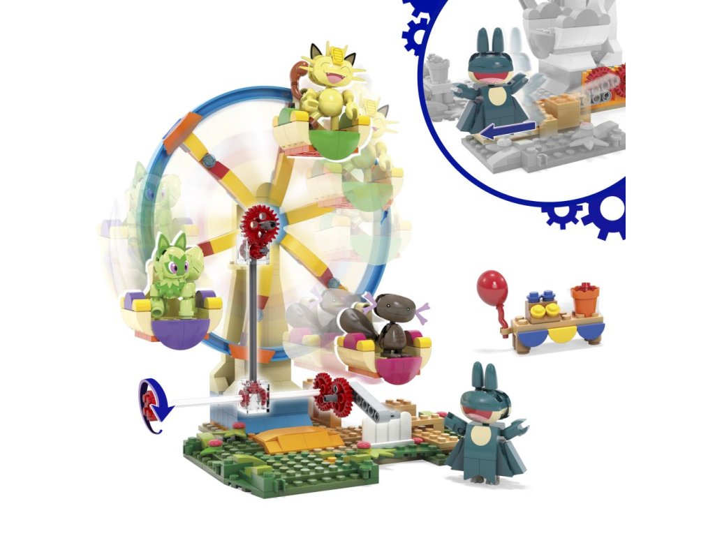 Vezměte svůj tým Pokémonů na projížďku se stavebnicí Zábavné ruské kolo. Umístěte Sprigatita, Meowtha, Paldeana Woopera a Munchlaxe do kola a pak otočte klikou, abyste aktivovali pohyb sestavy.